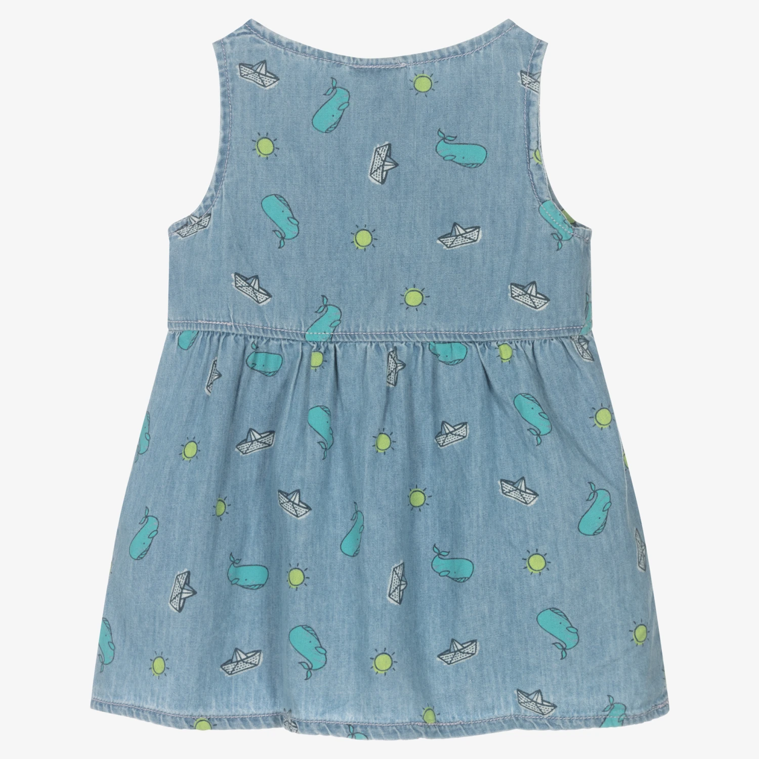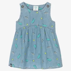 Blue chambray dress for baby girls by Boboli, made in a soft and lightweight cotton weave. A sleeveless design, it has an all-over nautical-inspired print featuring blue whales, sunshines and boats. It gathers gently at the waist and buttons on the shoulders for a comfortable fit. The dress comes with a pair of matching knickers with elasticated trims to cover a little one’s nappy.