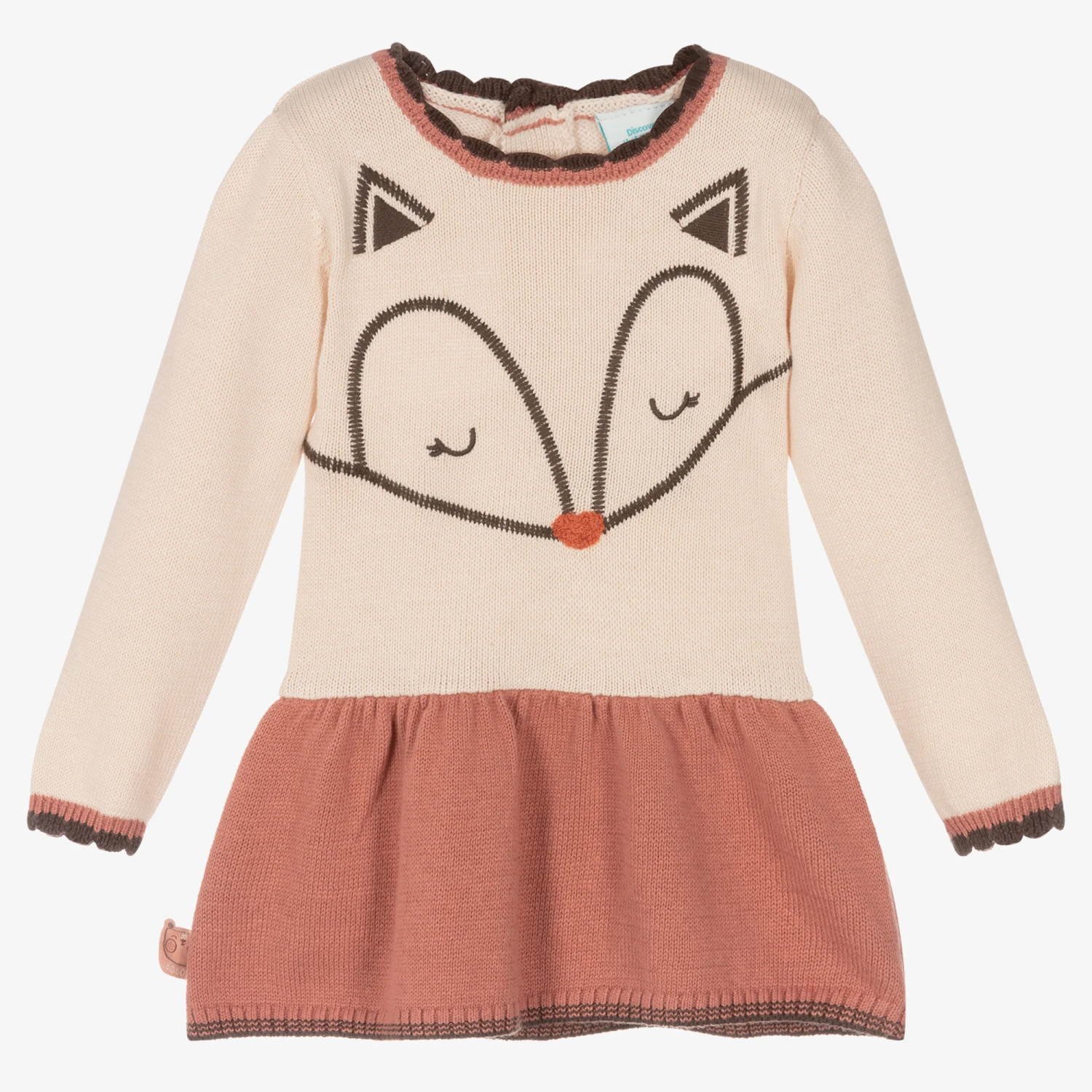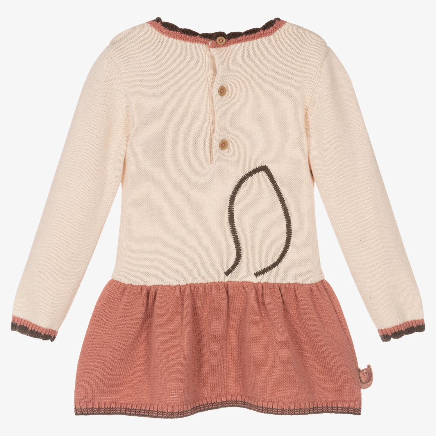 Baby girls knitted dress and tights set by Boboli, made in a lovely cotton, viscose and wool blend. It has a pretty, scallop trim neckline and cuffs and an adorable fox motif on the front. Soft and comfortable, it has button fastenings on the back so the dress can be easily pulled on over the head. The ivory tights have coordinating, frill trims to resemble socks, and small intarsia trees on the ankle.