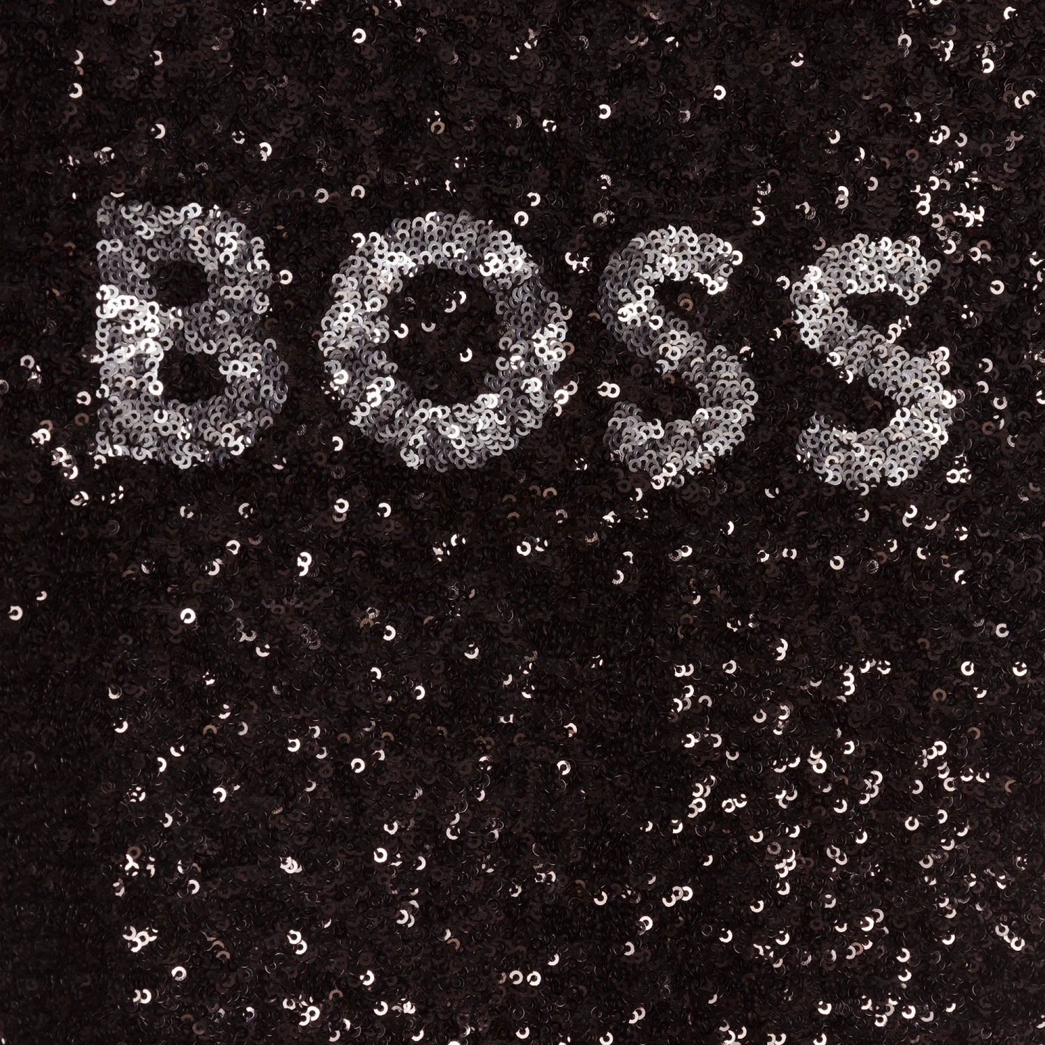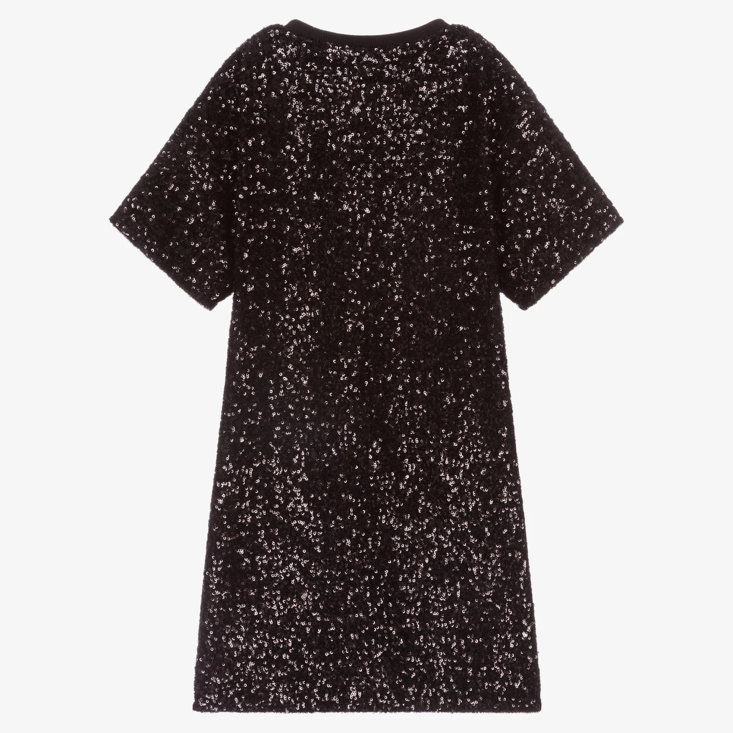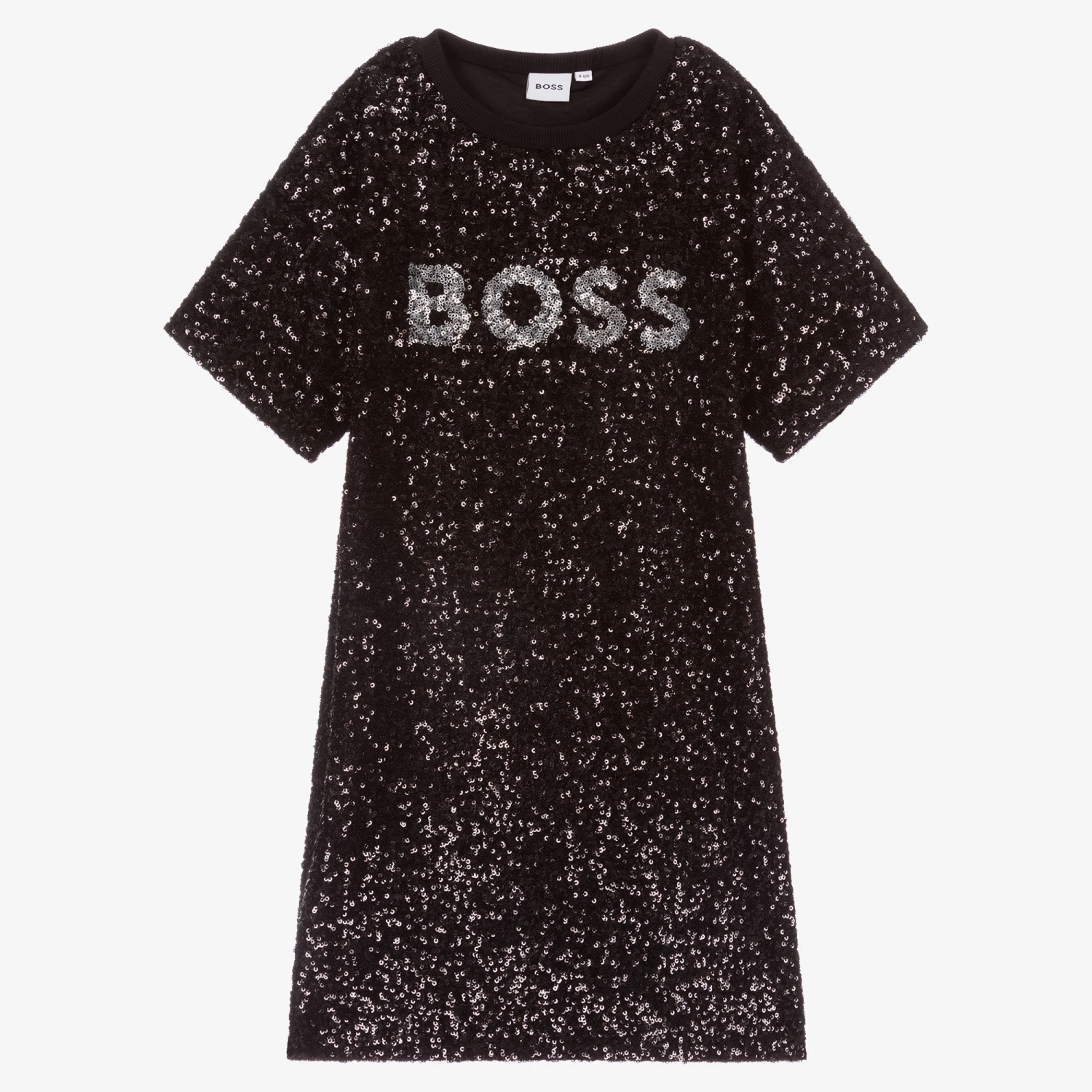 Shimmering black sequinned dress for teen girls by BOSS, with a silver sequin logo on the front. In a simple T-shirt style, it has a ribbed neckline and is lined in jersey for comfort.