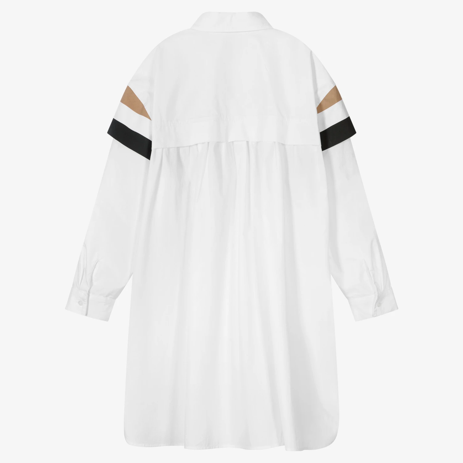 A stylish white shirt dress for teen girls by BOSS, with layered-look sleeves in a signature stripe. Designed for a relaxed fit, it has subtle logo embroidery on the front pocket and branded buttons on the front. Made in soft cotton poplin, it has a curved hem, a gathered back, and side seam vents for a casual look.