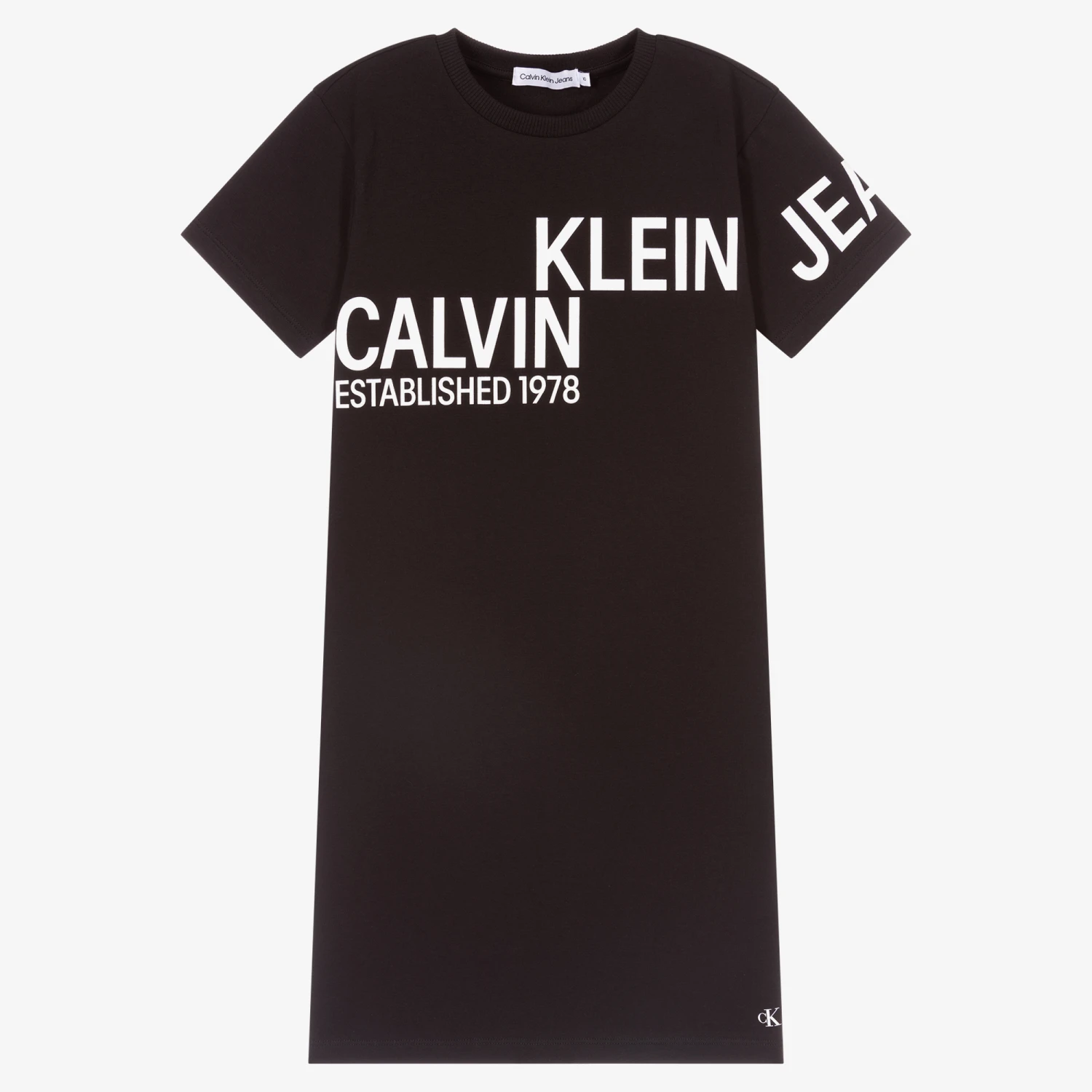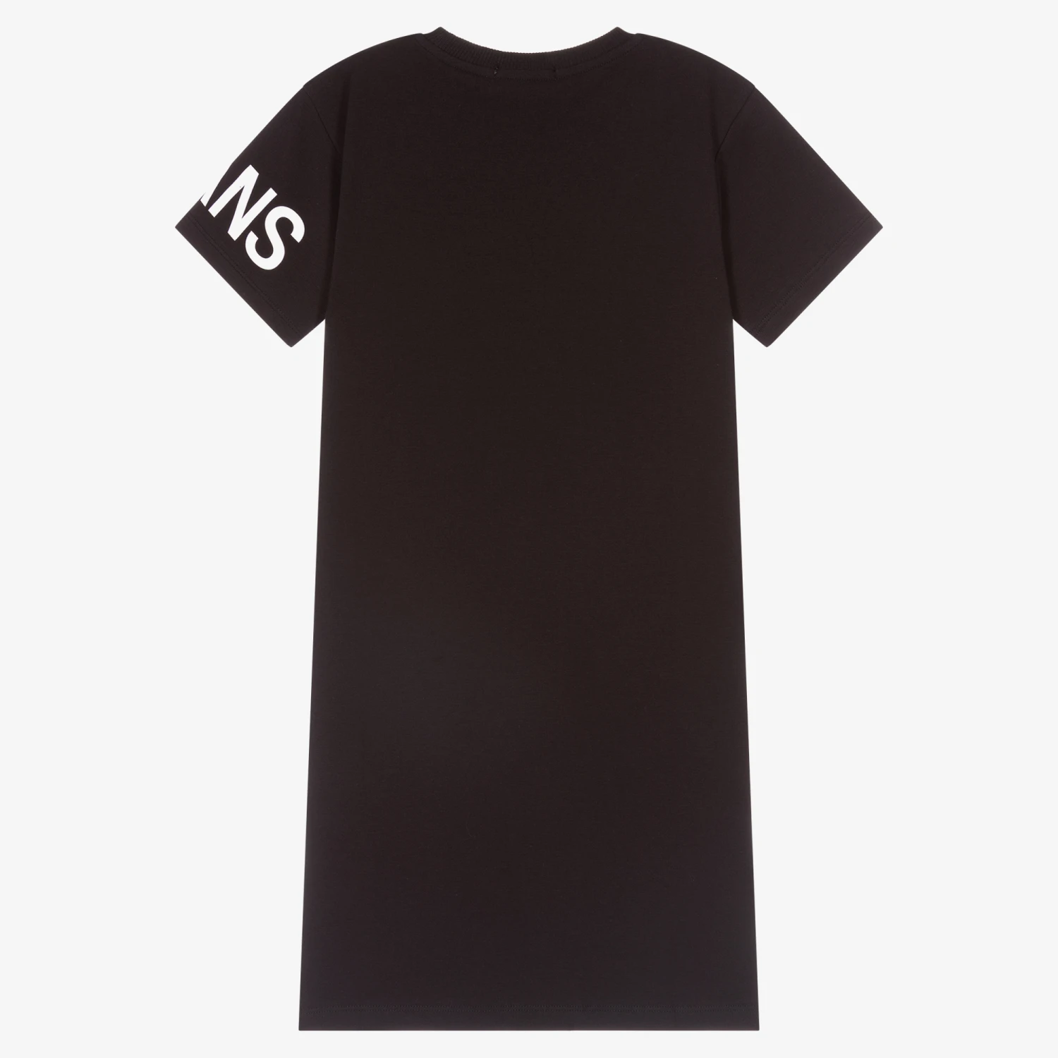 Black T-shirt dress for teen girls by American brand Calvin Klein Jeans, made in soft cotton jersey. This casual dress has the designer’s Hero logo on the front and one sleeve in white, with a Monogram logo by the hemline.
