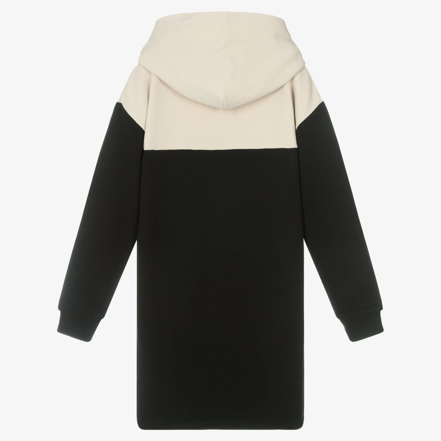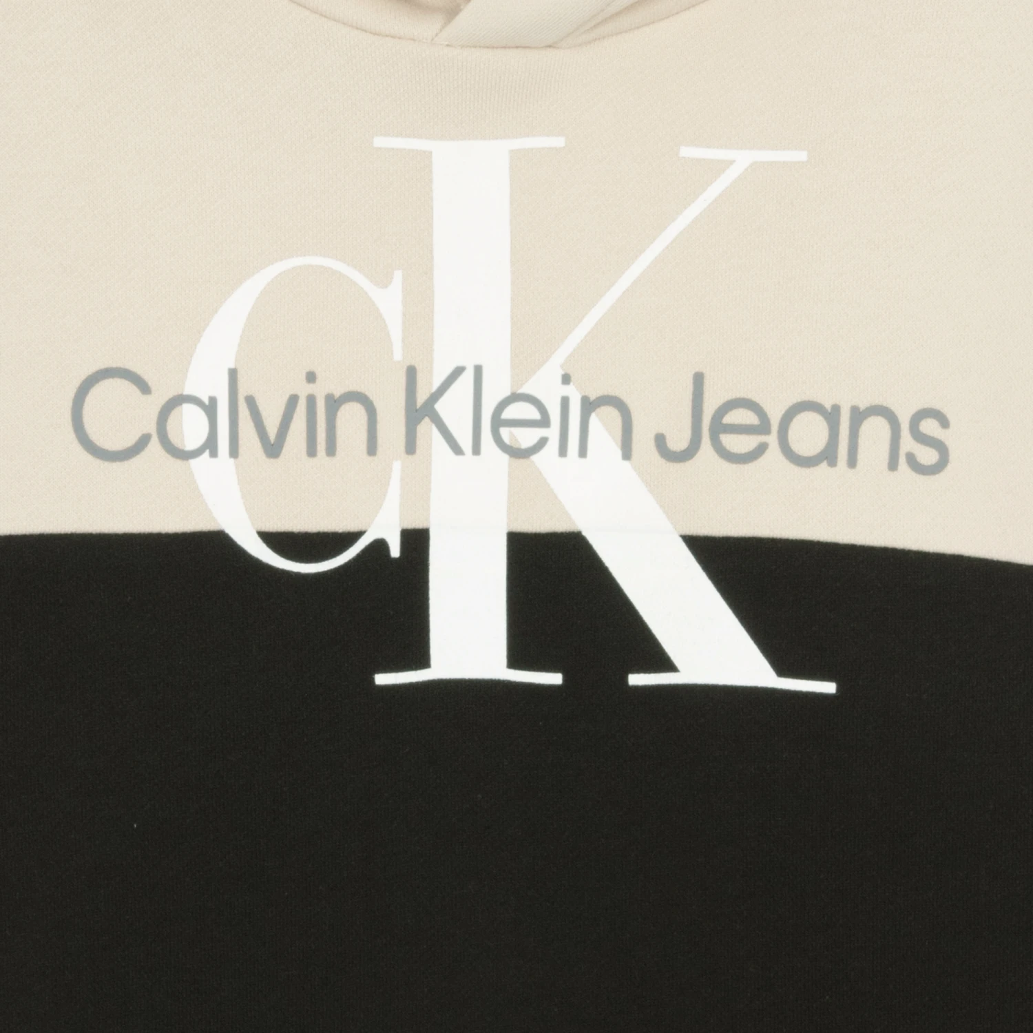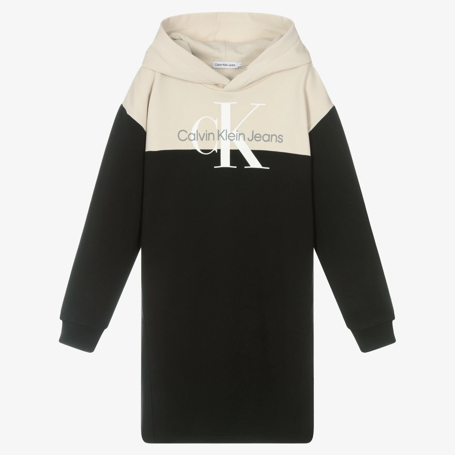 Teen girls beige and black hoodie dress from American brand Calvin Klein Jeans. This mid-weight cotton dress has a white and grey monogram logo print on the front, for a bold designer look.