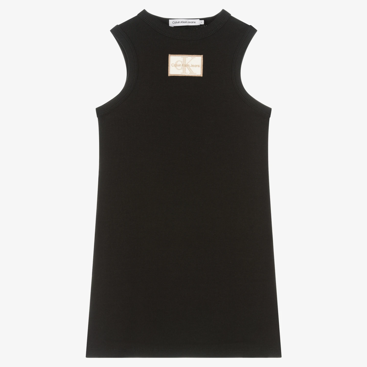 Teen girls can channel ’00s style in this black sleeveless dress from Calvin Klein Jeans. Great for warm weather, it is made in soft and stretchy ribbed cotton jersey, with a cool ivory and champagne gold monogram logo patch on the front.
