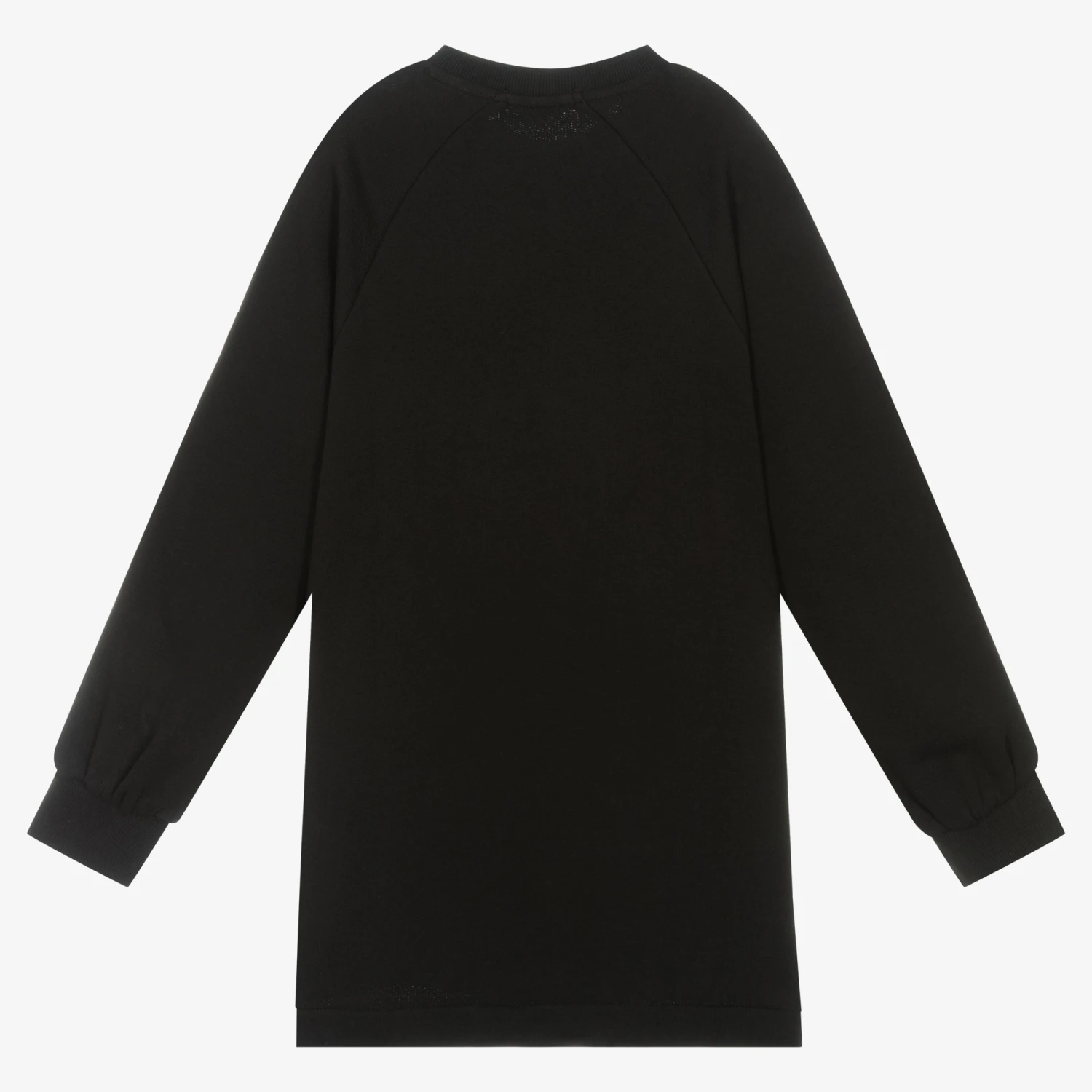 Combining comfort and style, a black sweatshirt dress for teen girls by Calvin Klein Jeans, made in mid-weight organic cotton jersey. This stepped hem design has a white and grey logo embroidered on the front.