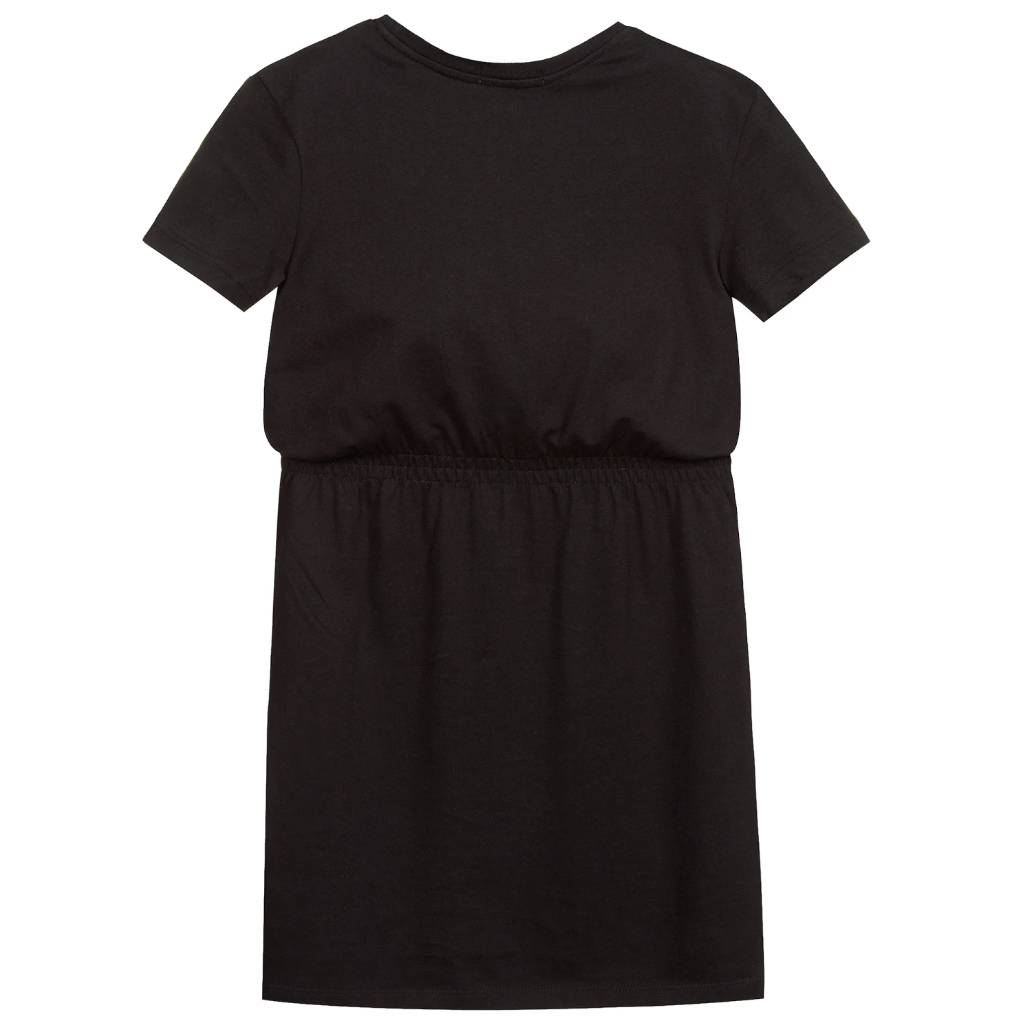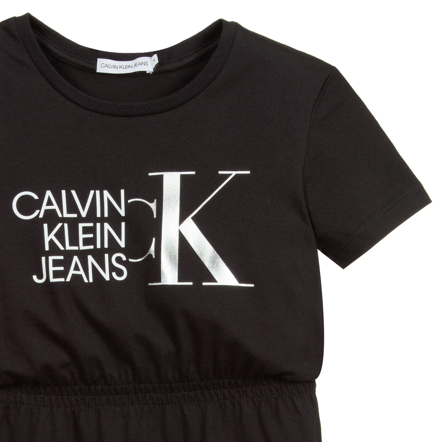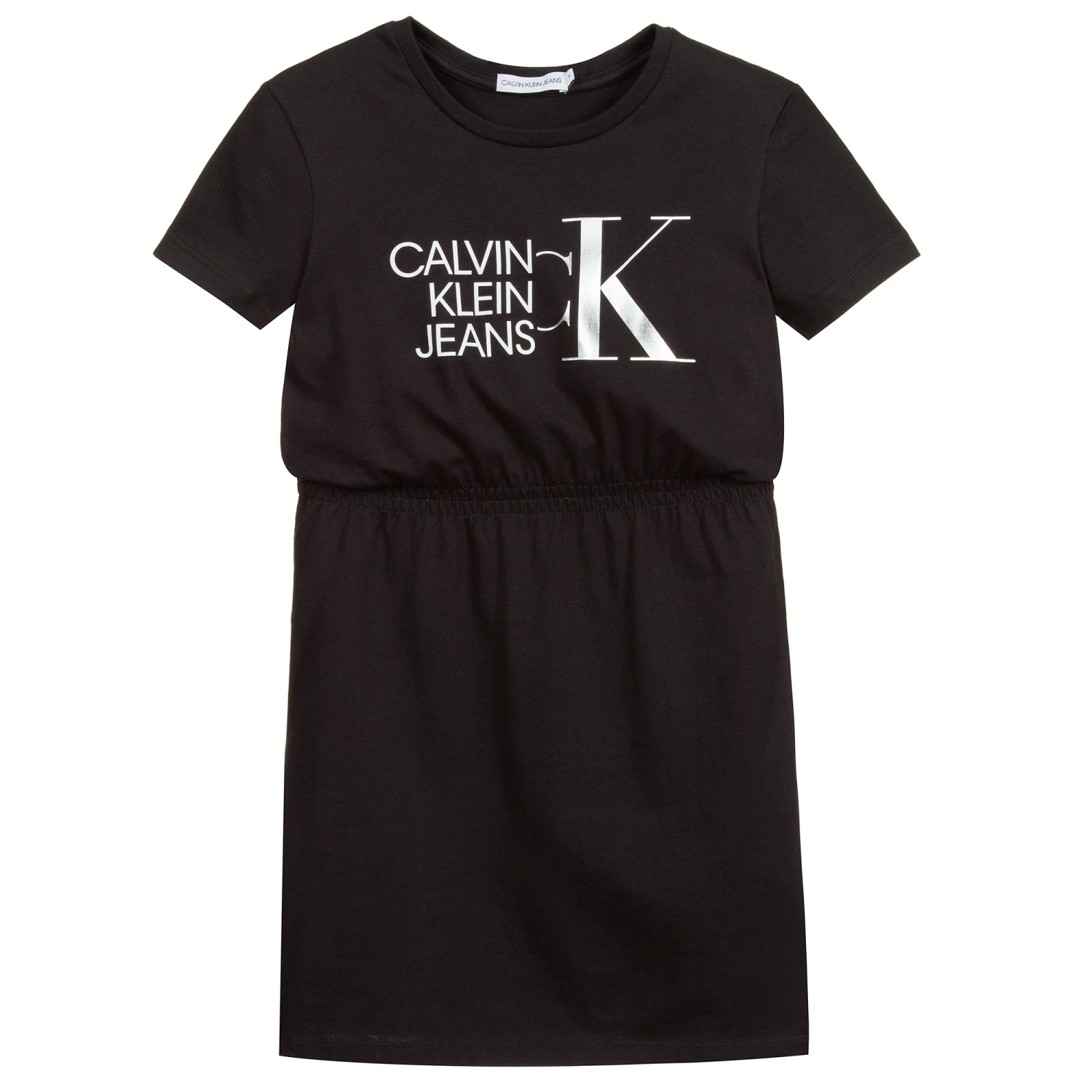 Black T-shirt dress for teen girls by Calvin Klein Jeans. Lightweight and stretchy, this comfortable dress is elasticated around the waist, perfect for casual days. In true designer style, it has a large white name logo and the iconic CK logo in silver.