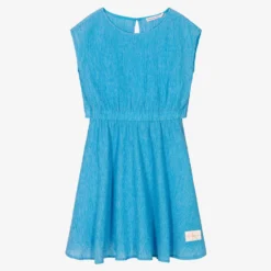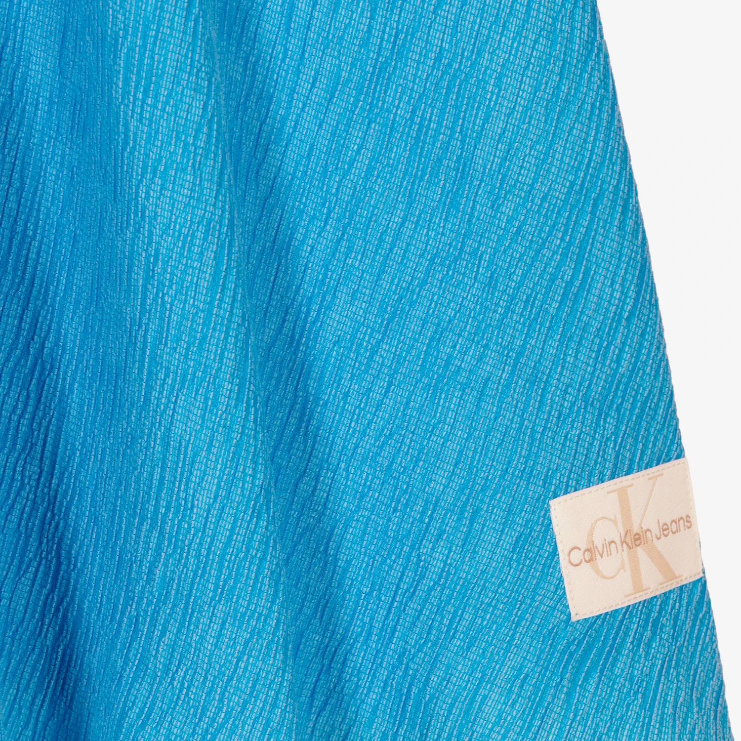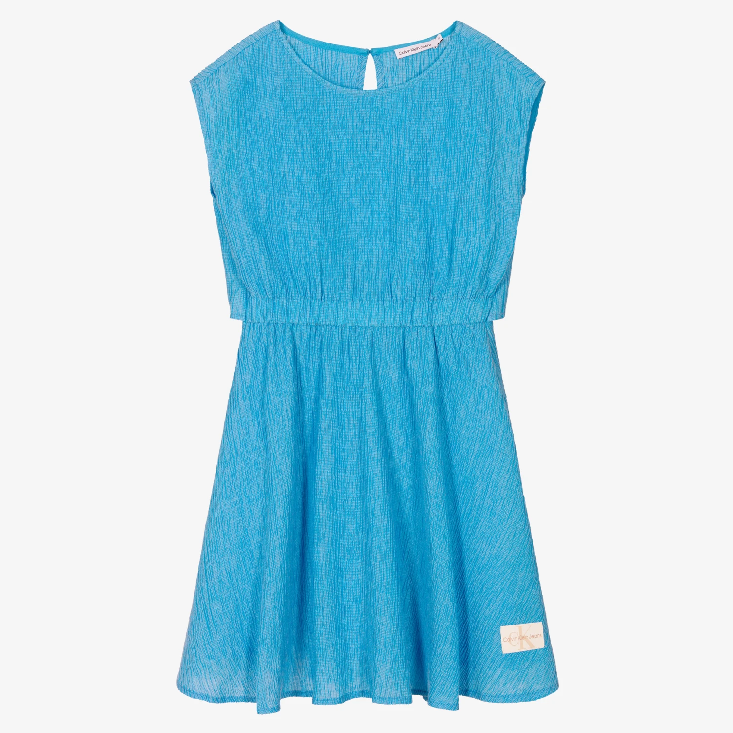 Blue midi dress for teen girls by Calvin Klein Jeans, with an ivory monogram logo patch on the hem. Textured for an eye-catching finish, the crinkle-effect fabric and voile lining are super soft and lightweight, great for warmer weather. Featured on the back is a keyhole button fastening, feminine cut-out detail and an elasticated panel for a flattering silhouette. The bodice front and skirt are lined with soft voile for extra comfort. Eco-conscious, it is made with at least 50% Tencel Lyocell.