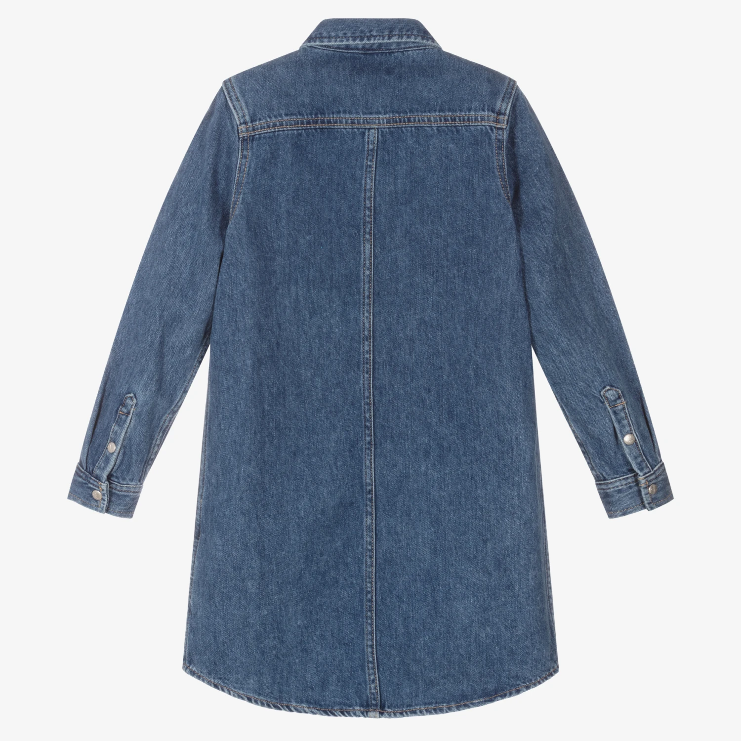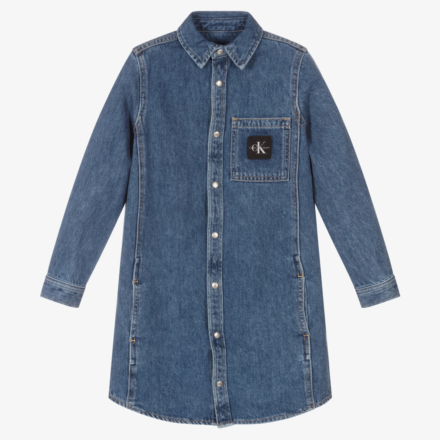 Casual mid-blue denim shirt dress for teen girls by Calvin Klein Jeans made with 20% recycled cotton. With classic contrast orange stitching, it has a black CK logo badge on the chest pocket, and side seam pockets.