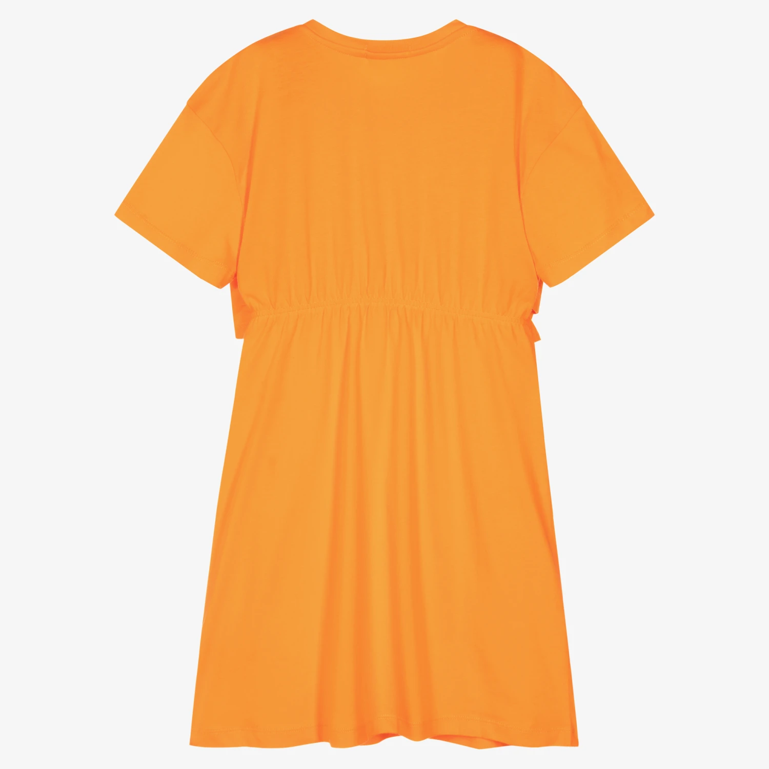 Casual orange dress for teen girls by Calvin Klein Jeans, made in comfortable cotton jersey. It has a glittery silver logo print across the front and the brand’s CK monogram logo on one sleeve. An easy-to-wear style, the dress is layered at the front to give the impression of a two-piece, with a gathered skirt.