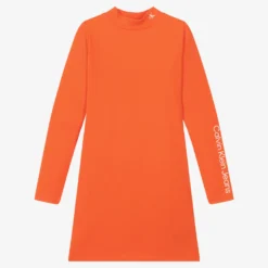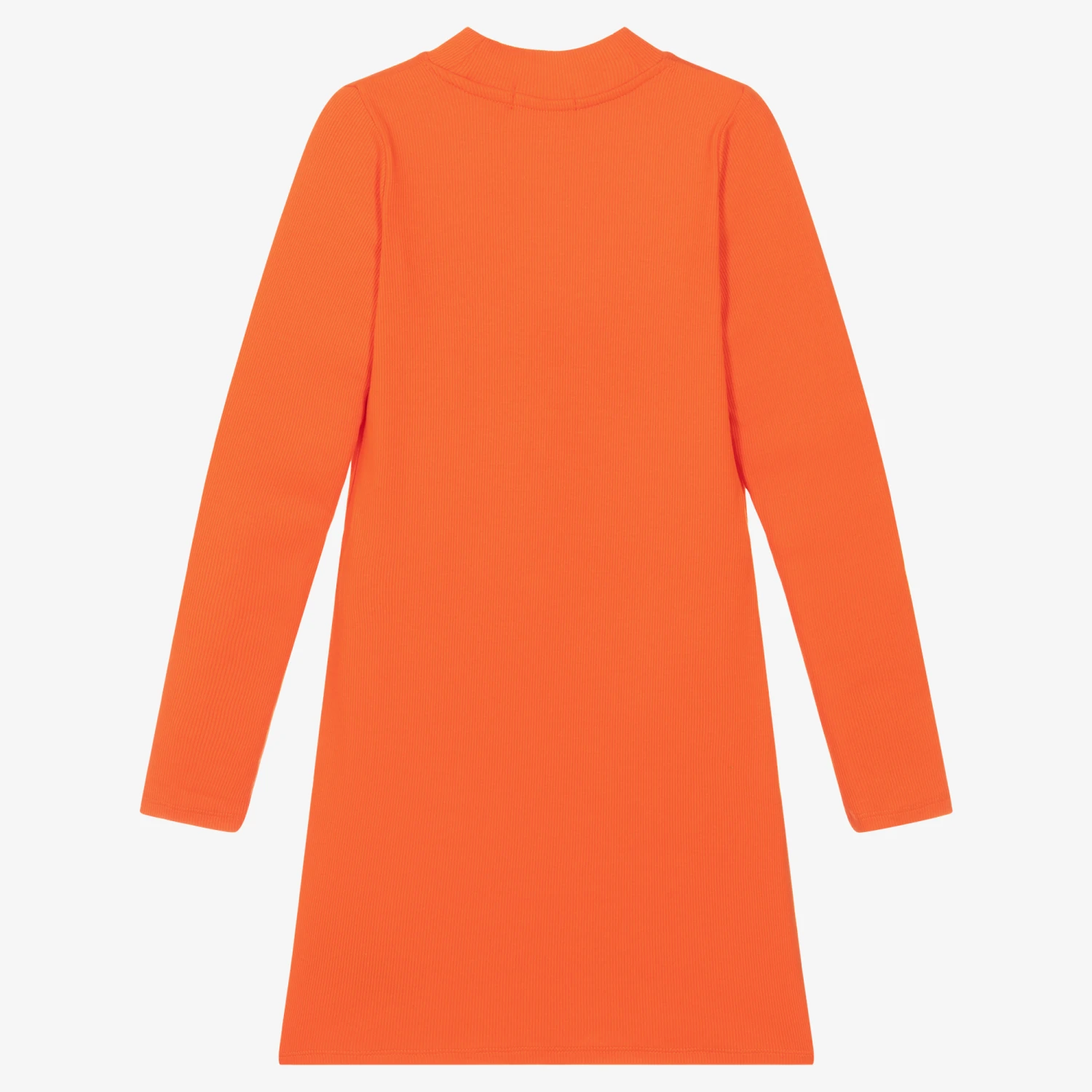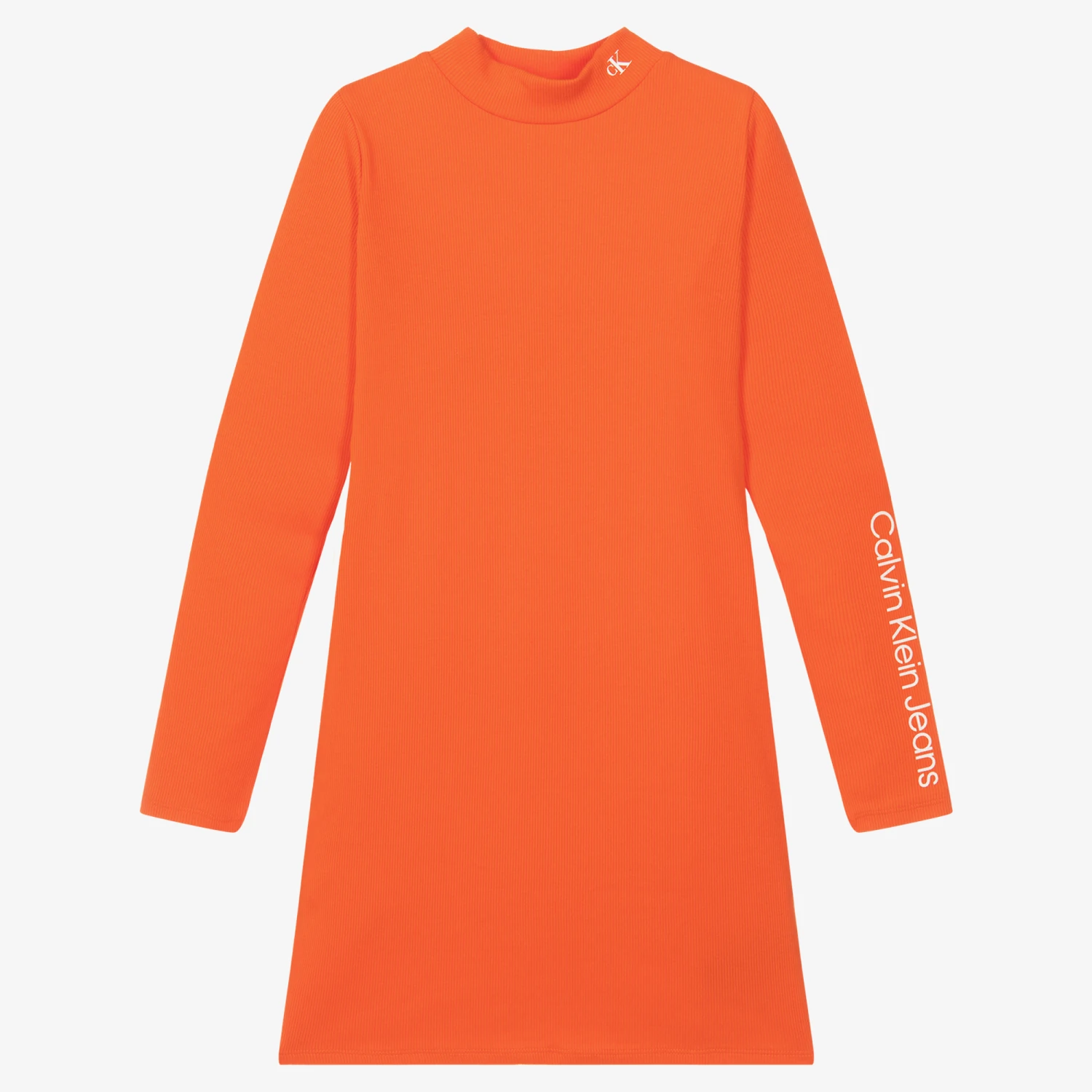 Teen girls orange turtleneck dress by Calvin Klein Jeans. This casual style is made in soft and stretchy ribbed cotton for a flattering fit. The American label’s Calvin Klein monogram is printed on the stand-up collar in white. One long sleeve is stamped with a white spell-out logo for an added designer touch.