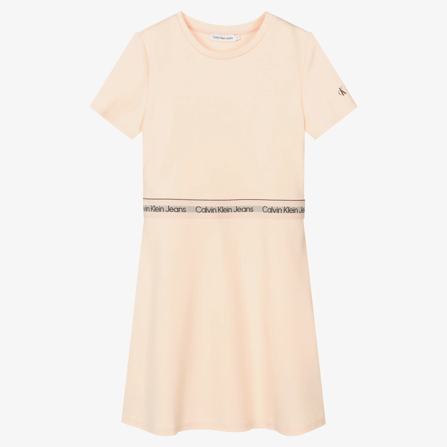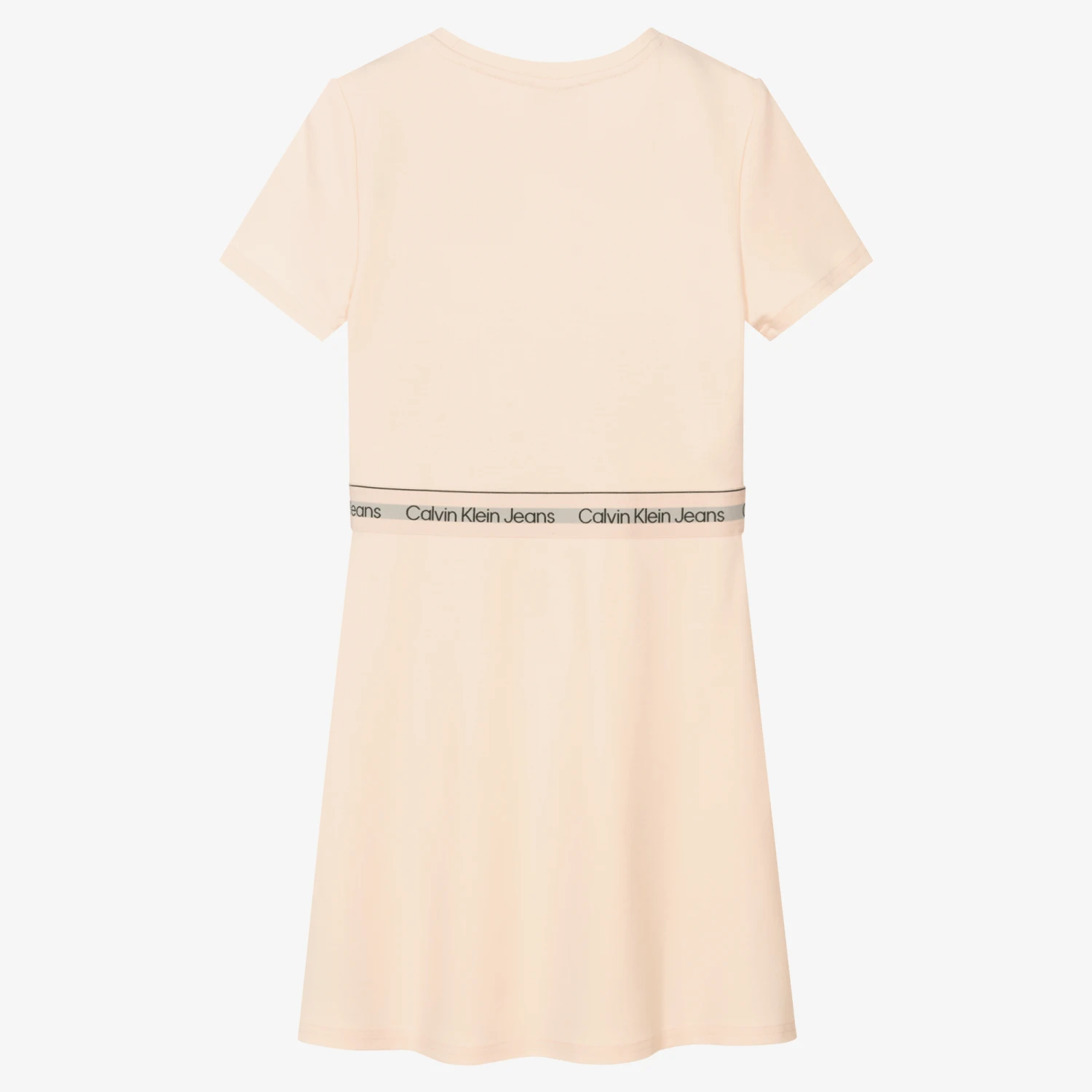 From Calvin Klein Jeans, pale pink dress for teen girls with elasticated logo printed tape around the waist. Comfortable to wear, this dress slips on over the head and is made in soft, stretchy Milano jersey. The fabric contains 70% sustainable fibers including ECOVERO.