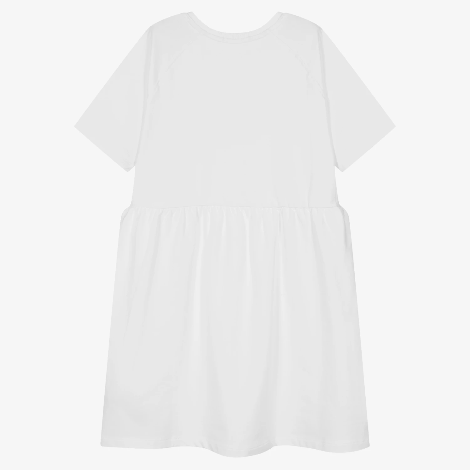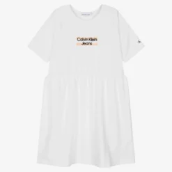 White dress for teen girls by Calvin Klein Jeans. In a comfortable relaxed fit, it is made in stretchy cotton sweatshirt jersey, great for casual wear in warm weather. A black flocked logo sits atop orange block stripes stamped on the bodice. This cool design features sporty raglan sleeves with a monogram logo detail for a little extra designer allure.