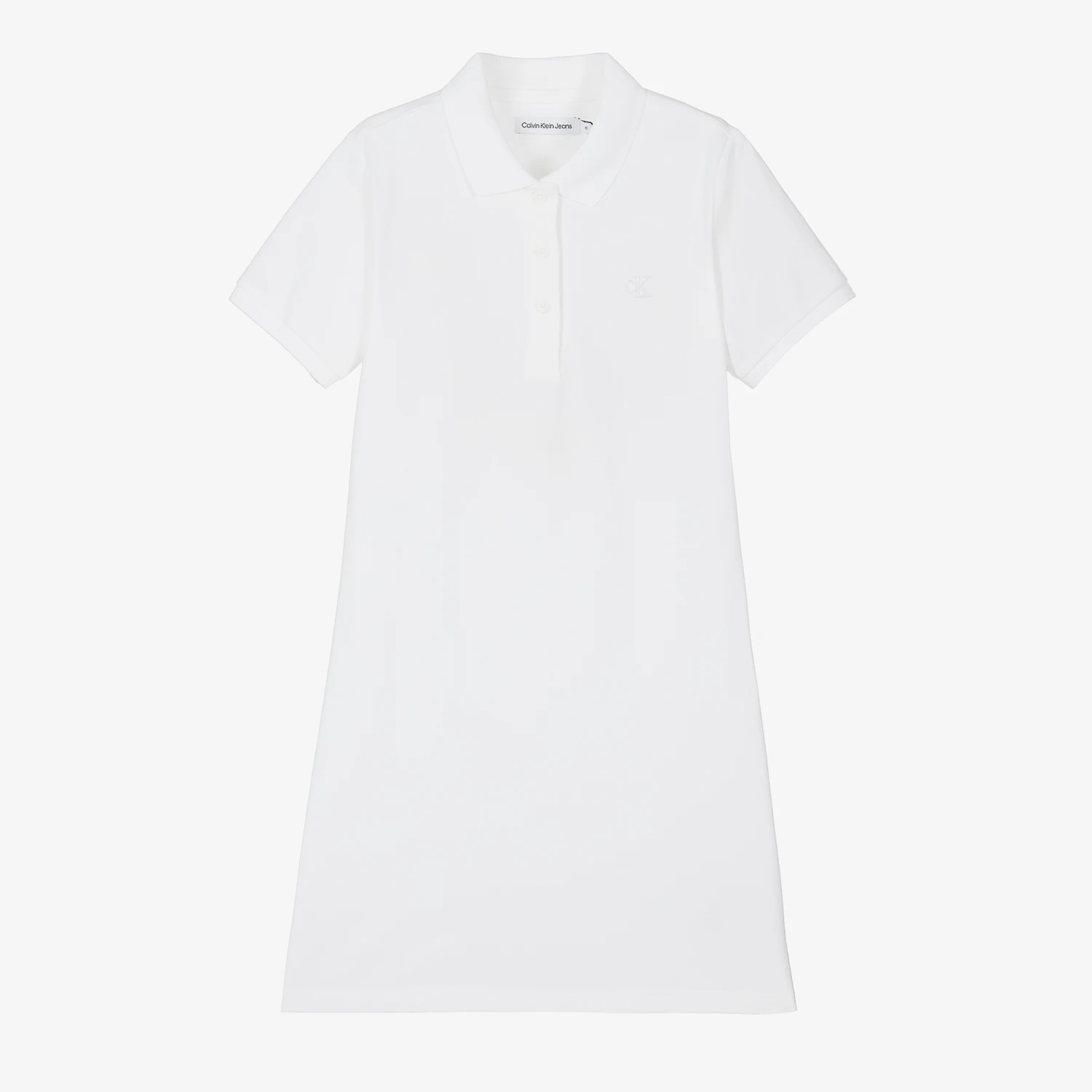 Casually sporty, this white polo dress for teen girls is from Calvin Klein Jeans. The signature Calvin Klein monogram is embroidered on the bodice, in a tonal shade for minimalistic recognition. There is a smart-casual collar, with logo-embossed button fastenings beneath. This cotton piqué dress is easy-to-wear and style in a pretty A-line design.
