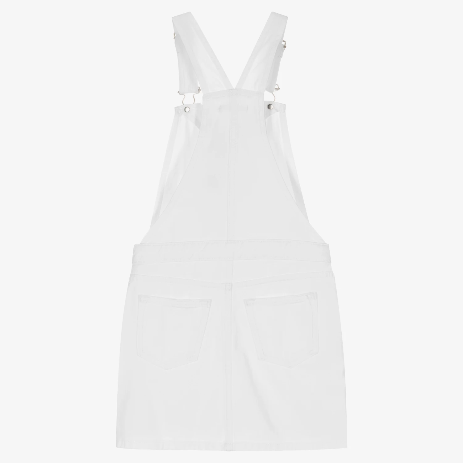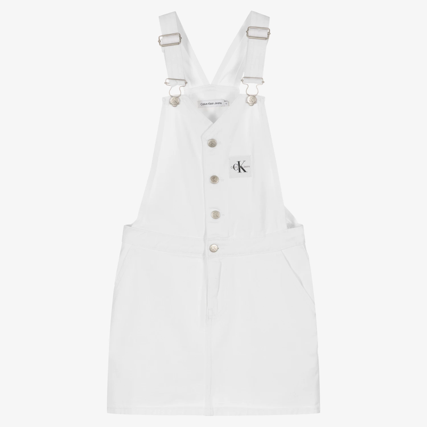 Teen girls white dungaree-style dress by Calvin Klein Jeans, stamped with a CK logo badge on the front. In classic dungaree styling, it has adjustable shoulder straps and silver buttons, all embossed with the brand’s monogram logo. Cool for layering over a statement tee, it has pockets on the front and back. It has a concealed zip on the front an easy fit, and is made in soft cotton denim twill for a relaxed style. This item contains 20% recycled cotton for an eco-positive impact.