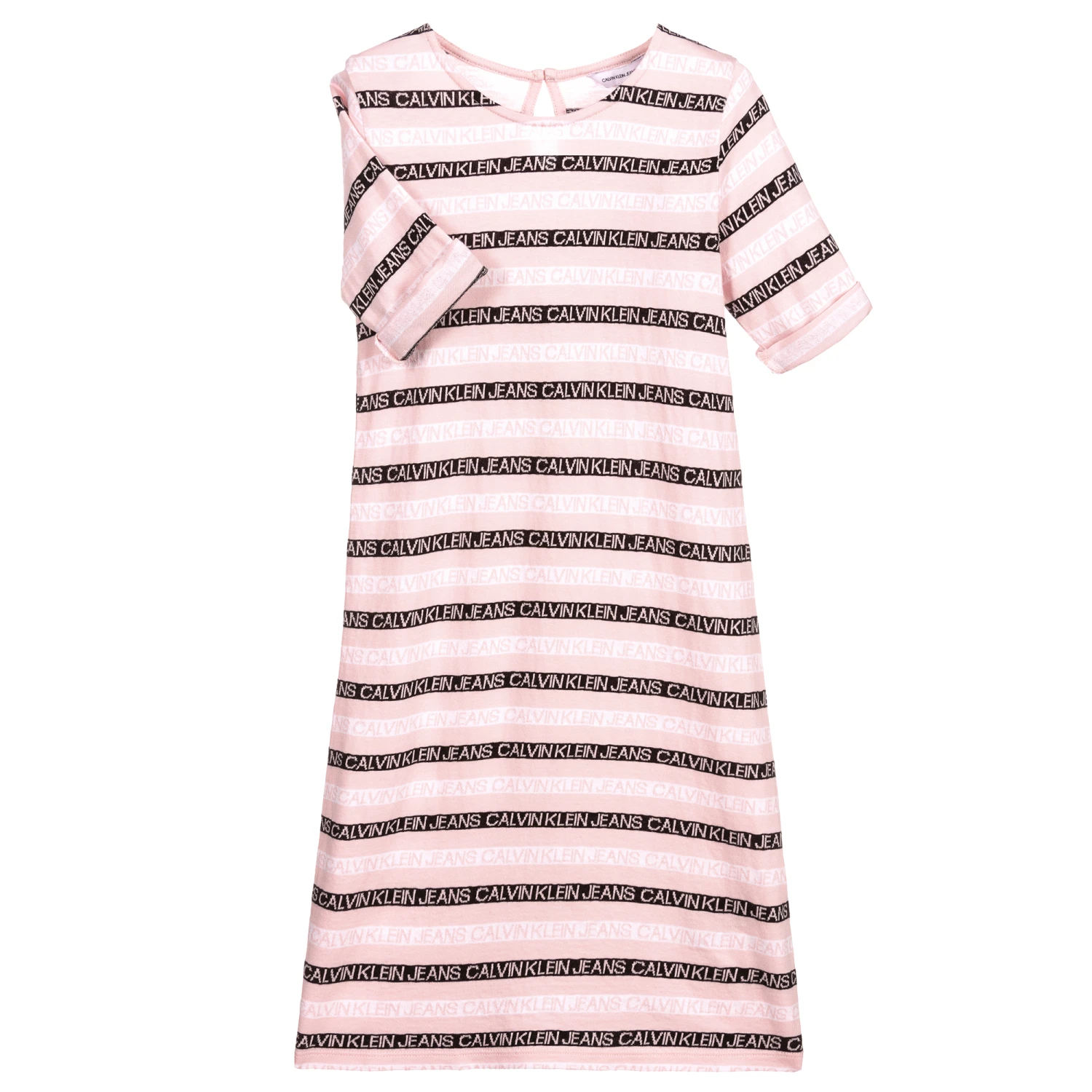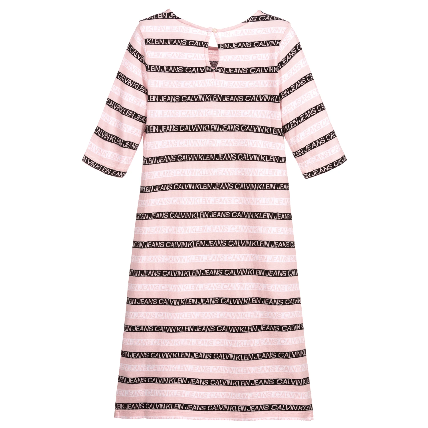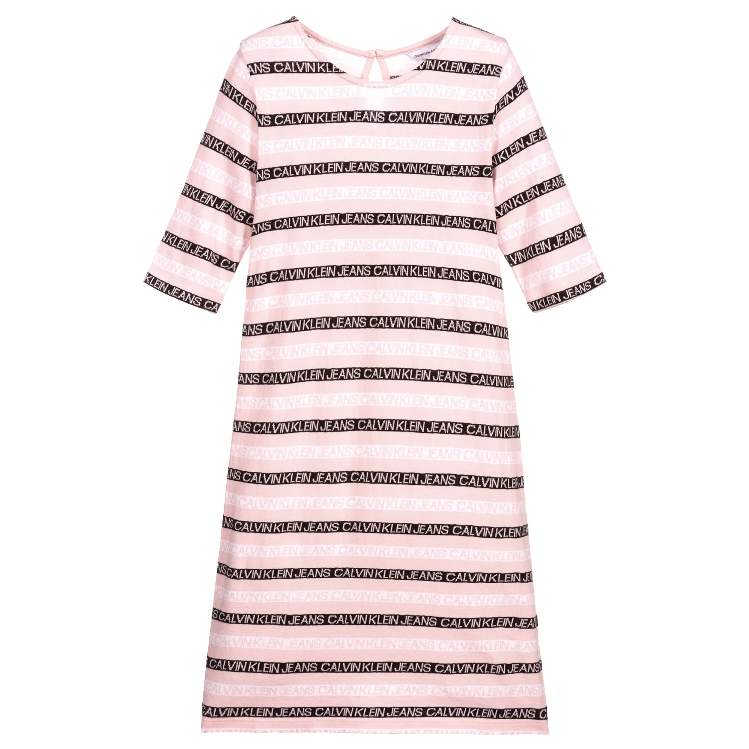 Teen girls pink A-line dress by Calvin Klein Jeans, made in a super soft organic cotton and modal jersey blend. The white and black logo stripes convert this casual dress into a timeless fashion statement.
