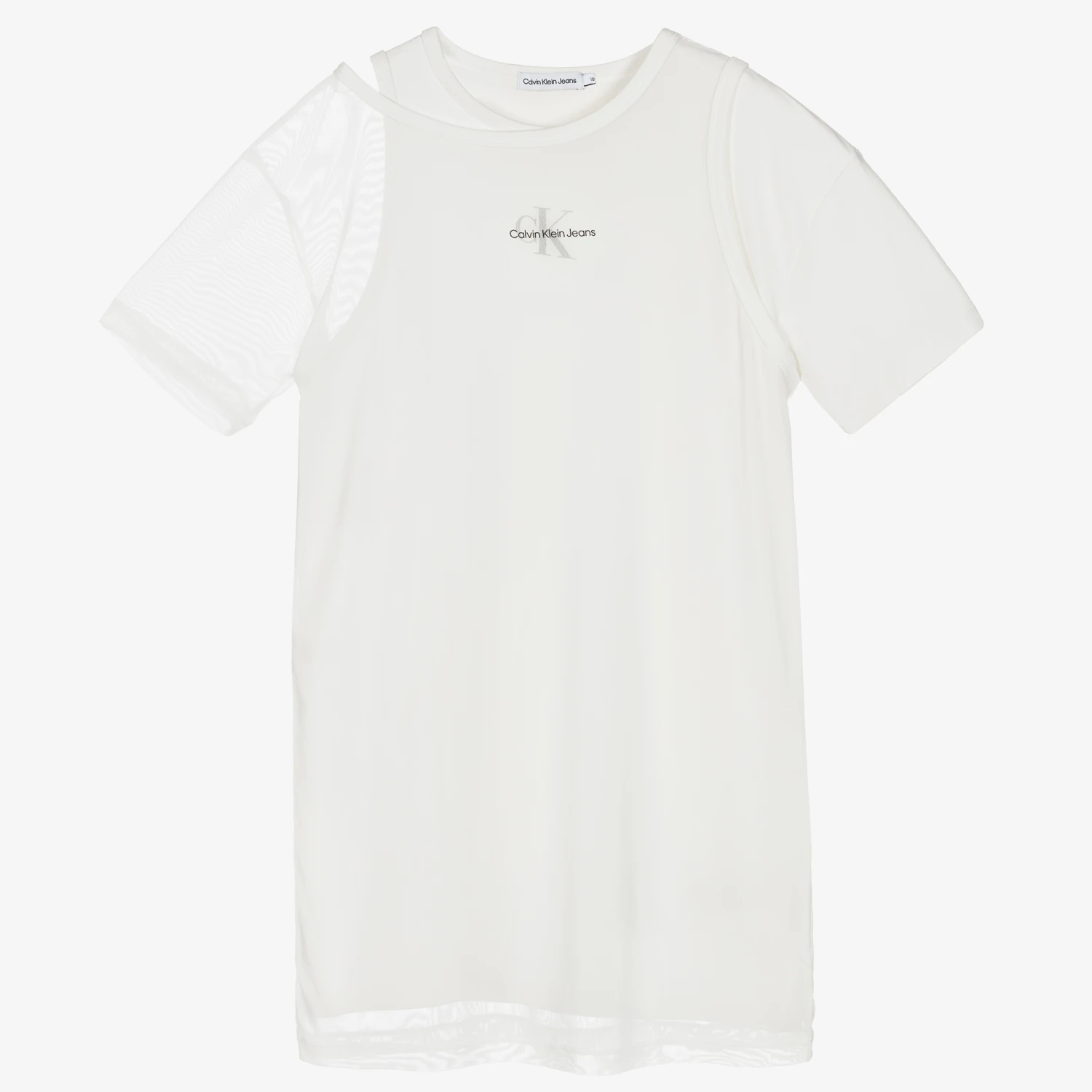 A white cotton jersey dress for teen girls by Calvin Klein Jeans, with an attached mesh overlay. For a laid-back streetwear look, each dress has an asymmetric style, allowing the mesh layer to fall casually over one shoulder. The brand’s signature Calvin Klein monogram is printed on both items for bold distinction.