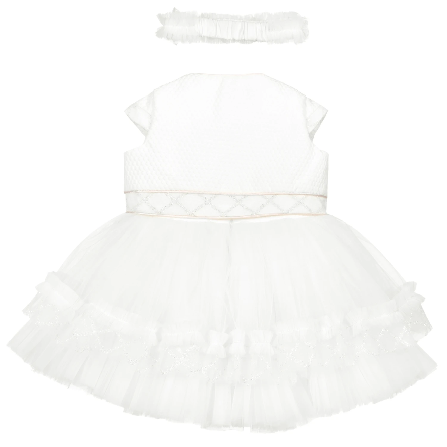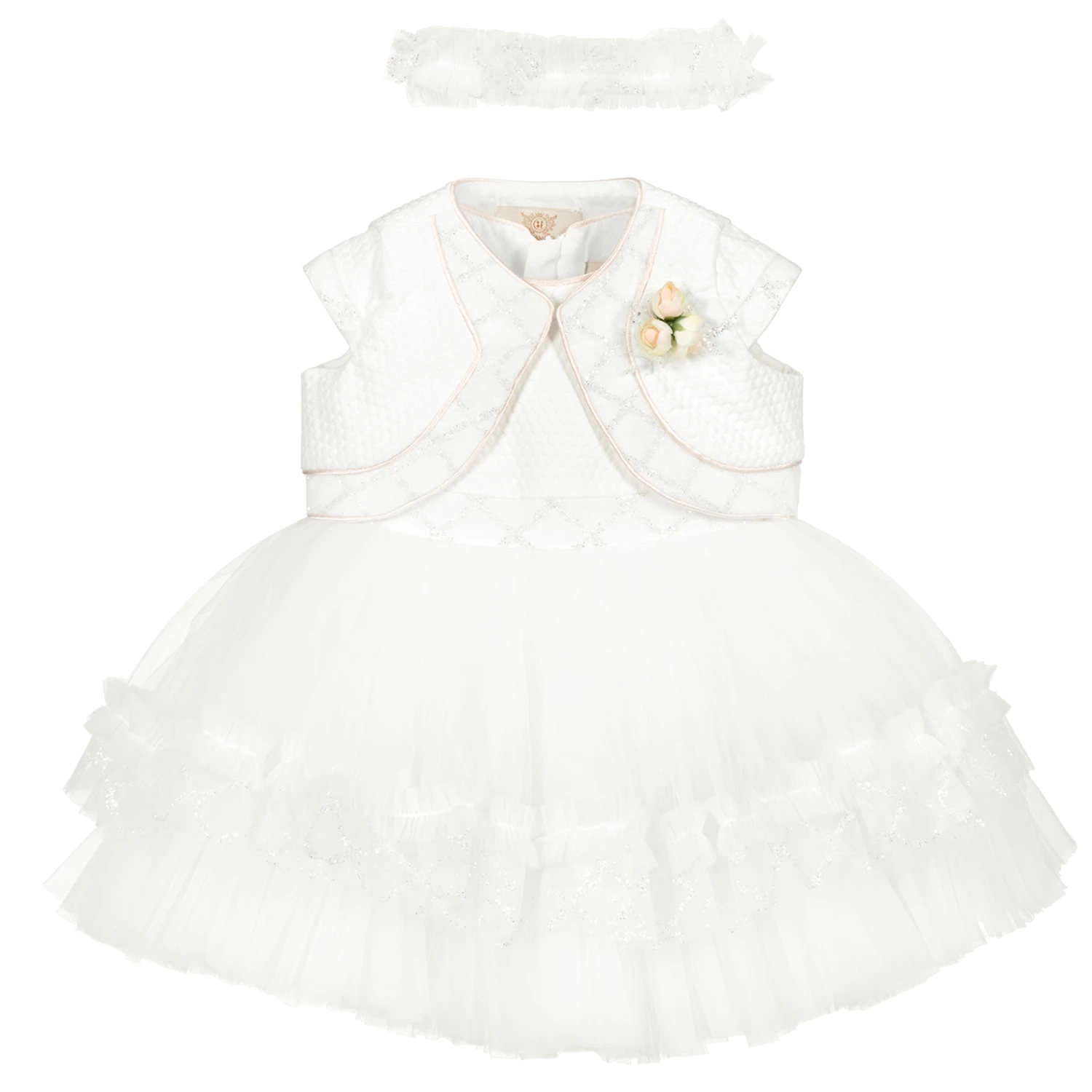Special occasion ivory dress, bolero jacket and headband set for baby girls by Caramelo Kids. The dress has raised dot fabric on the bodice, with pink satin piping, a frothy tulle skirt and glittery trim. The matching bolero jacket has a sweet floral brooch and a matching headband completes the cute look.