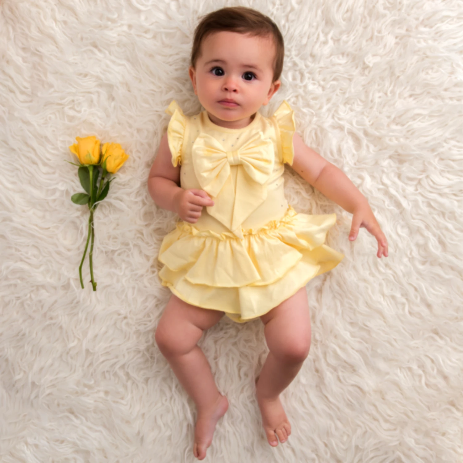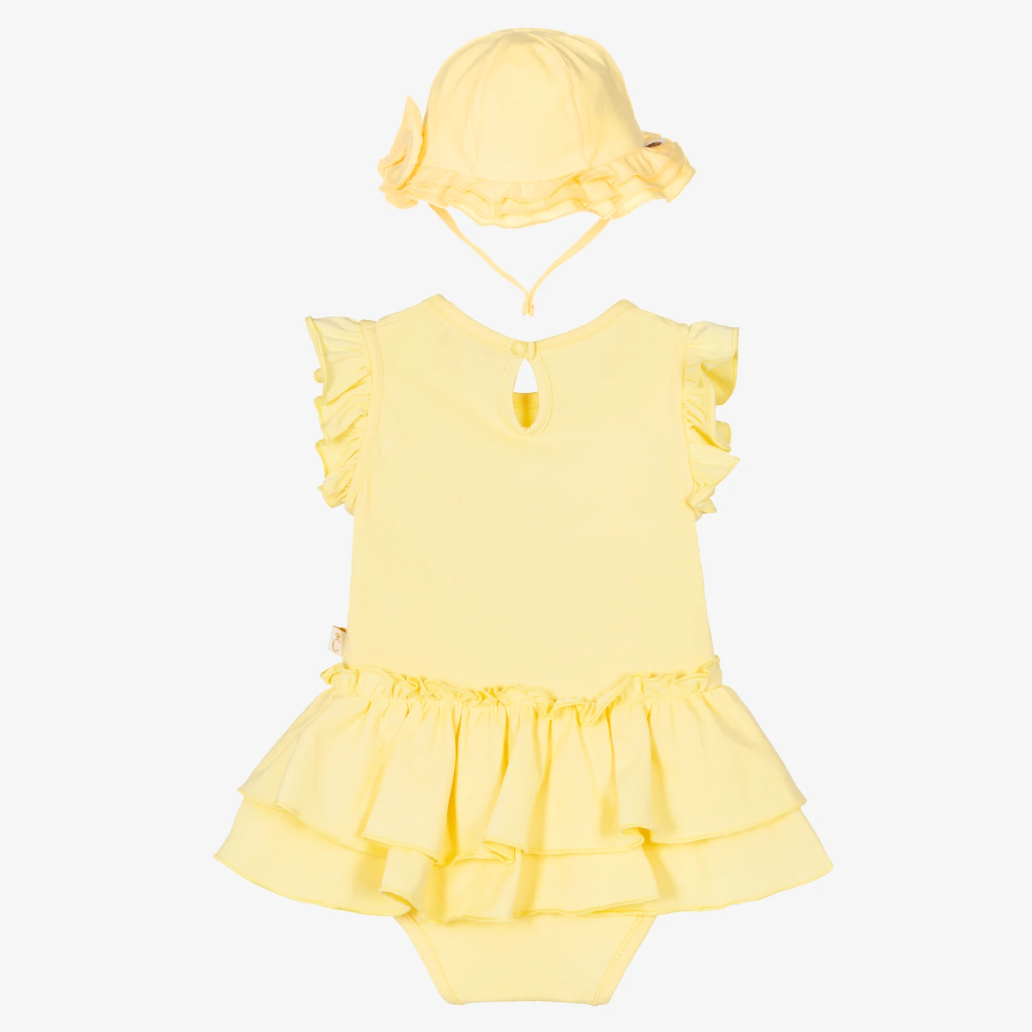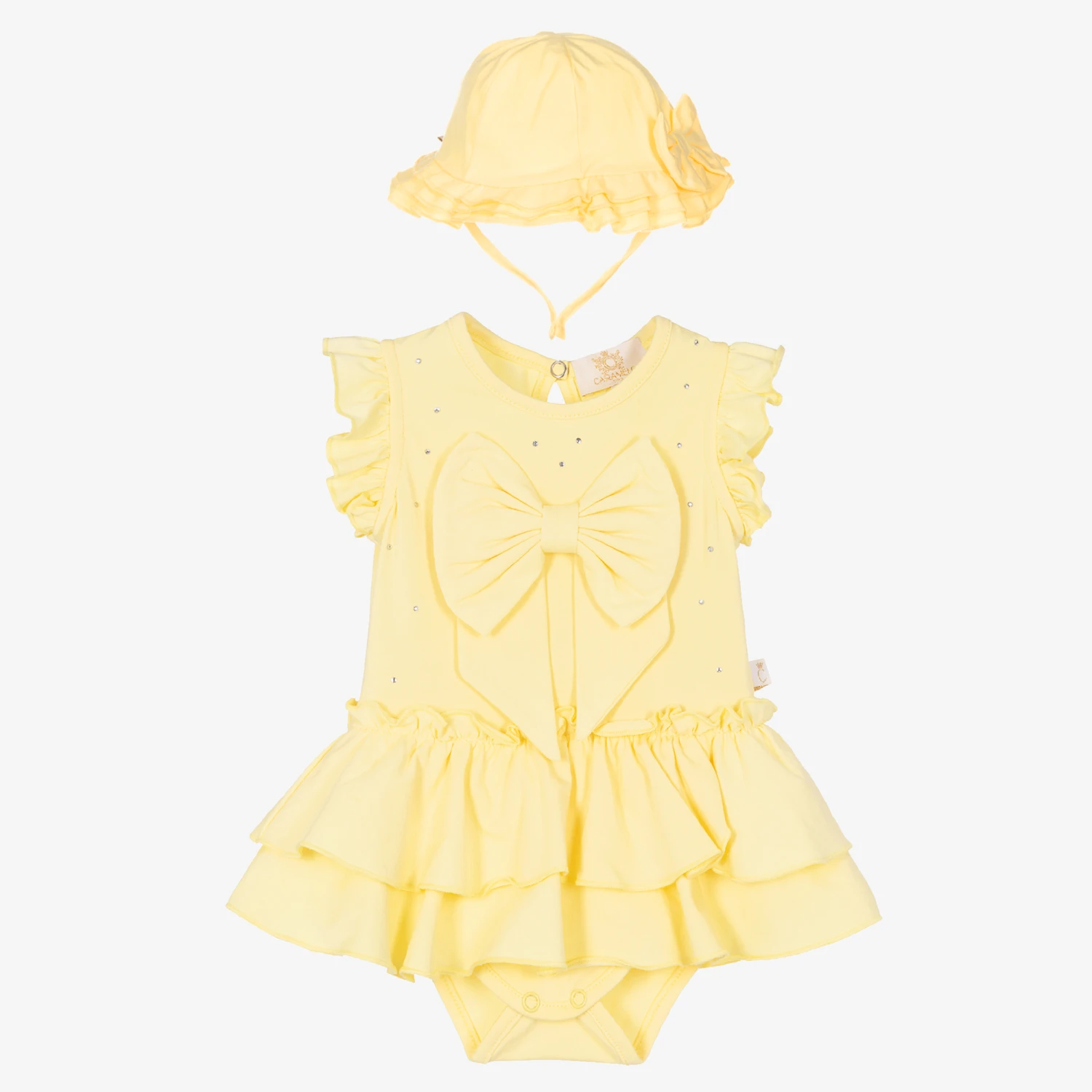 Pretty ruffles and sparkly diamantés add a beautiful touch to this yellow dress for baby girls, by Caramelo Kids. Made in soft and comfortable cotton jersey with easy popper fastenings on the attached knickers, it has a large bow appliqué on the front. A matching hat with a pretty bow on the back and ties to secure under the chin, completes the cute look.