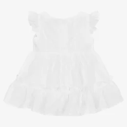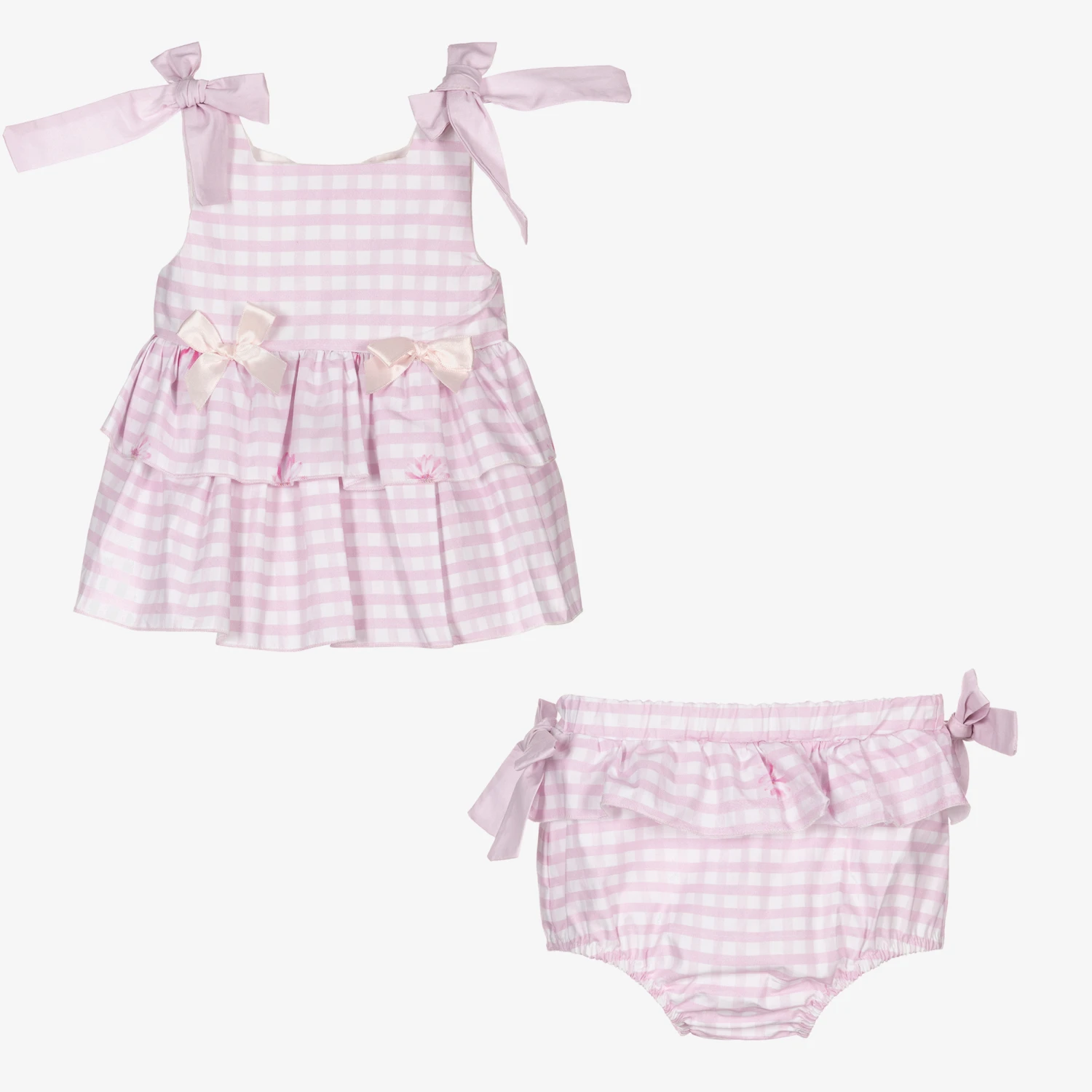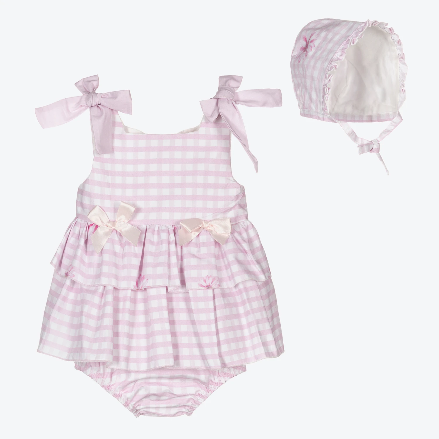 Pale pink gingham dress set for baby girls by Caramelo Kids, made from soft cotton poplin. Printed with a delicate pale pink daisy design, the dress has a sweet ruffle skirt and fixed bows on the straps. Paired with matching pale pink gingham knickers, it also comes with a sweet bonnet with a ruffle trim, that easily ties underneath the chin.