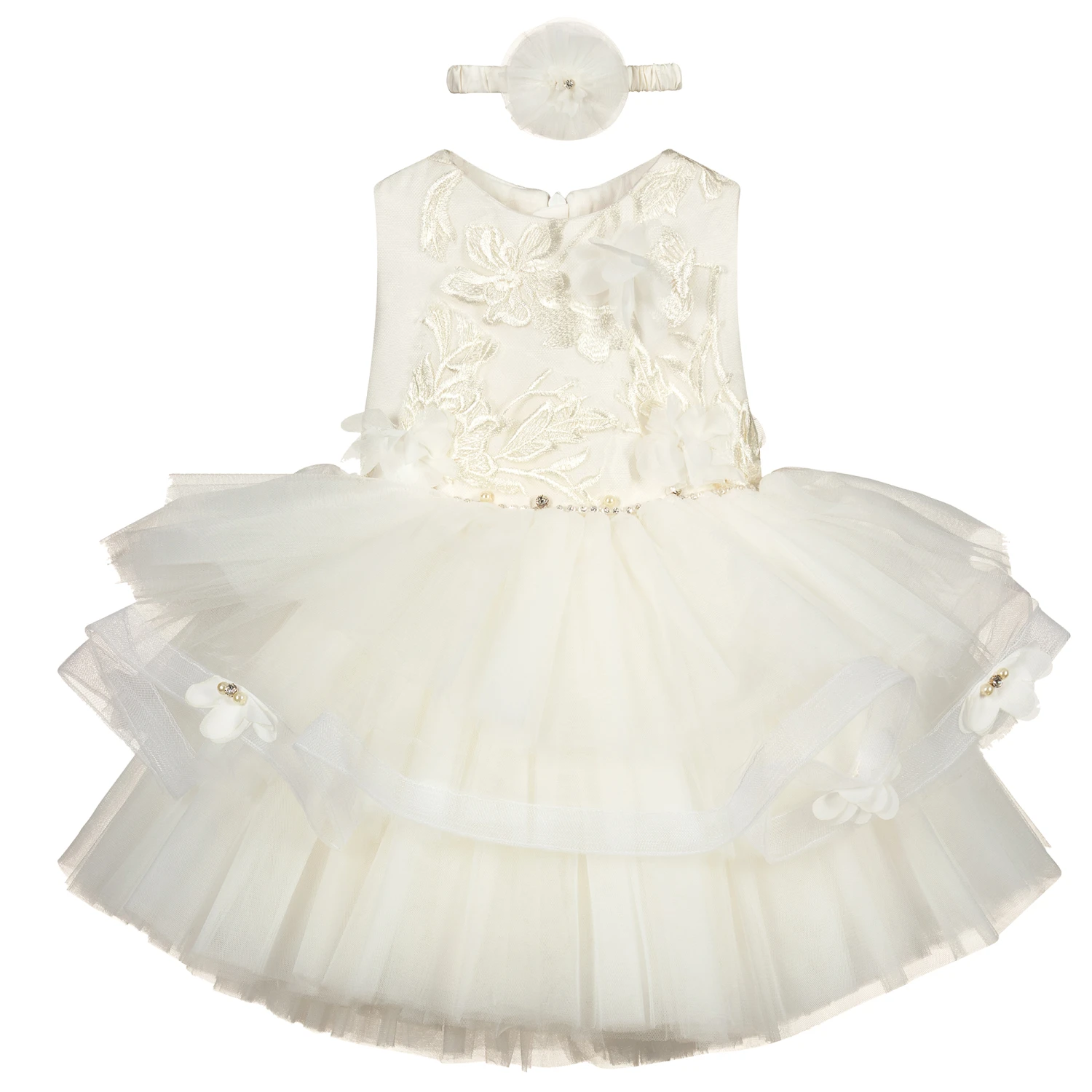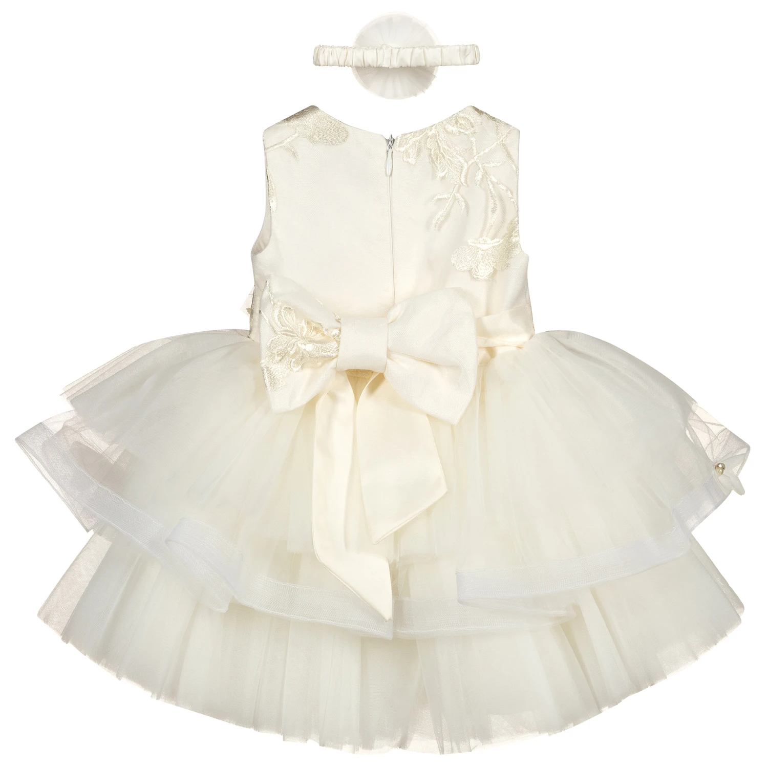 Gorgeous ivory tulle dress and headband set for baby girls by Caramelo Kids. Perfect for a special occasion, the bodice has ivory floral embroidery and tulle flower appliqués. The waistline has sparkling diamantés and pearls around the front and the skirt has frothy layers of tulle with a large bow detail on the back. The satin headband has a matching tulle and diamanté decoration.