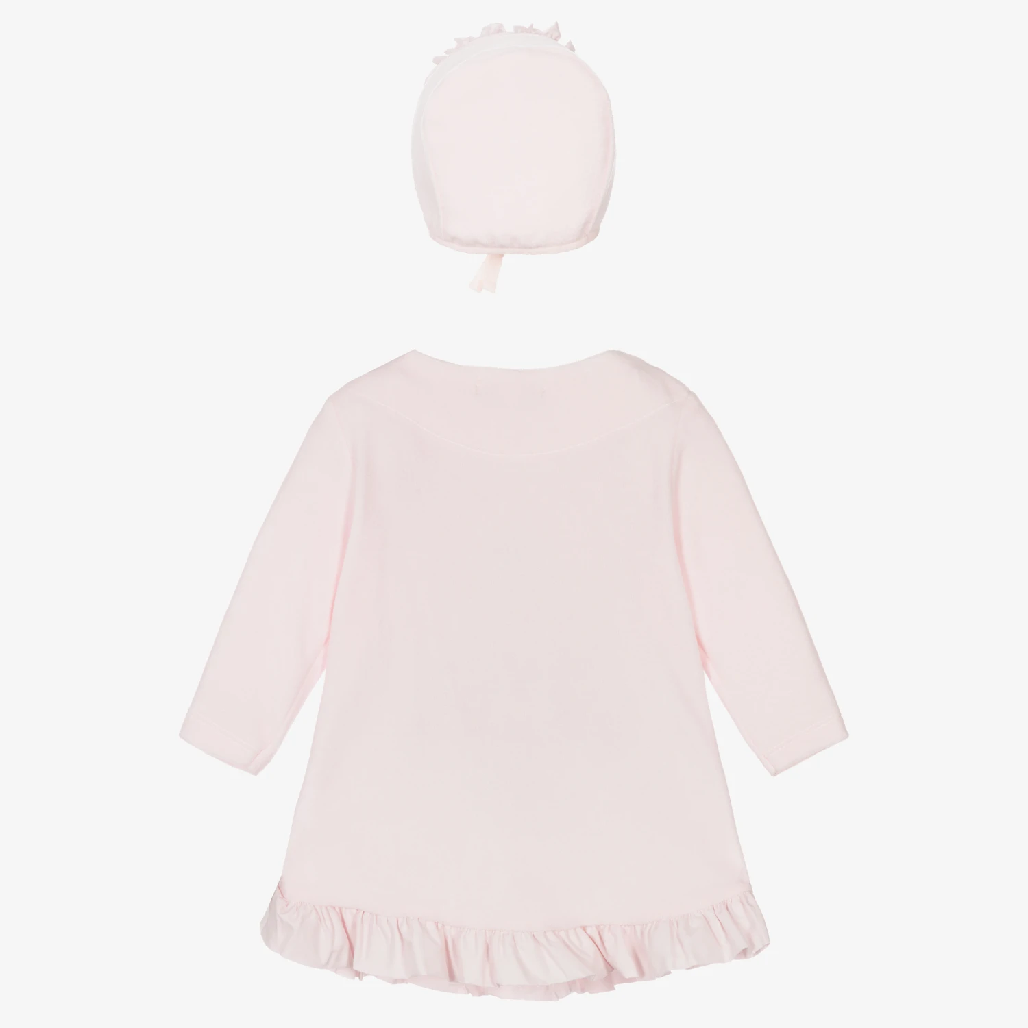 A pretty pale pink two piece dress set by Caramelo Kids, made from soft velour with pink trims, and tiny silver gems on the collar. The dress comes with a matching bonnet, that ties underneath the chin.