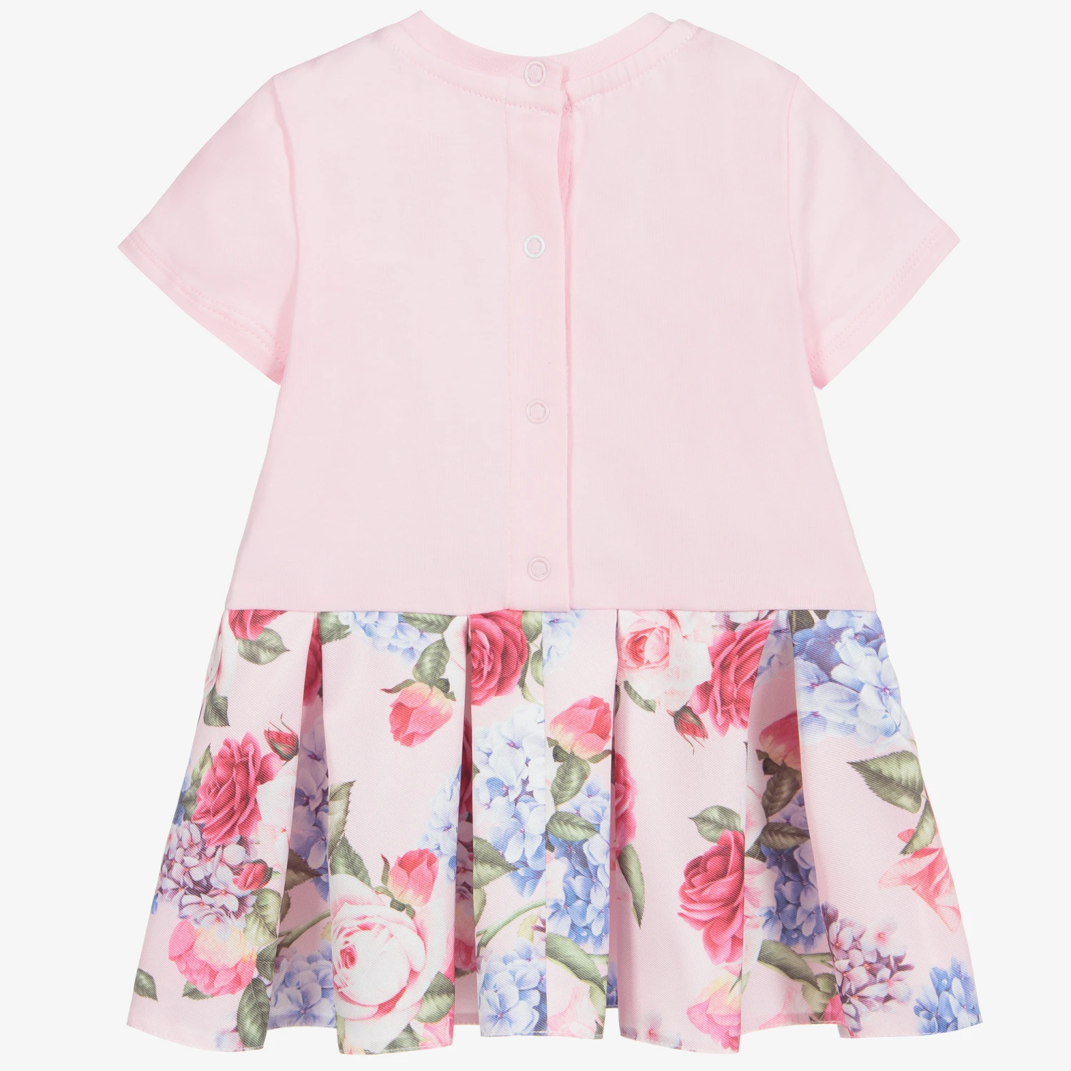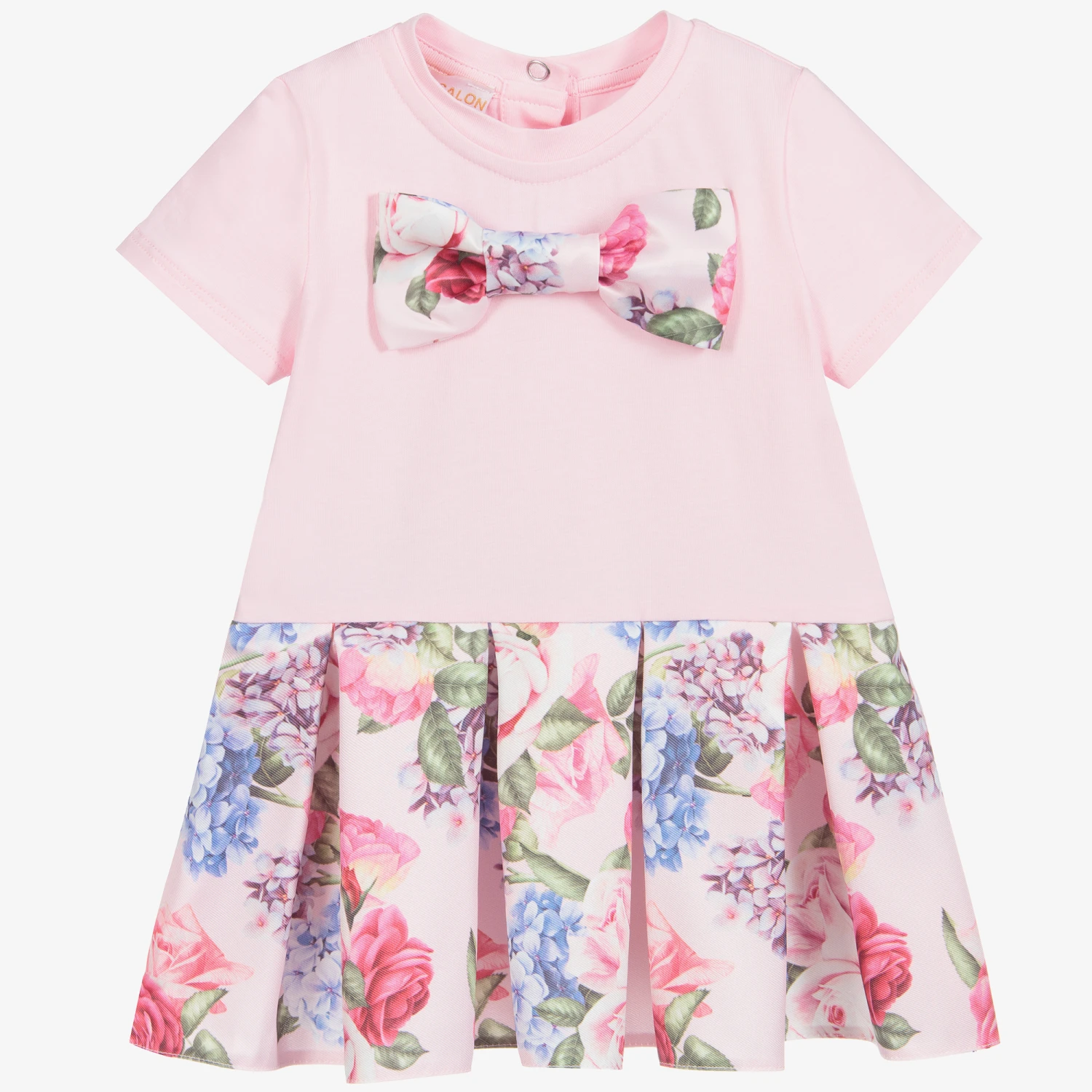 Beautiful pale pink dress for baby girls by Childrensalon Occasions. The bodice is made in comfortable cotton jersey, with a fixed satin bow that has a blue and pink floral print. The box-pleated skirt is made in coordinating satin with a matching print. It fastens with poppers on the back.