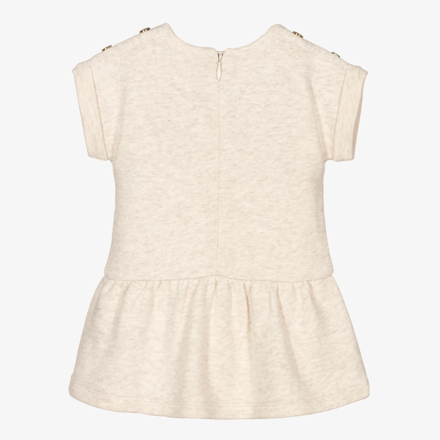 Beige dress for younger girls by luxury French designer Chloé, made in soft cotton sweatshirt jersey. The front is printed with a large pineapple in shades of beige and white with a metallic gold signature logo print. It has stitch rolled sleeves and decorative gold logo-engraved poppers on the shoulder. It fastens with a concealed zip on the back.