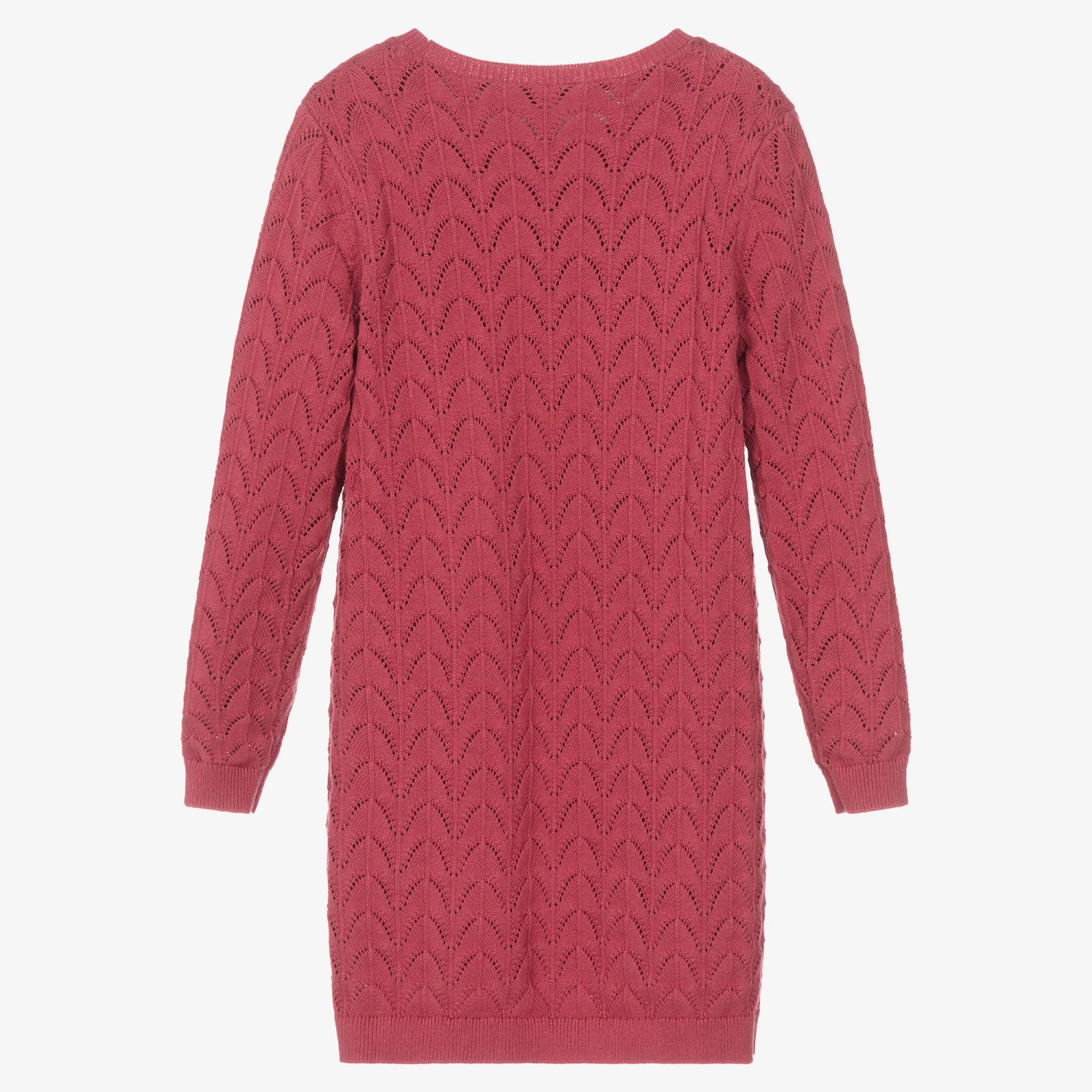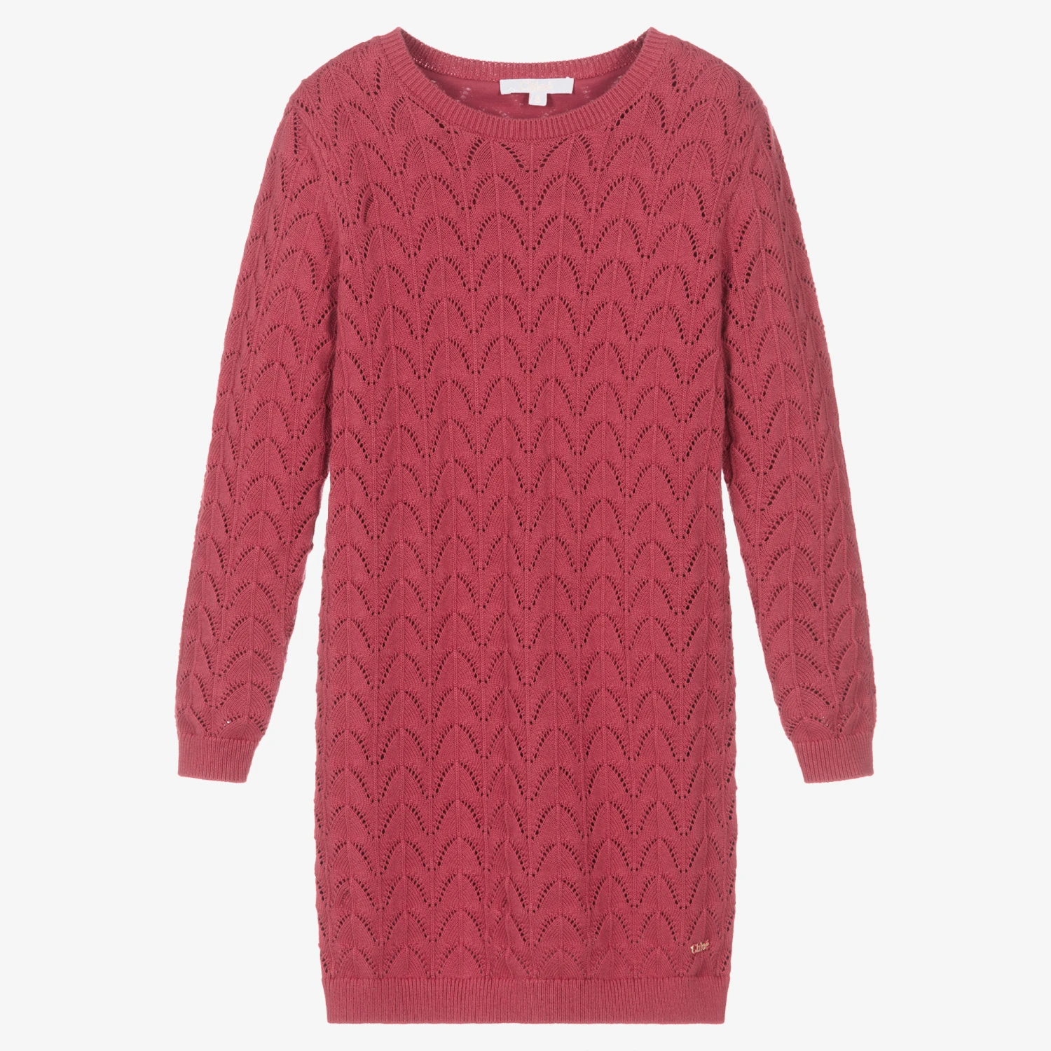 Terracotta pink dress for teen girls by luxury French designer Chloé, knitted in a soft blend of cotton and wool. It has a beautiful scalloped knit pattern and is lined in cotton jersey. With a gold metal charm on the hem, there are ribbed trims. It is made using organic farmed cotton.