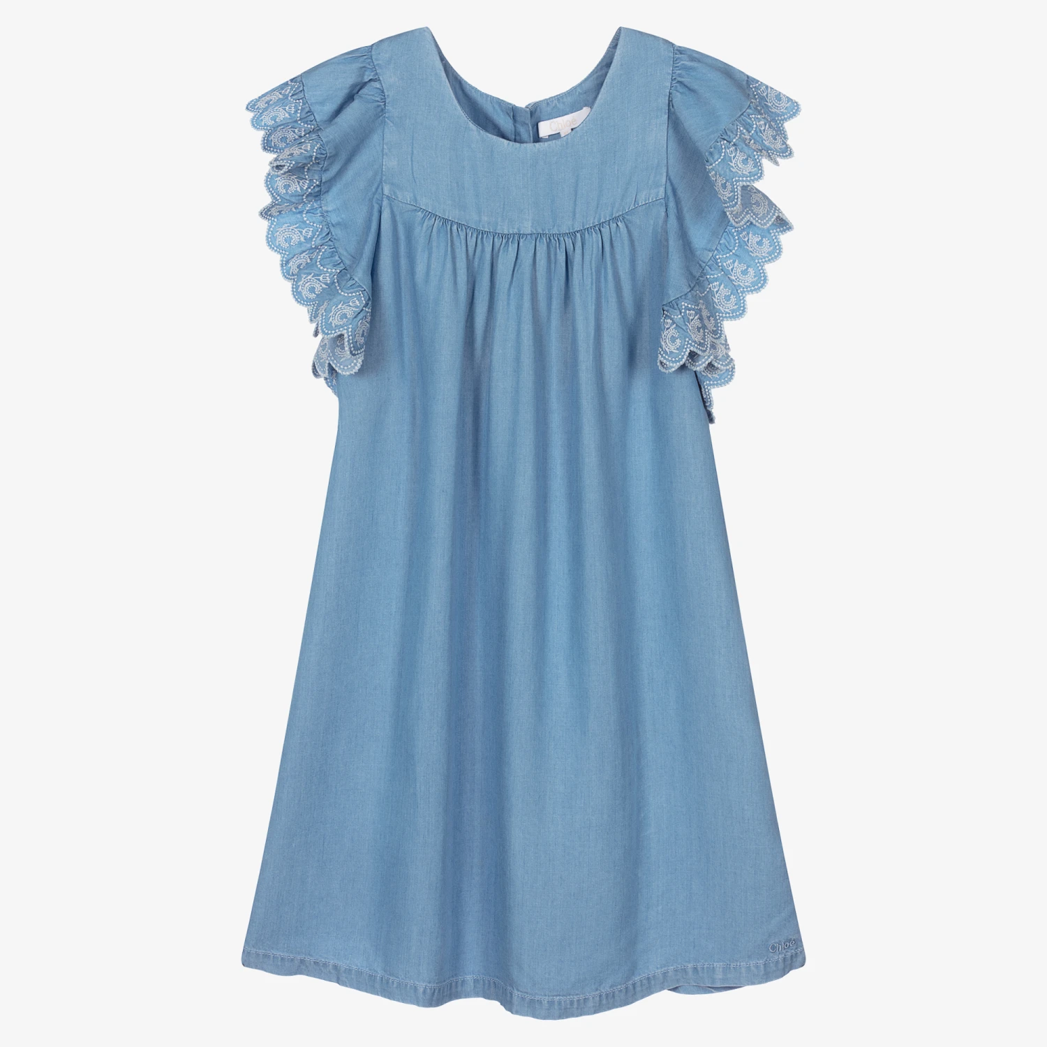 Blue chambray dress for teen girls by luxury French designer Chloé. Soft and lightweight, the flutter sleeves have Chloé signature ‘C’ embroidery and scalloped edges. There is a stylish empire waistline, a discreet, embroidered tonal blue Chloé signature logo on the front hem, and a concealed zip fastening on the back.
