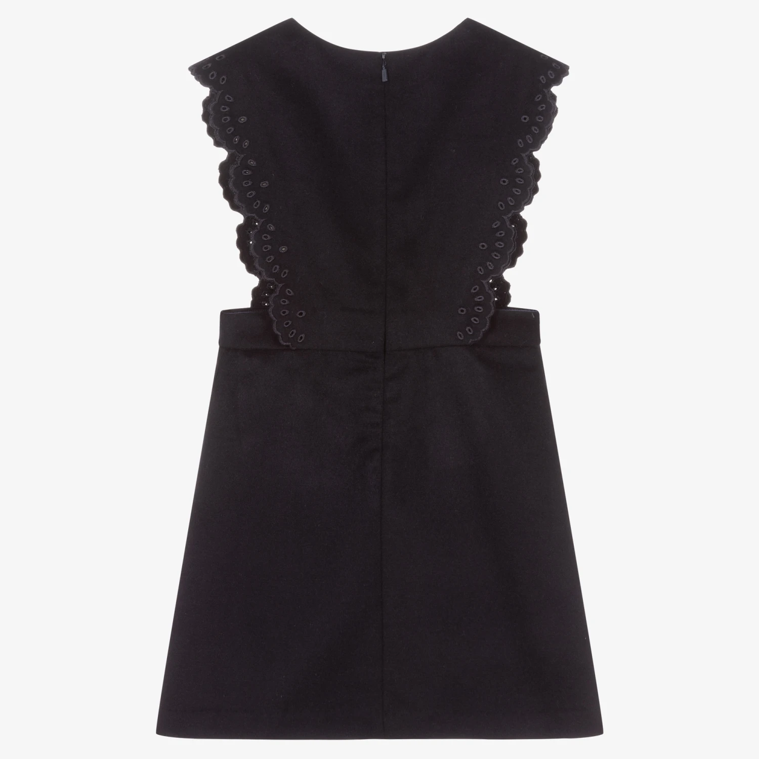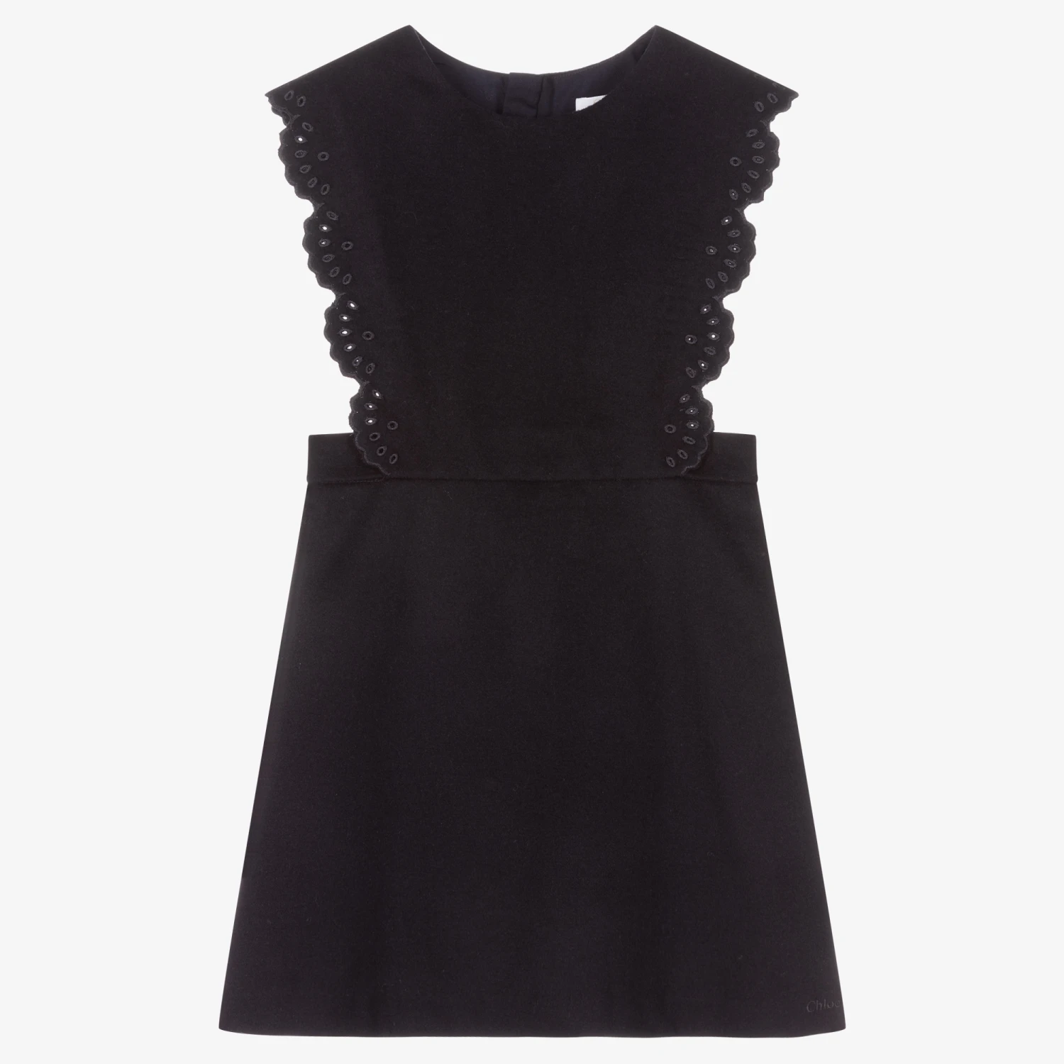 Stylish navy blue pinafore dress for teen girls, by luxury French designer Chloé. Subtly embroidered with a logo near the hem, it has gorgeous cut-out floral details on the sleeves, and a chic A-line shape skirt.