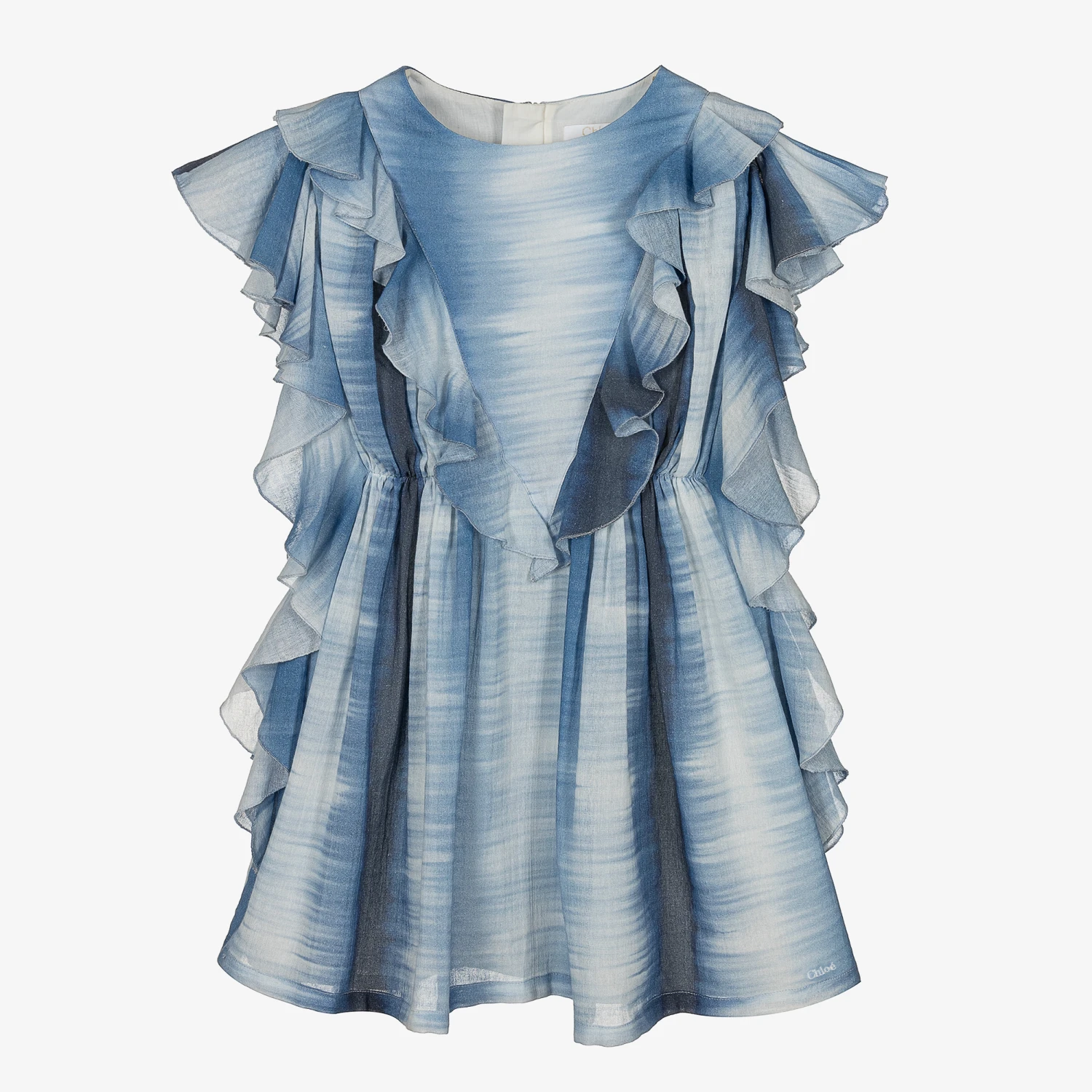 Inspired by the women’s collection, a lovely dress for teen girls by Chloé, with white and blue gradient effect stripes. Accentuated with romantic ruffles, this dress is simply beautiful with a gently elasticated waist for a subtly cinched silhouette. There is a little white Chloé logo embroidered by the hem. It has a cotton lining for comfort and a concealed zip fastening on the back.