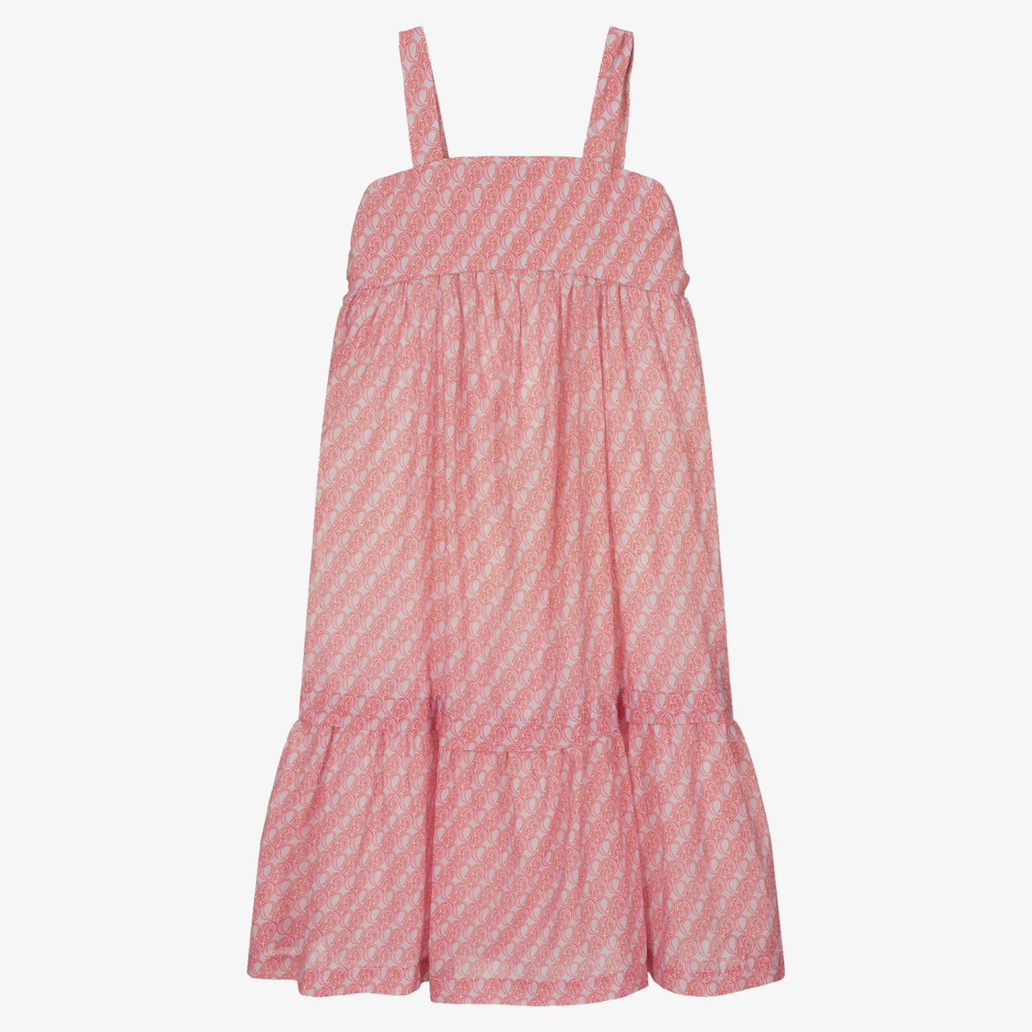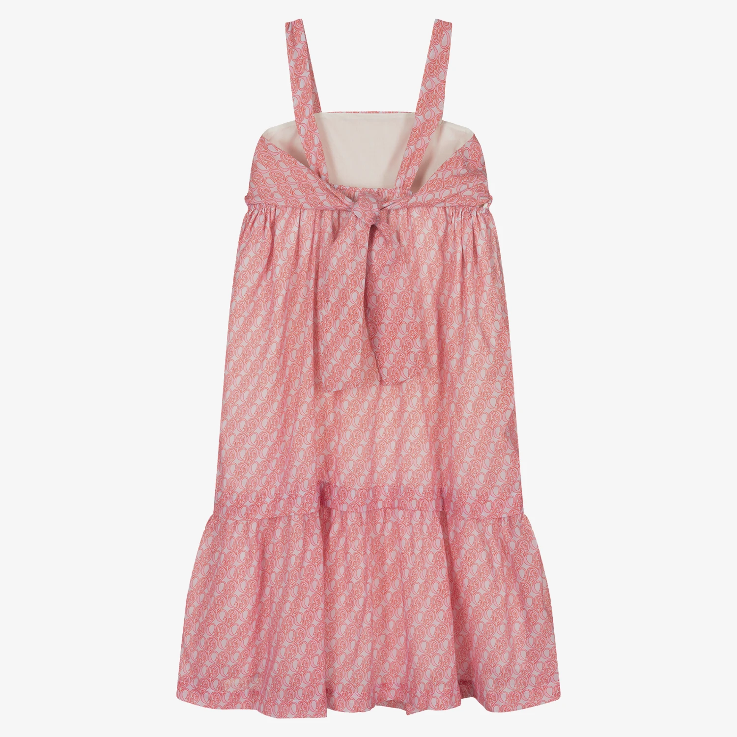 Lovely lilac purple midi dress for teen girls by French brand Chloé. Made and lined in luxuriously soft and lightweight cotton voile, it has an all-over Chloé Hearty logo pattern in pink and red. Panelled across the chest, the low back is gently elasticated and has a cut-out look with a pretty bow to tie.