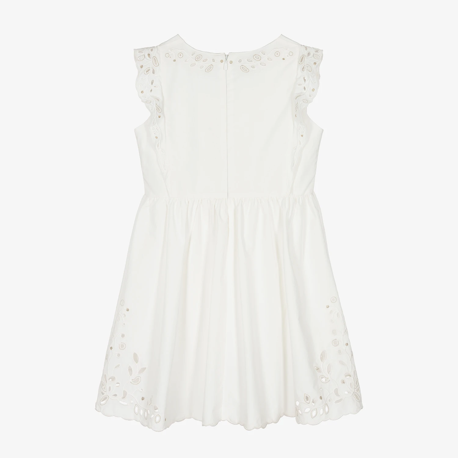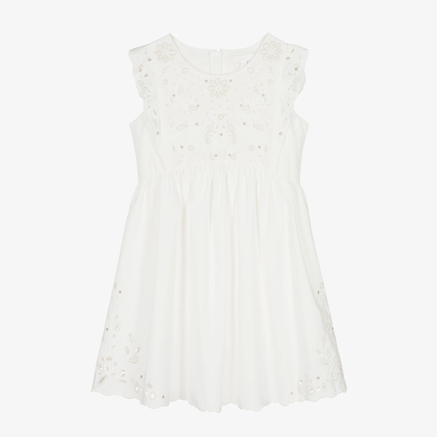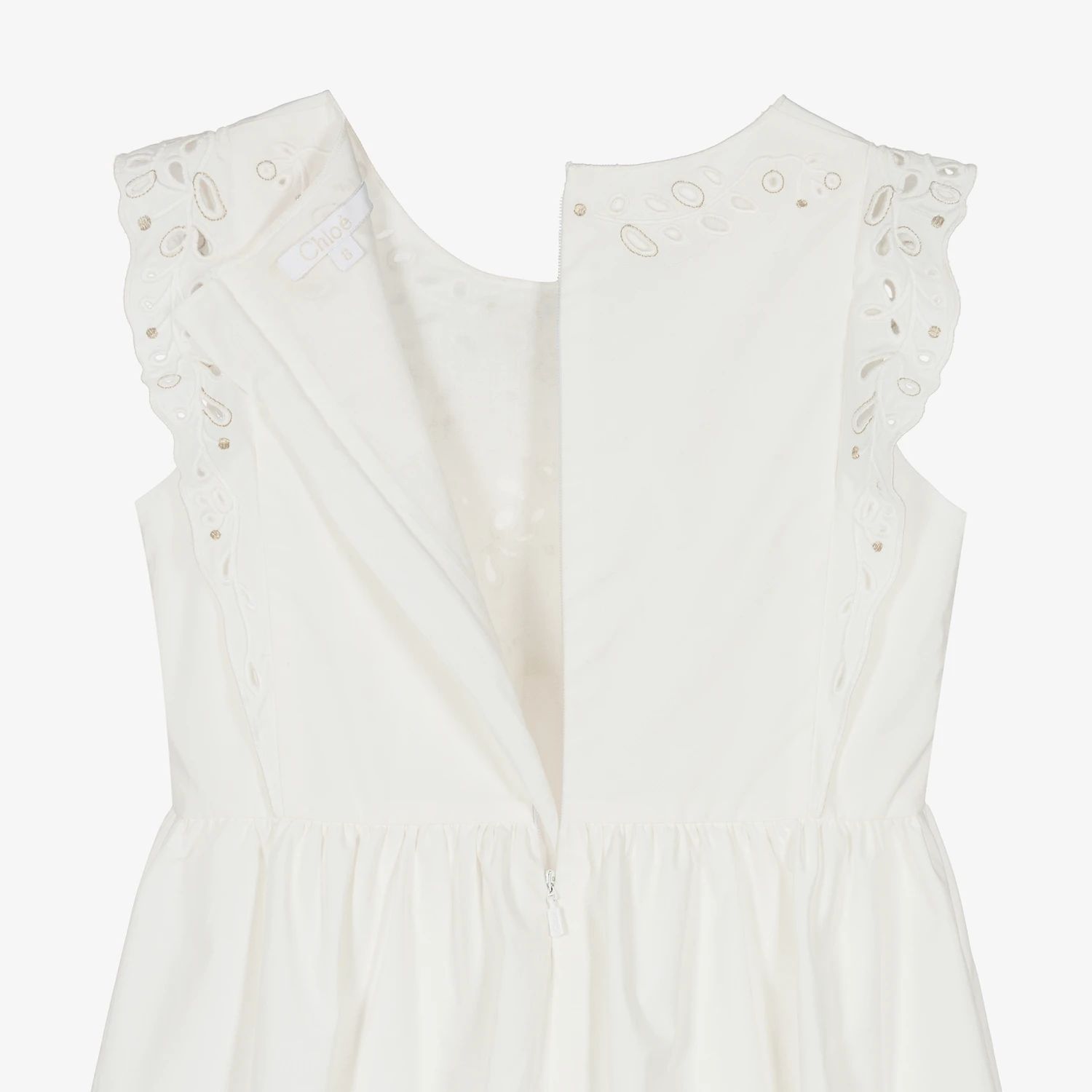 Gorgeous ivory organic cotton dress for teen girls by luxury French designer Chloé, inspired by the main collection. The front panel, shoulder ruffles and corners of the scalloped hem have beautiful floral broderie anglaise, sparkling with gold thread. Made in soft poplin, it has the brand’s signature logo is subtly embroidered on one side. It is fully lined for comfort and fastens with a neat, concealed zip around the back.