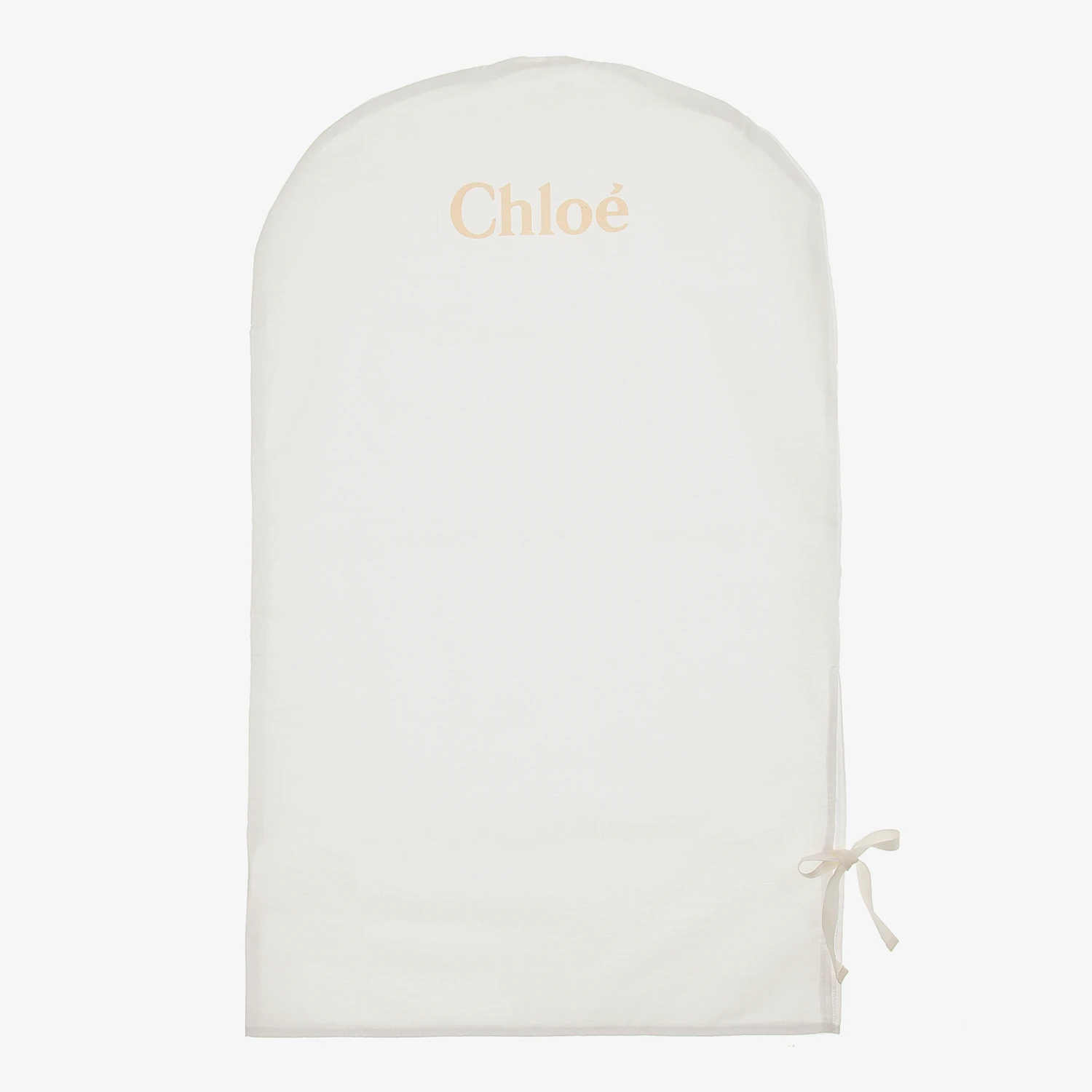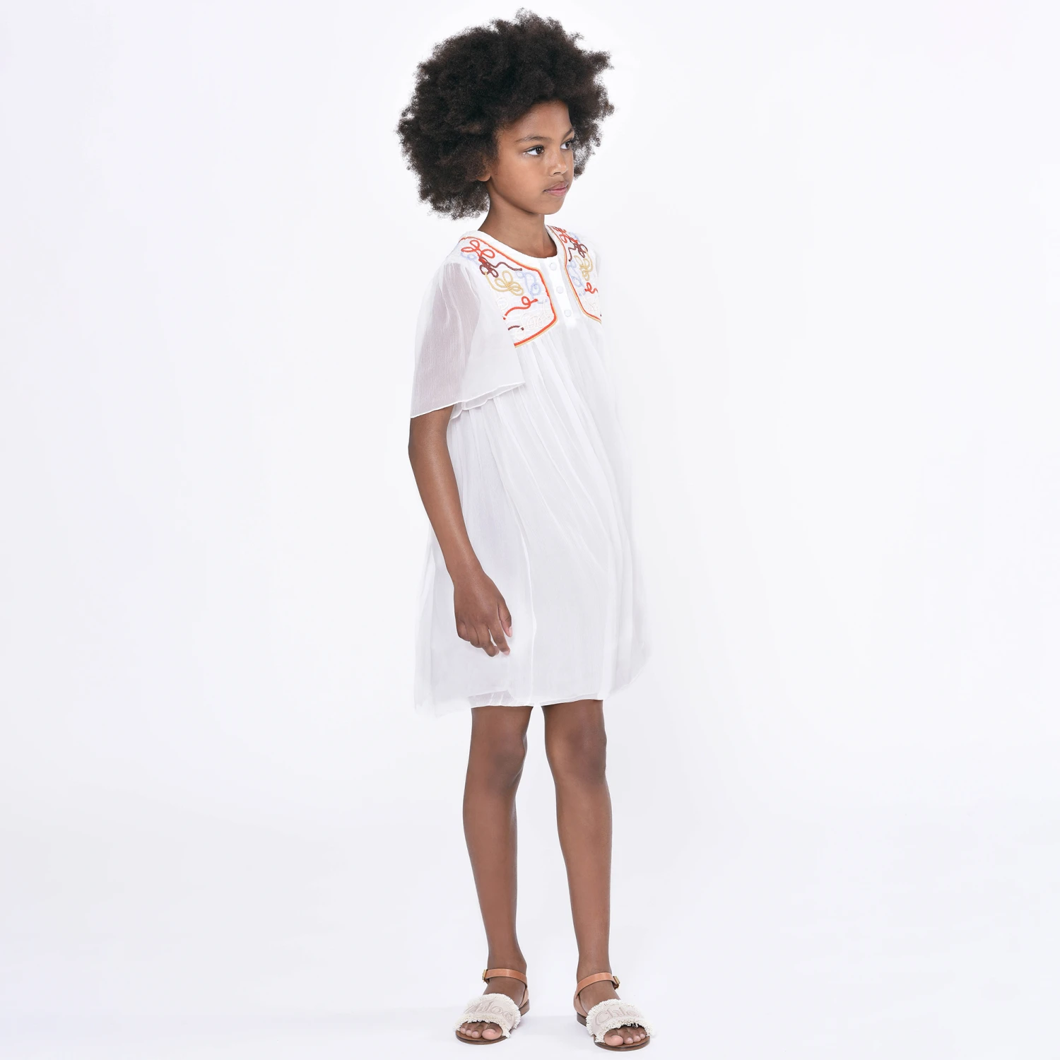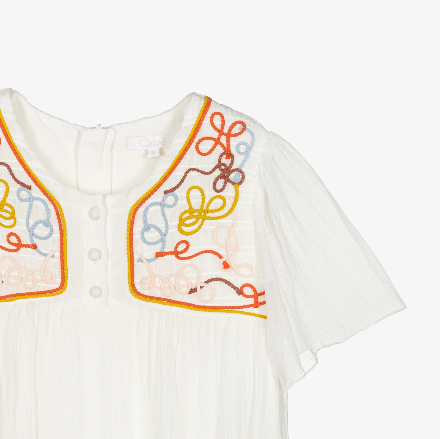 As seen in the main collection, a beautiful special occasion ivory chiffon dress for teen girls by luxury French designer Chloé, with a feminine, floaty feel. Made in luxurious, textured silk, it has colourful ribbon-effect appliqués on the front and back of the shirred bodice, with gathers below. The sheer sleeves are gently gathered and the dress fastens with buttons on the front and a neat, concealed zip around the back. It is fully lined for comfort and has a tonal logo embroidered by the hem for a discreet branded touch.