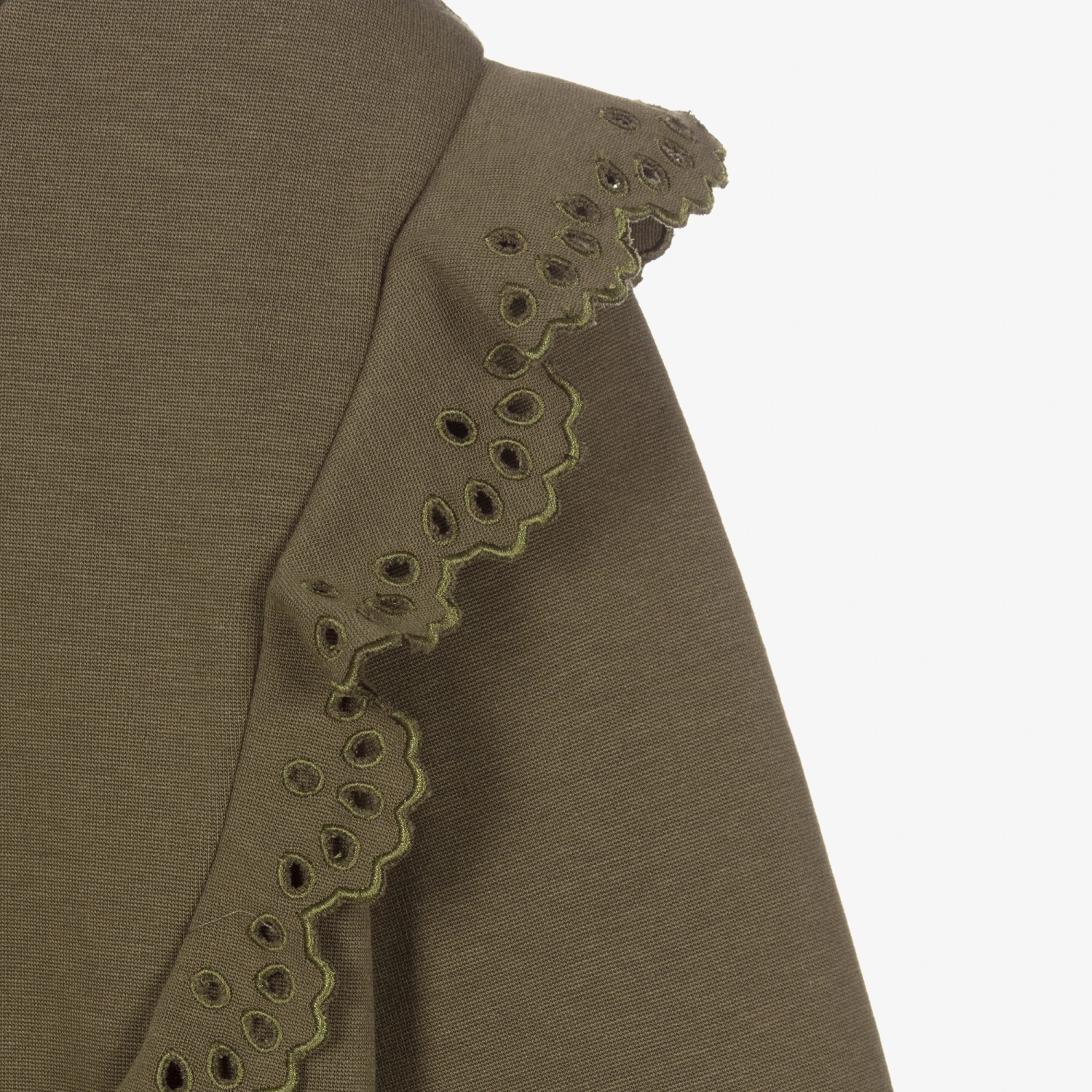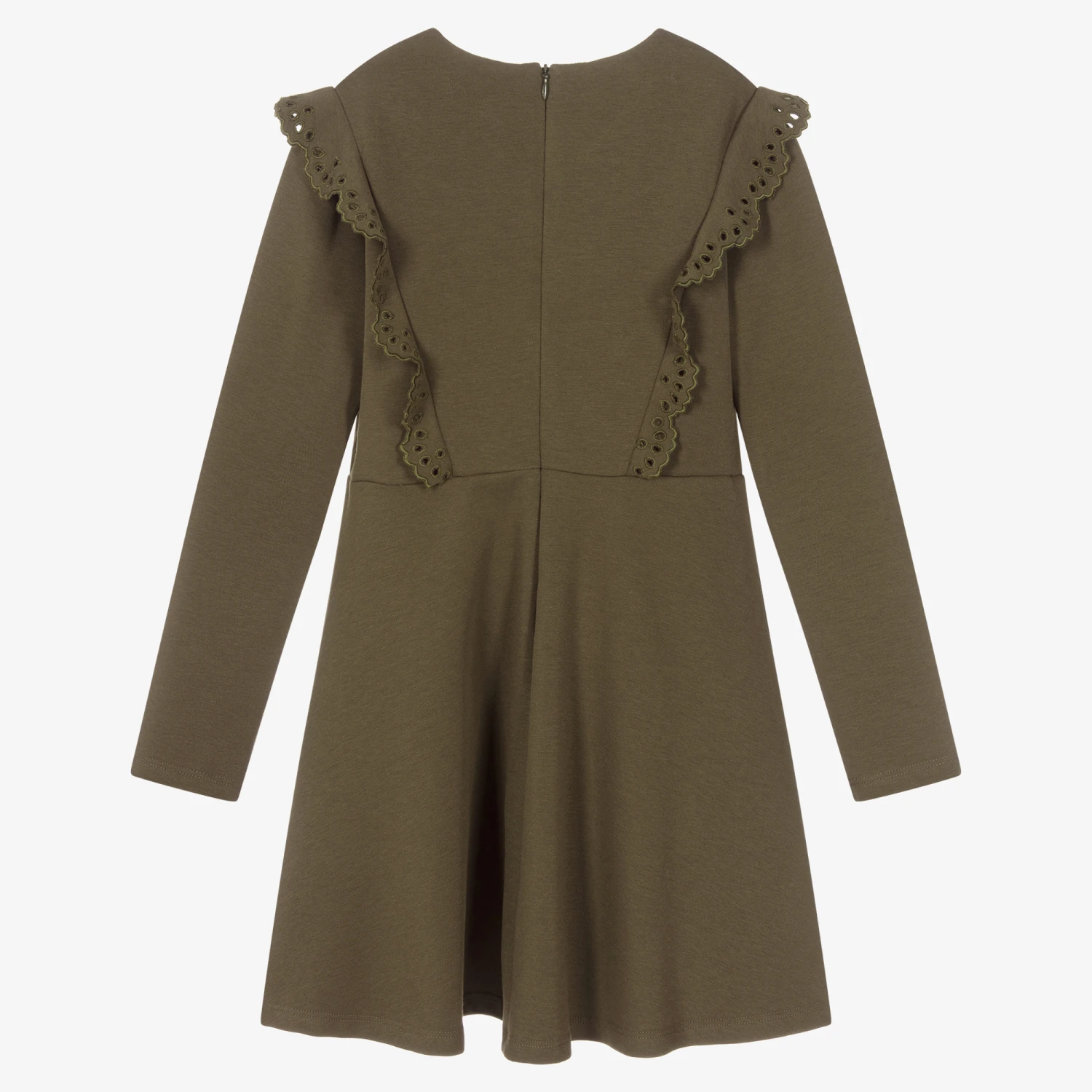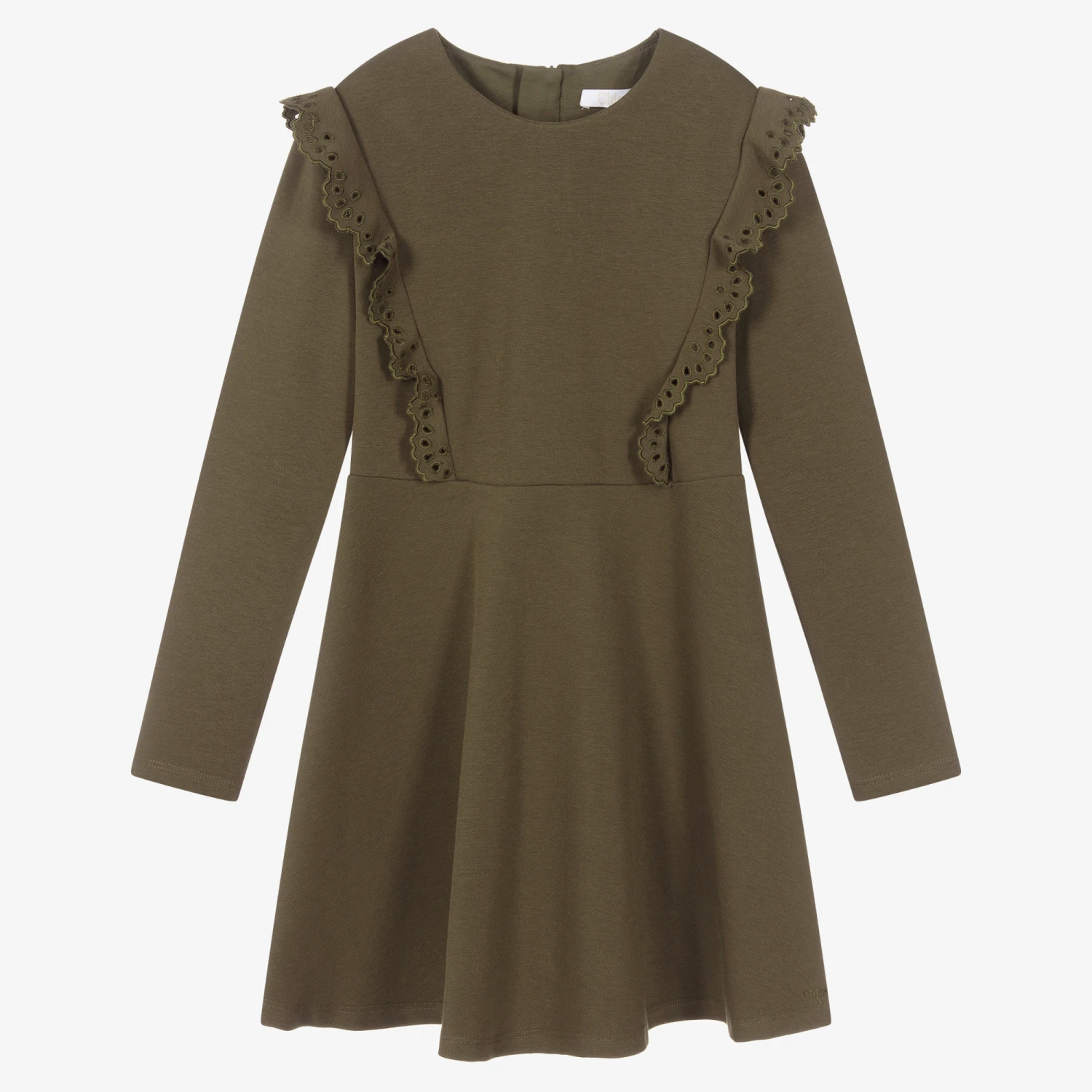Pretty khaki green dress for teen girls by luxury French designer, Chloé. Trimmed with gorgeous ruffles on the bodice with intricate floral cut-out details, it has a subtle logo embroidery near the hem, and is made in a soft modal jersey blend.