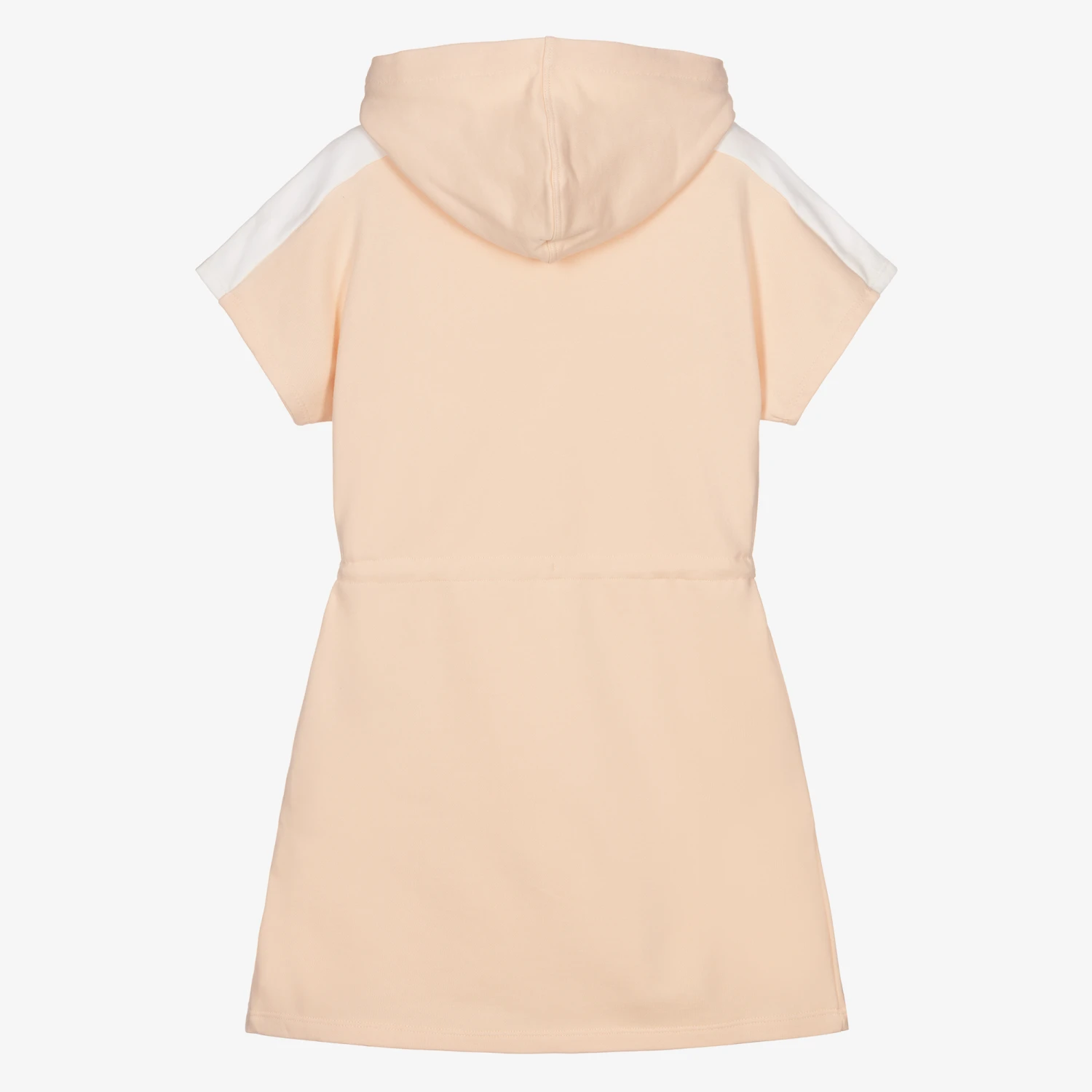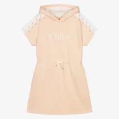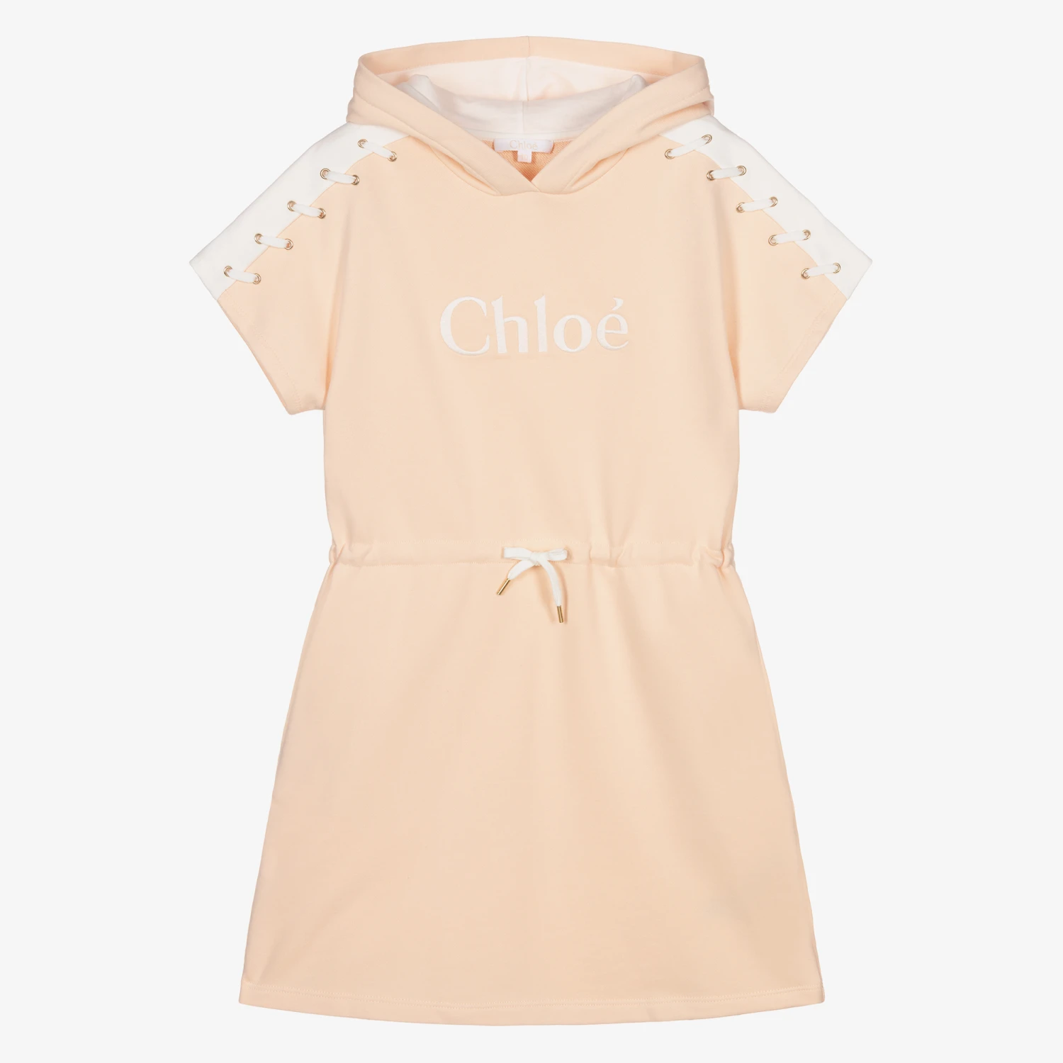 Peach-pink dress for teen girls by luxury French designer Chloé, made in soft organic cotton sweatshirt jersey. There is a large embroidered white logo on the chest and has a chic drawstring waistband. The sleeves have white stripes with lacing details and gold metal eyelets. It also has useful concealed side pockets.