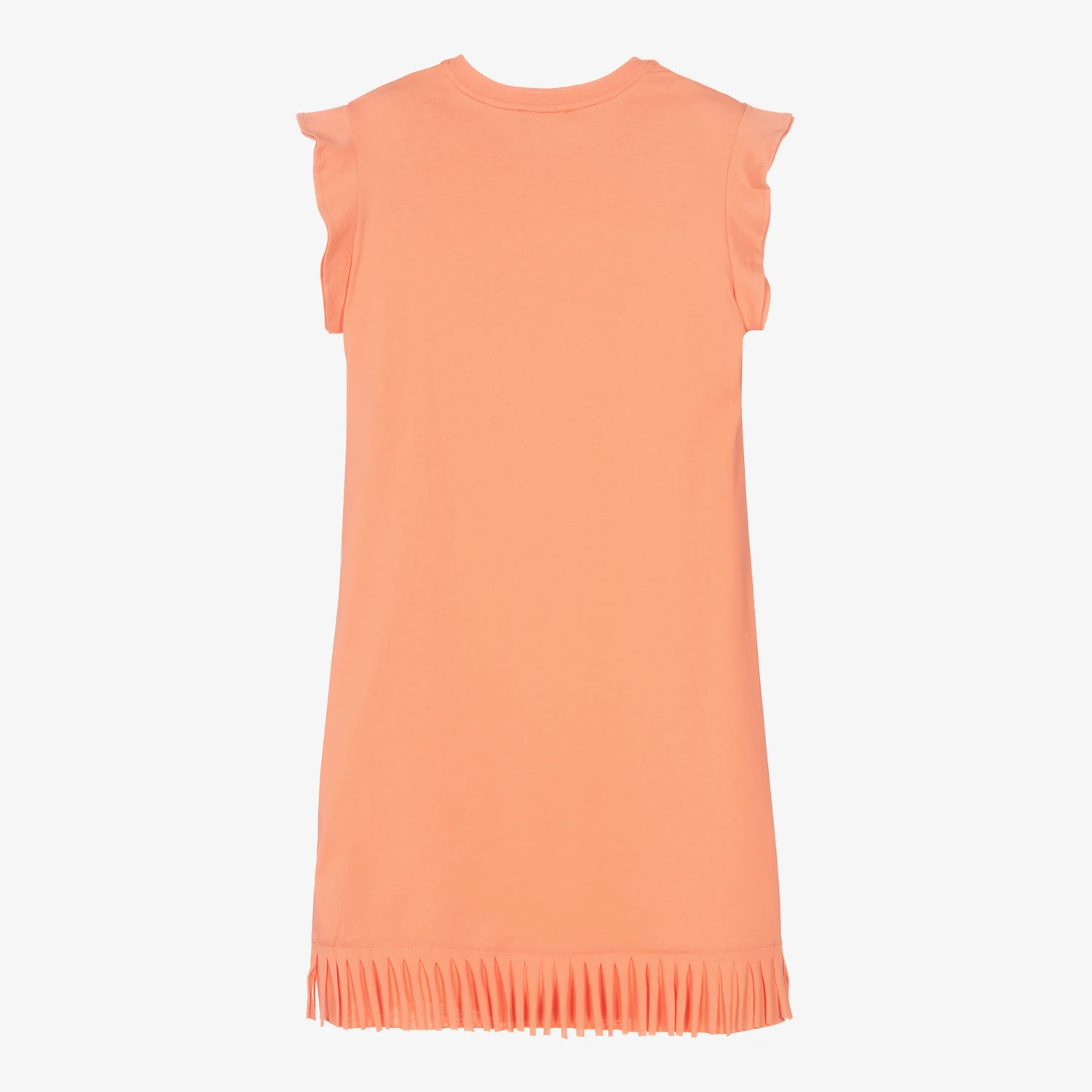Casual coral pink T-shirt dress for teen girls by French label Chloé, with cute fringe detailing around the hem. It has a logo print in colourful stripes outlined in gold on the front. Soft and comfortable in a straight fit, it is made in organic cotton jersey with little frilled sleeves.