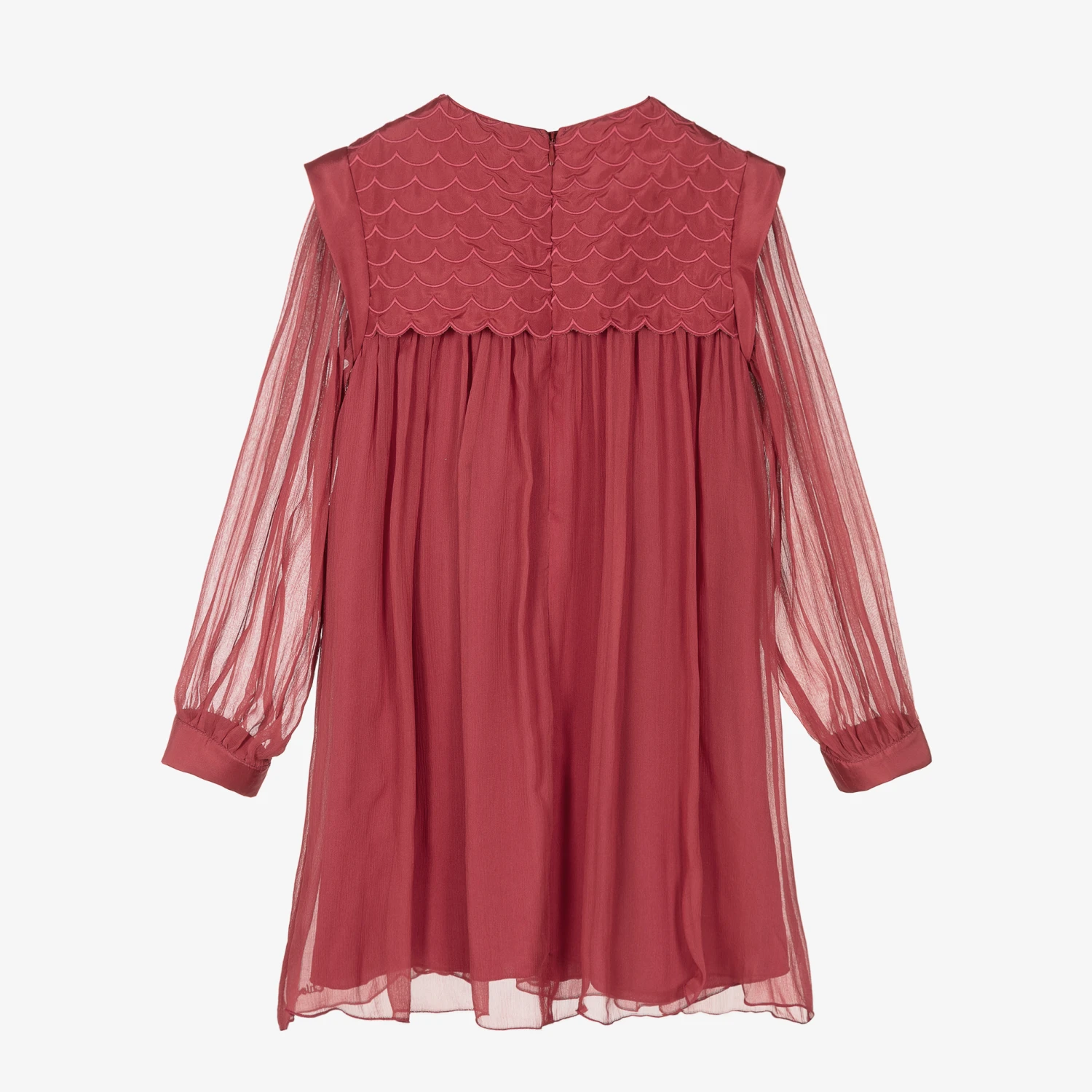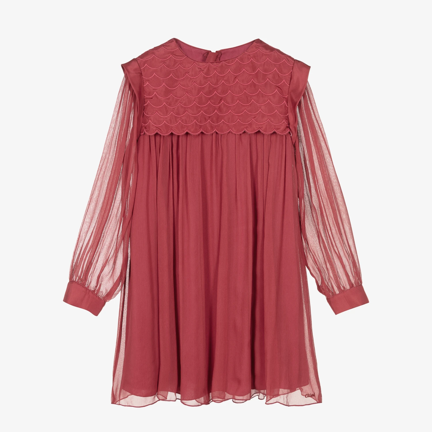 Terracotta pink dress for teen girls by luxury French designer Chloé, made in beautifully soft, sheer silk chiffon. The silk satin bodice is detailed with scalloped embroidery. The skirt is softly pleated and the hem is discreetly embroidered with the brand’s logo. Fully lined in soft viscose voile, it fastens with a concealed zip on the back.