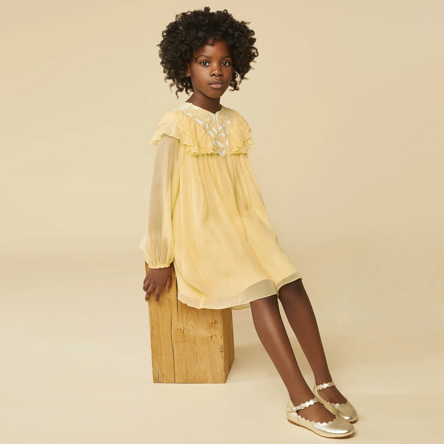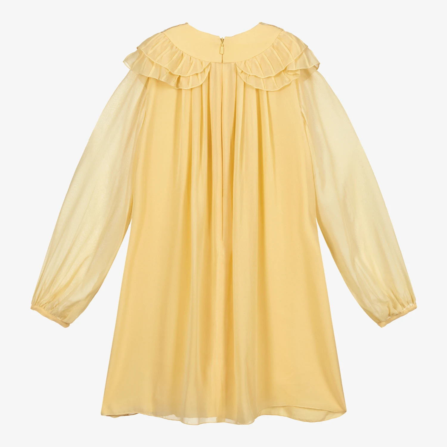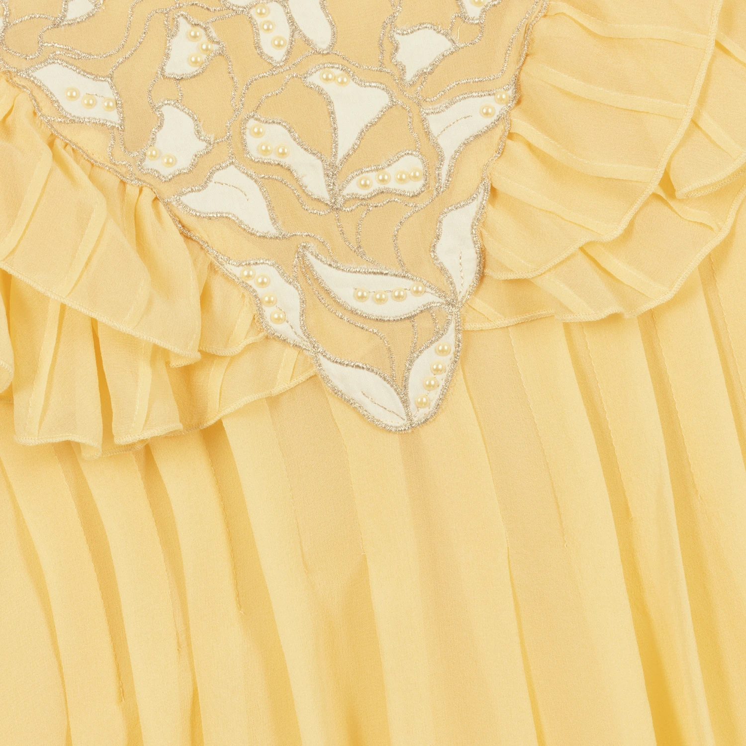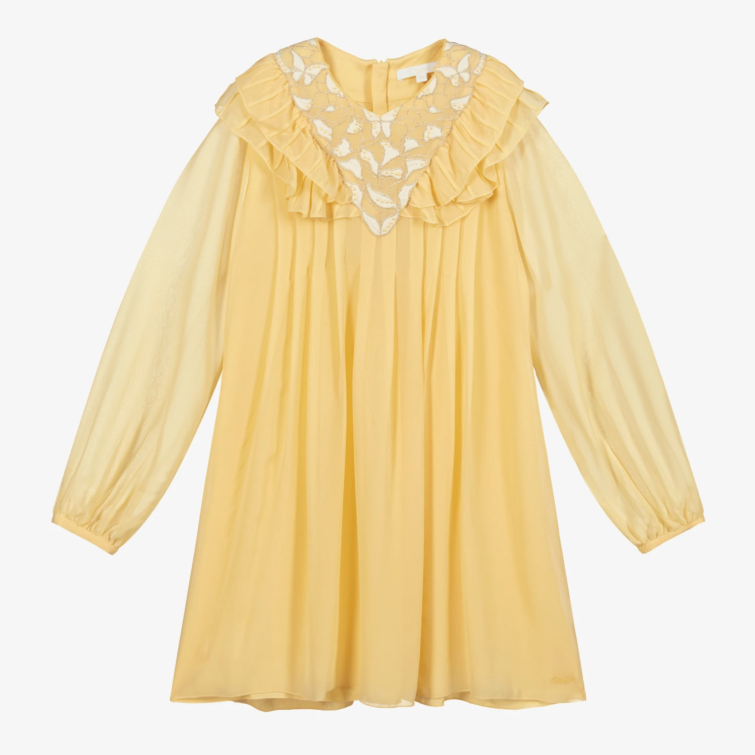 Yellow couture silk dress for teen girls, directly inspired by the adult collection, by luxury French designer Chloé. Featuring the brand’s logo embroidered near the hem and a logo zip fastening, the dress is made in lightweight silk crêpe with a soft viscose lining. It has a stylish V-shaped panel on the bodice with a butterfly design in ivory silk and gold embroidery, embellished with pearls, and a pretty frilled trim.
