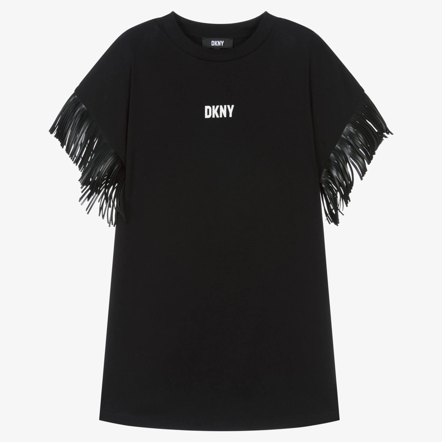 Black cotton dress for teen girls by DKNY, made in stretchy and comfortable jersey. Designed with a relaxed silhouette, this cool laid-back dress has dropped-shoulder sleeves with edgy black faux leather fringing. Stamped on the front is the label’s signature white logo for a little extra designer appeal.