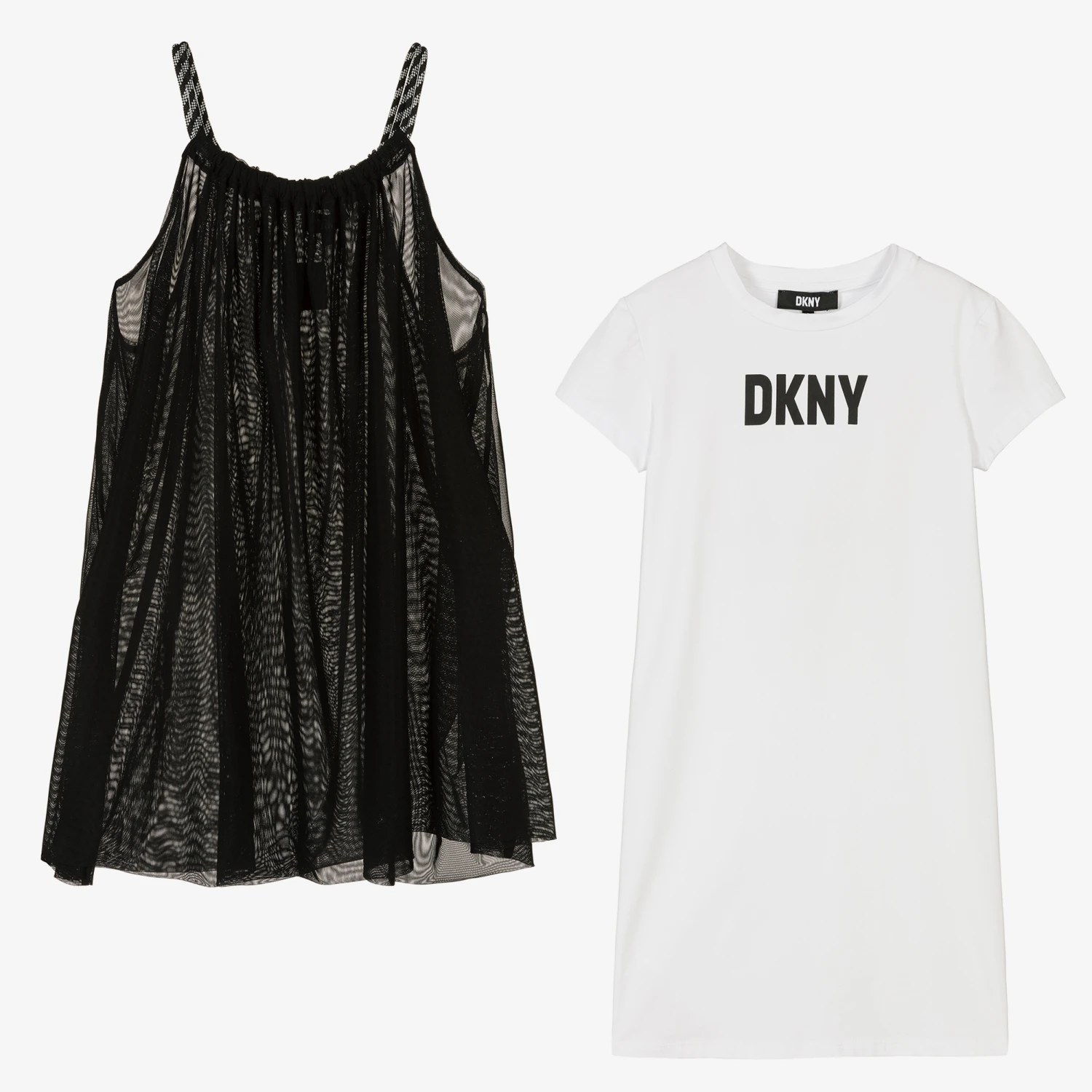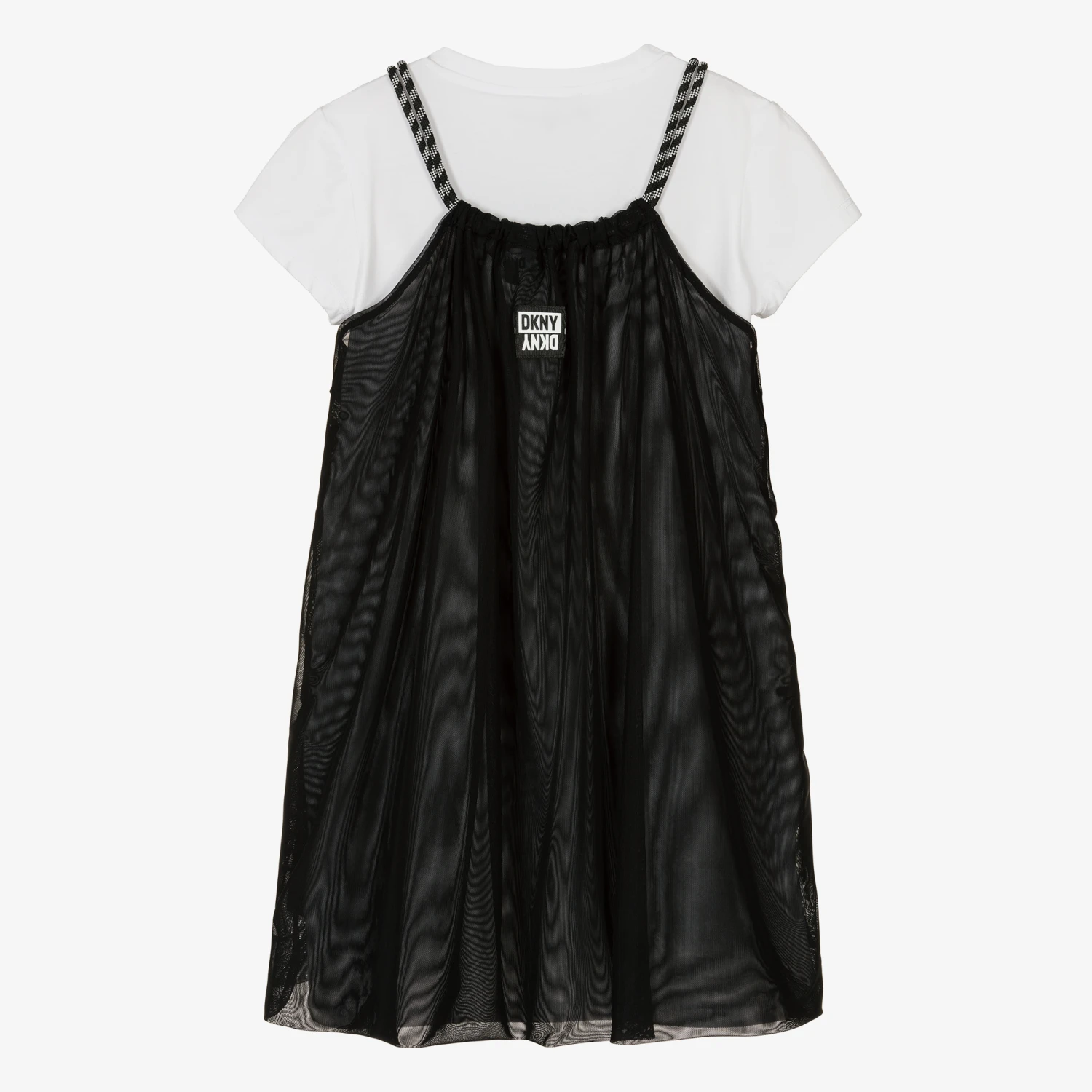 Black and white 2-in-1 dress for teen girls by DKNY. Girls can mix and match with the white stretchy T-shirt dress, cut for a slim fit with a distinctive black logo print on the chest. It is worn with a dress overlay in sheer black mesh, designed with a square logo patch on the back and drawstring cord shoulder straps.