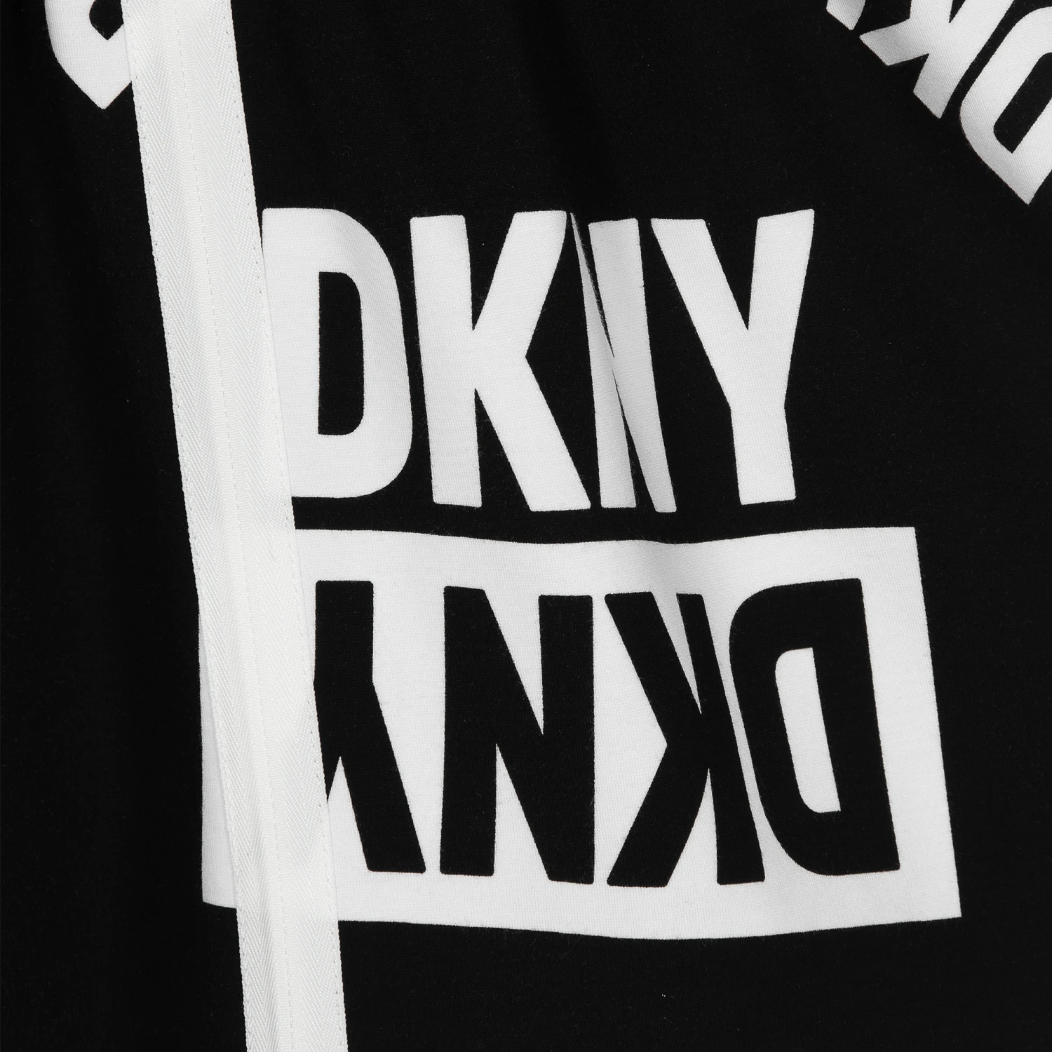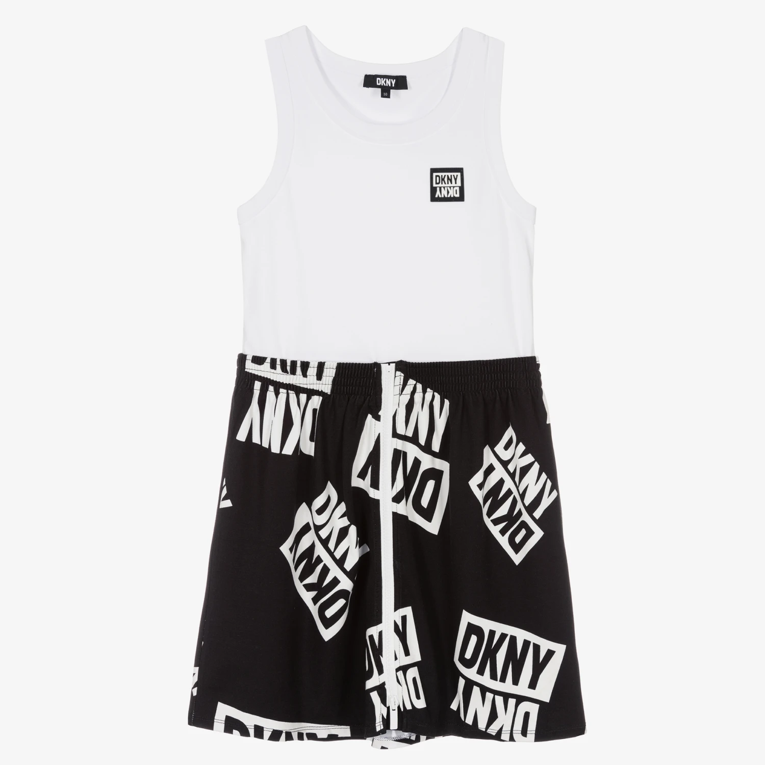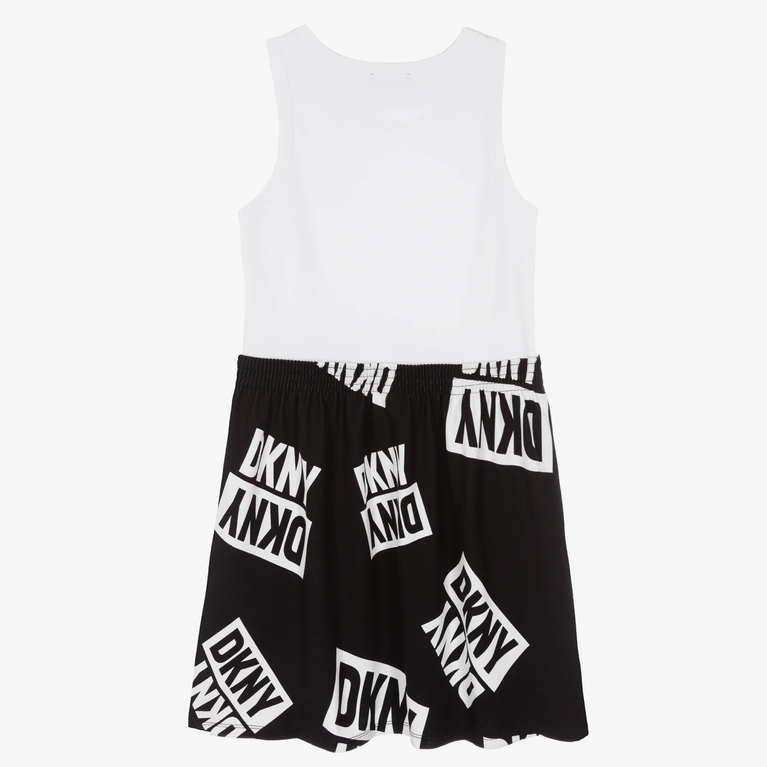 Black and white sleeveless dress for teen girls by DKNY, featuring an all-over logo print on the skirt for statement style. Made to look like a vest top and skirt, the stretchy jersey bodice has a rounded neckline and a coordinating rubberised logo patch on the chest. The contrast skirt has a stretchy shirred waist with a decorative zip on the front.