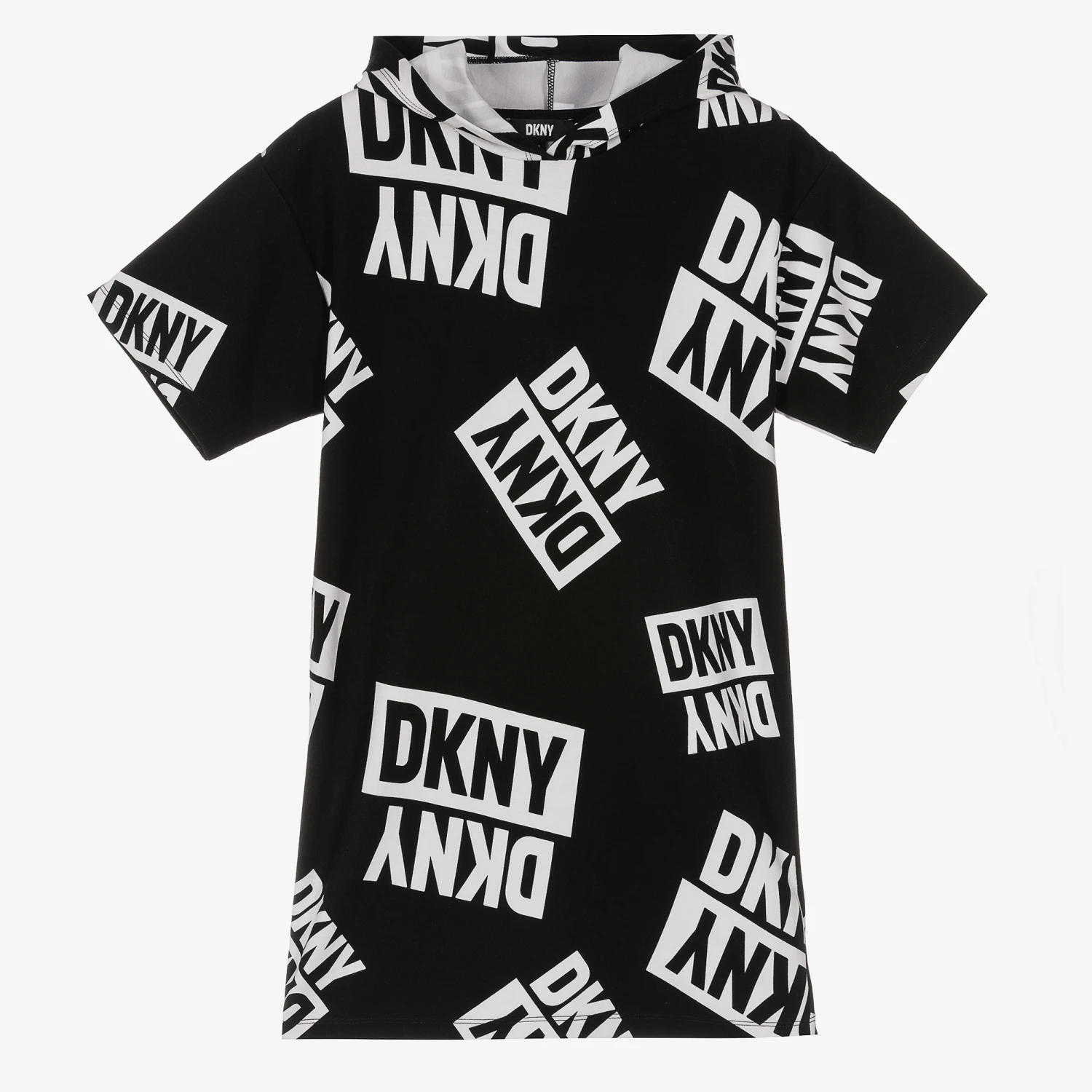 A statement black T-shirt dress for teen girls by DKNY, with an all-over flip and reflect white logo print. Made in soft Milano jersey, this straight-cut dress has a fixed hood and sits on the knee for a casual, laid-back look.