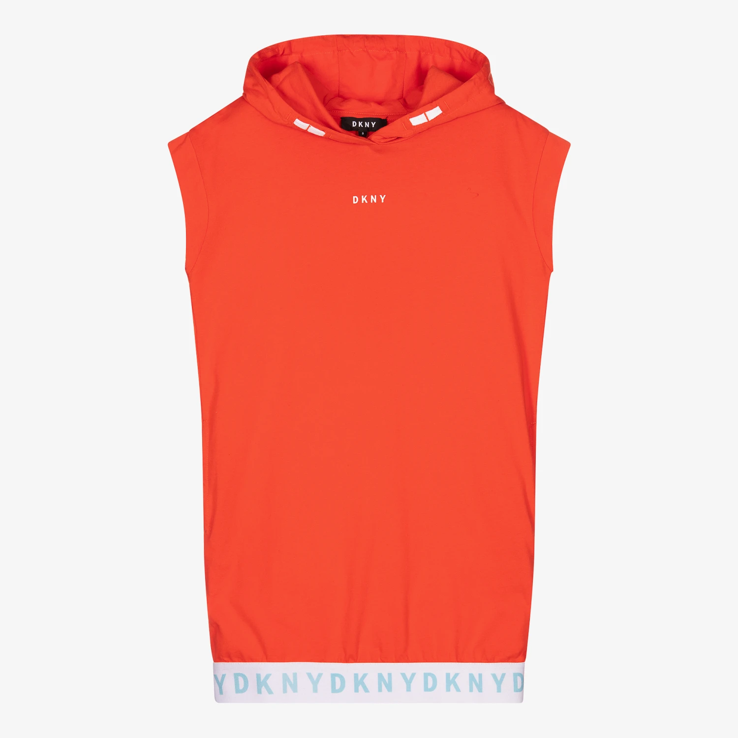 Red-orange cotton jersey dress for teen girls by DKNY with a white and blue logo trim hem. Lightweight, this sporty dress has a small white logo print on the front and a jersey lined hood. There are fixed white ties around the neck, and side seam pockets.
