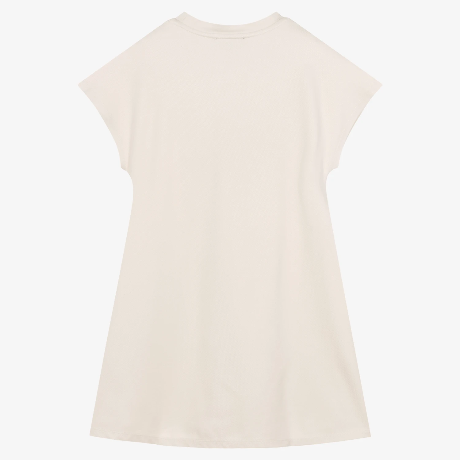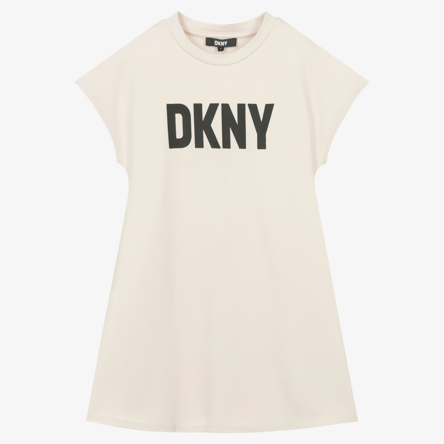 Chic pale beige dress for teen girls by DKNY, made in mid-weight jersey twill. Designed with a laid-back drape, this casual dress has a large black rubberised logo print on the front.