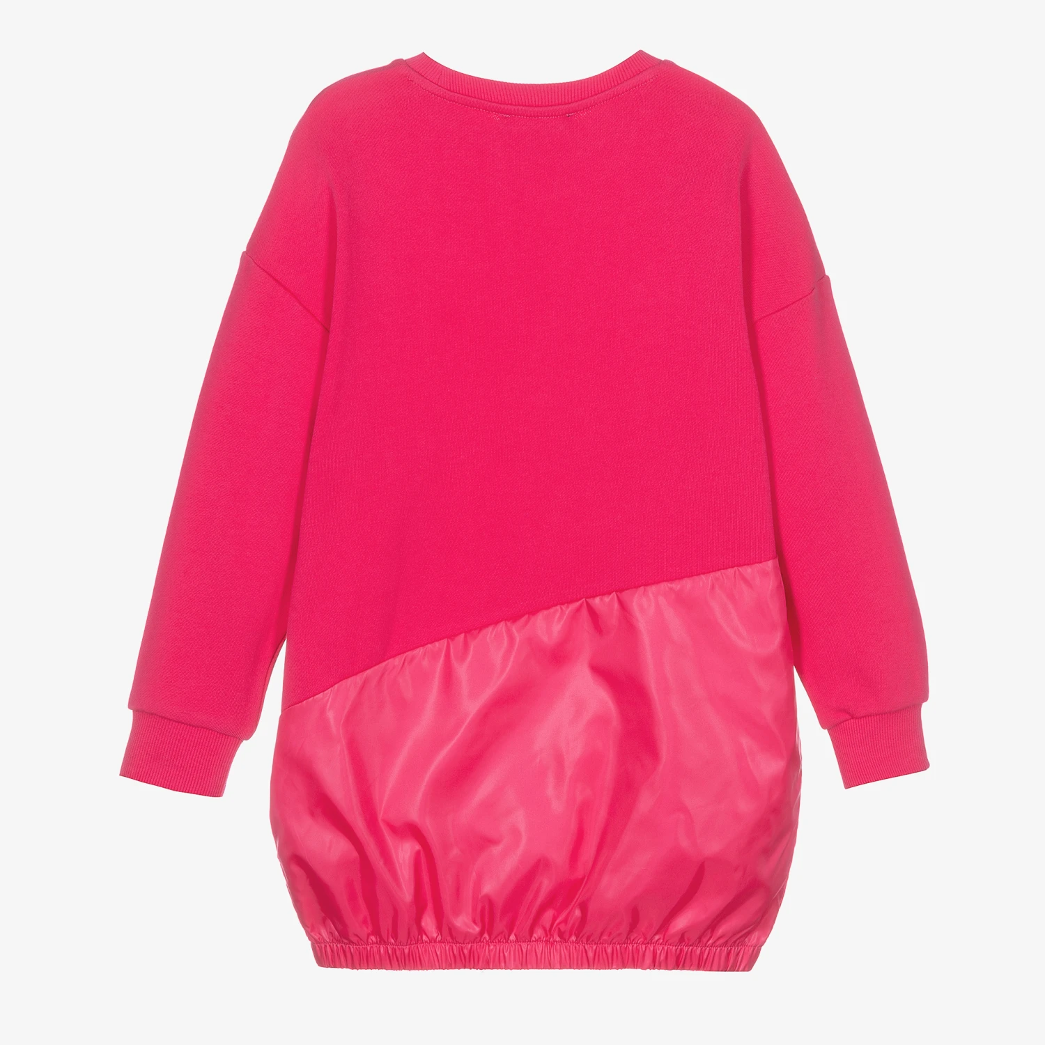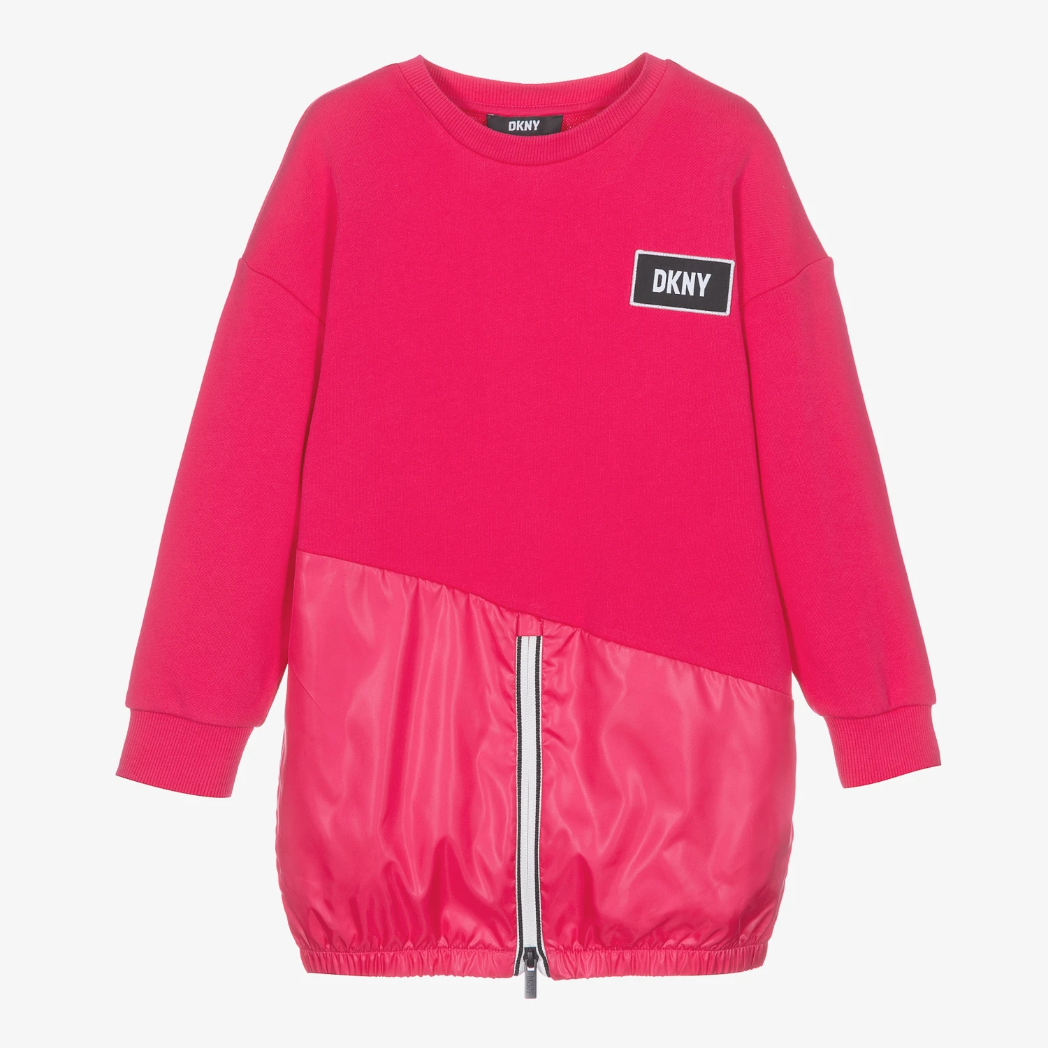 Bright pink dress for teen girls by American brand DKNY. Styled like a sweatshirt, it has a black and white logo badge at the chest and ribbed trims. The lower part is silky and lined in jersey for comfort, with black and white zip detailing on the front and an elasticated hemline.