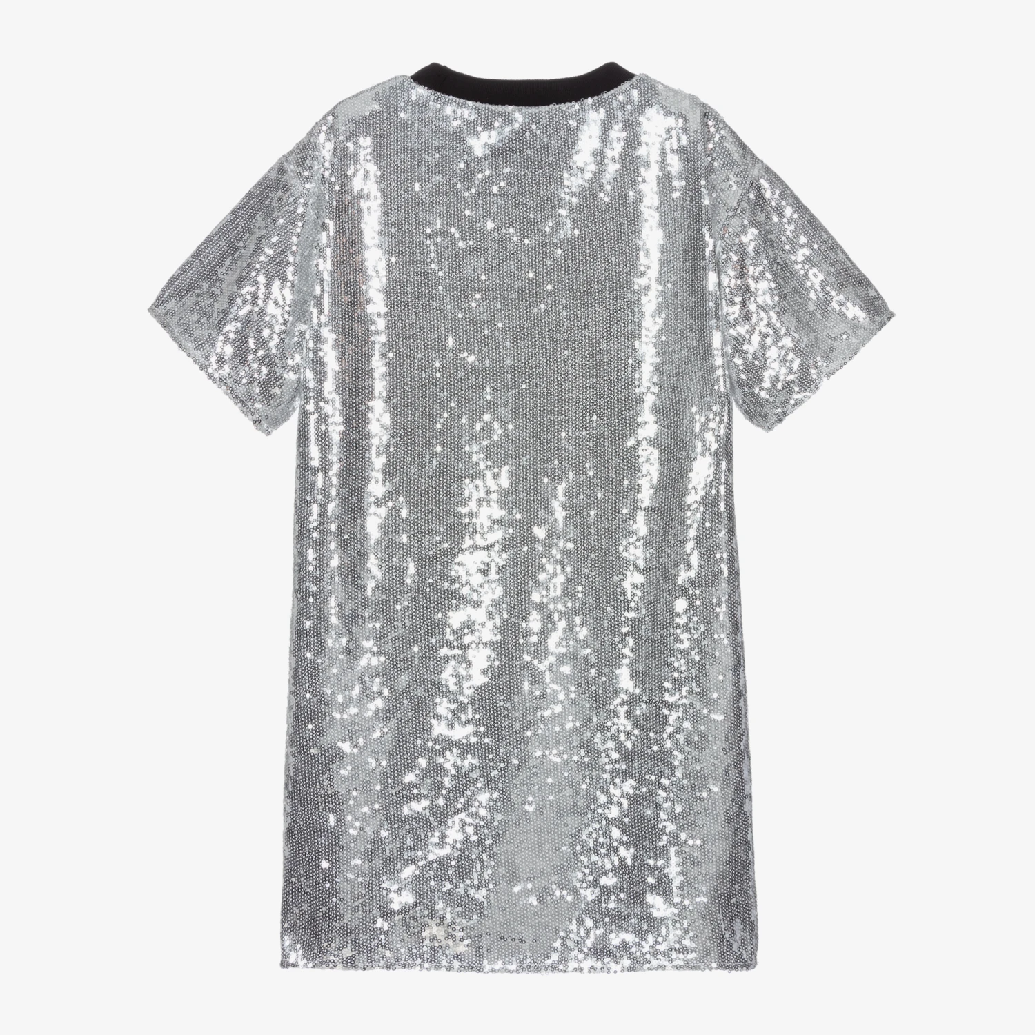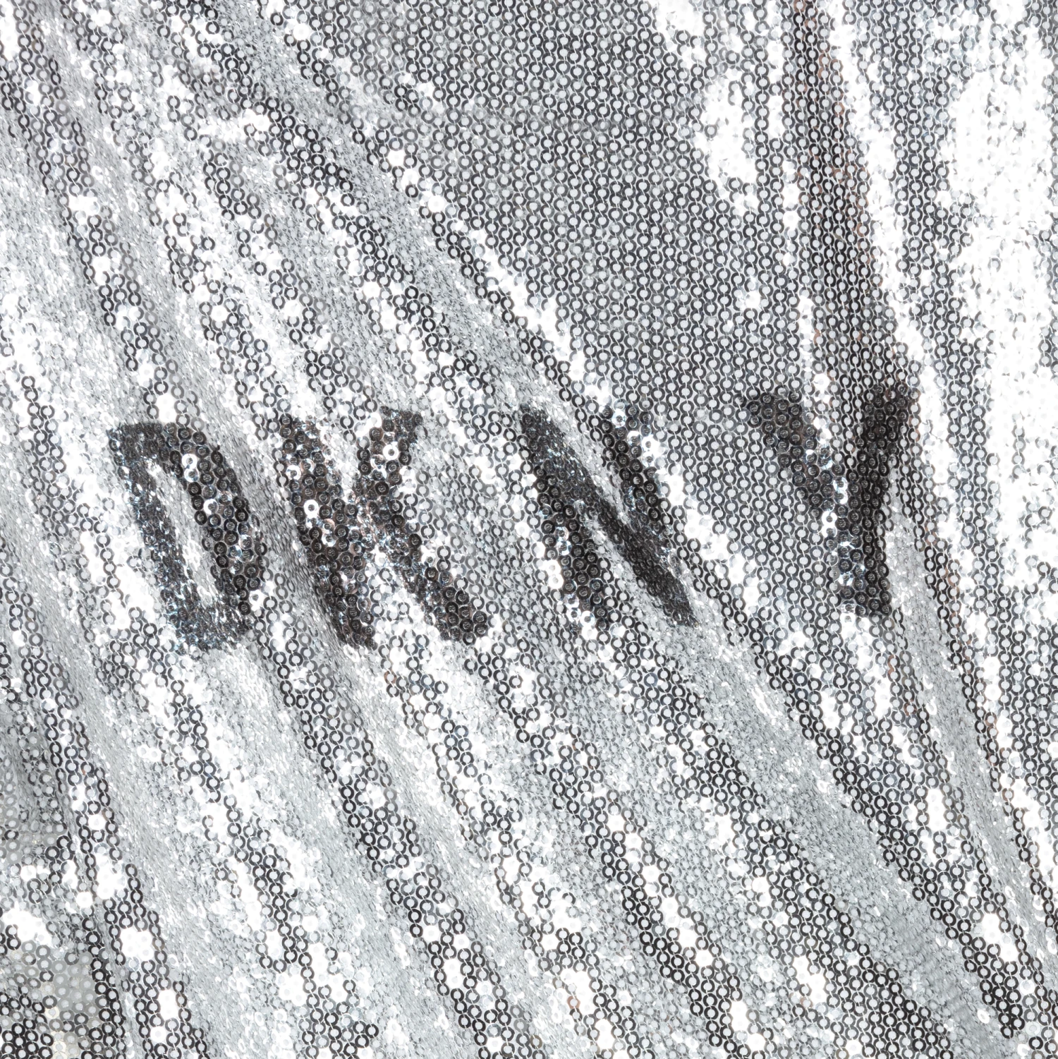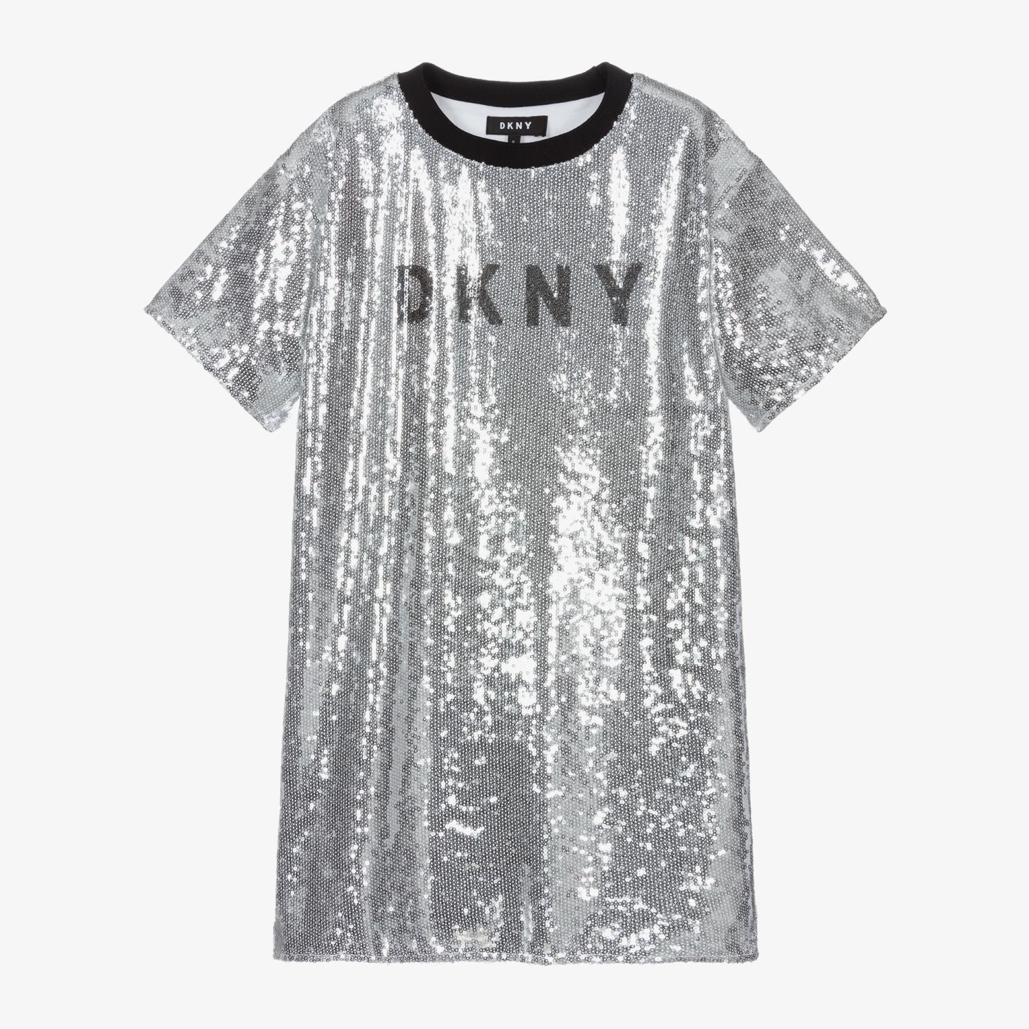 Edgy silver sequin T-shirt dress for teen girls by DKNY, trimmed with a black ribbed neckline. With a comfortable stretchy lining for comfort, it has a contrasting black logo print on the chest.