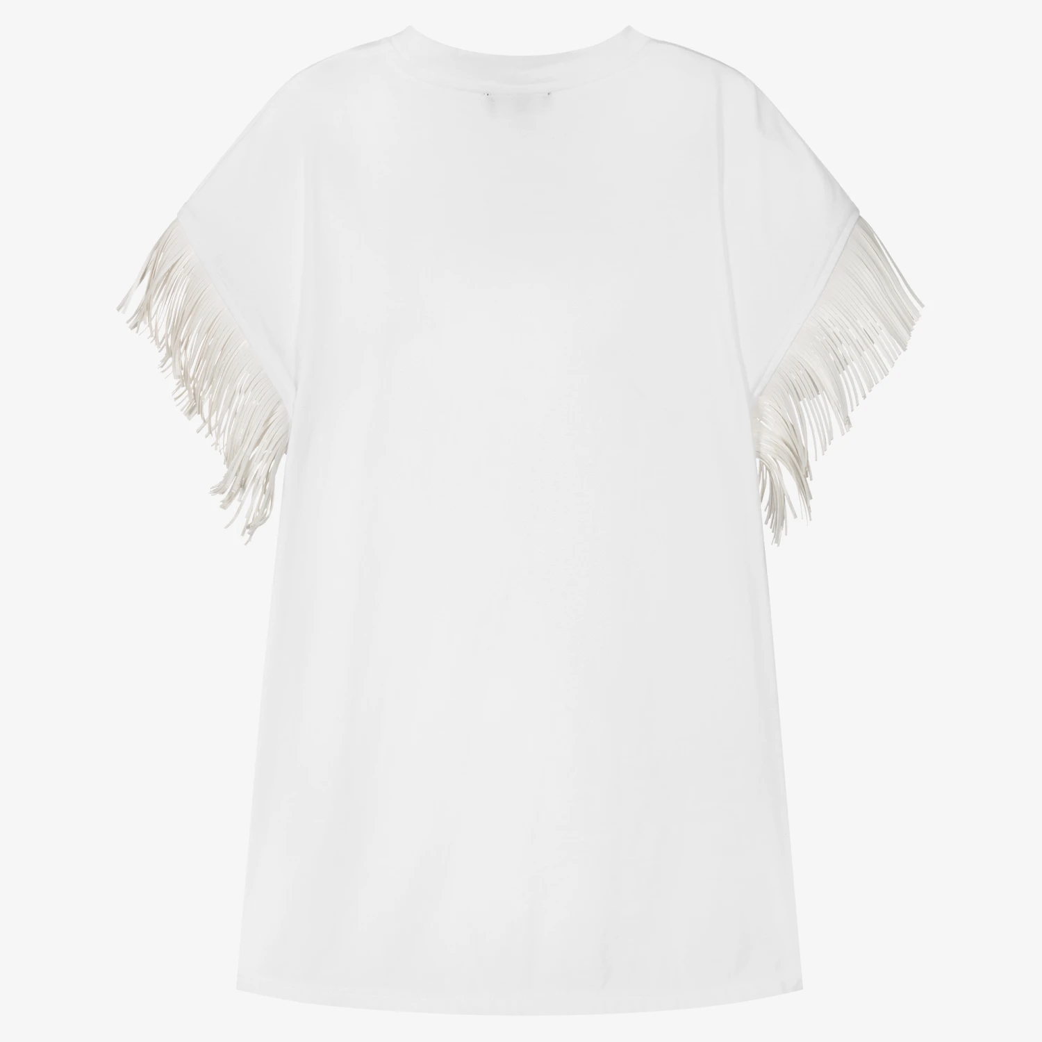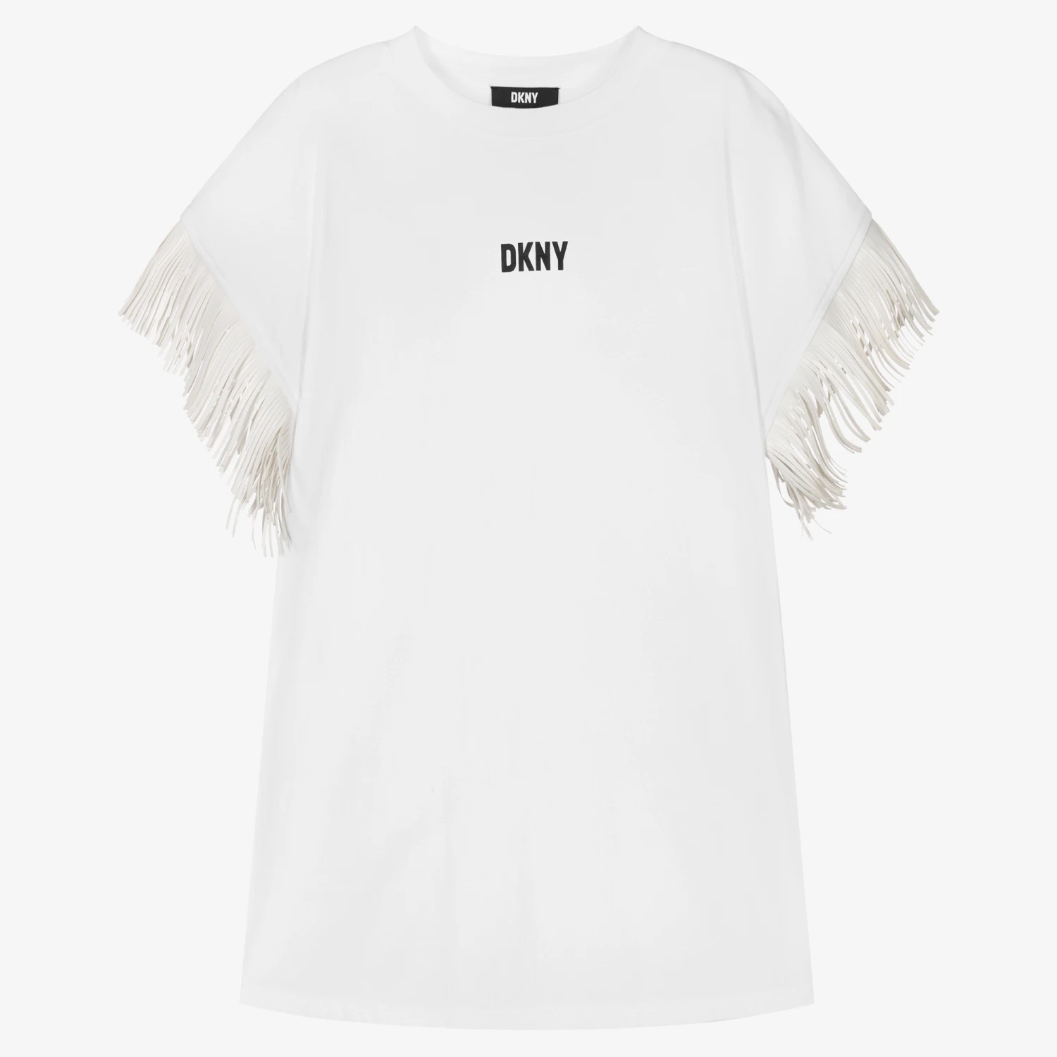 White cotton dress for teen girls by DKNY, made in stretchy and comfortable jersey. Designed with a relaxed silhouette, this cool laid-back dress has dropped-shoulder sleeves with edgy white faux leather fringing. Stamped on the front is the label’s signature black logo for a little extra designer appeal.