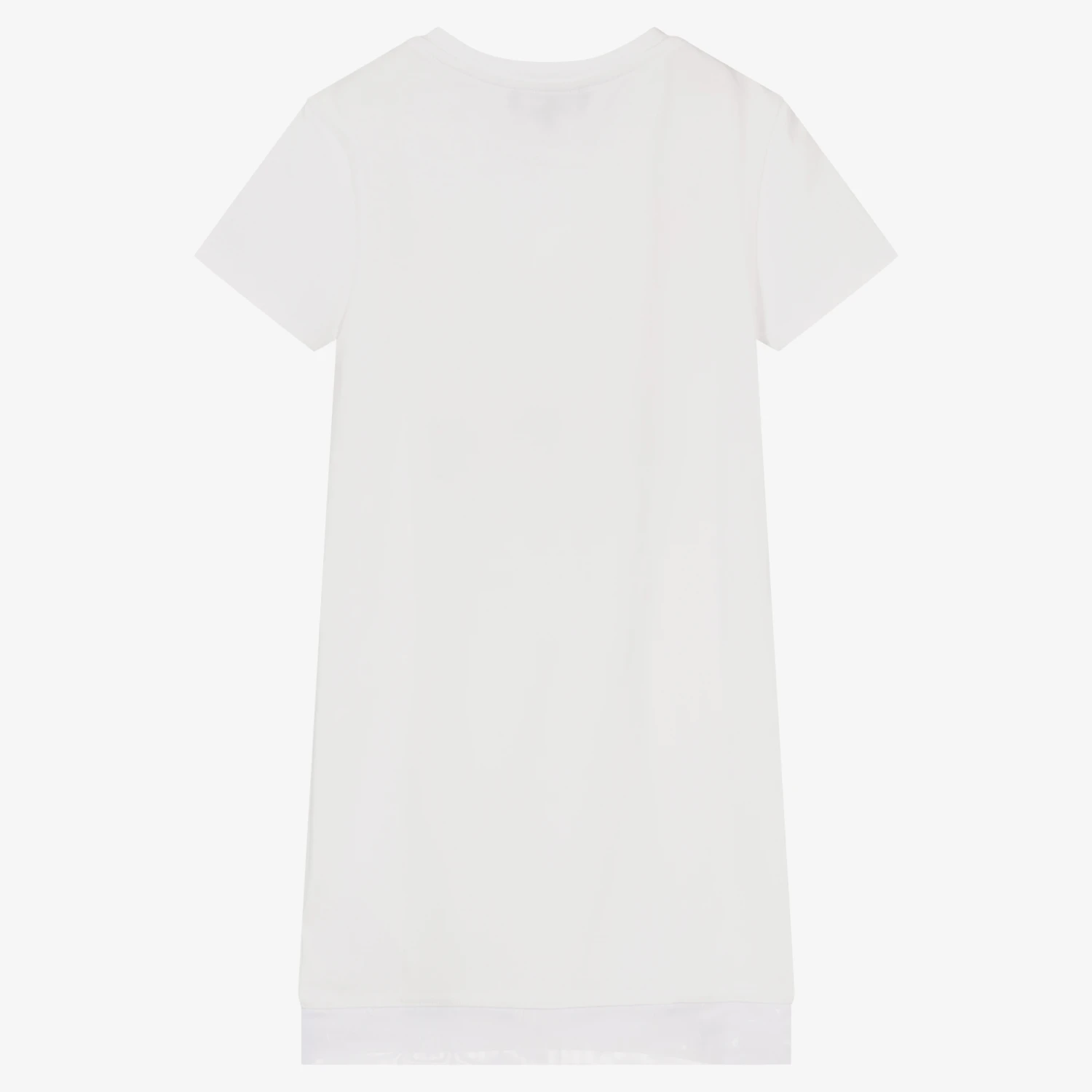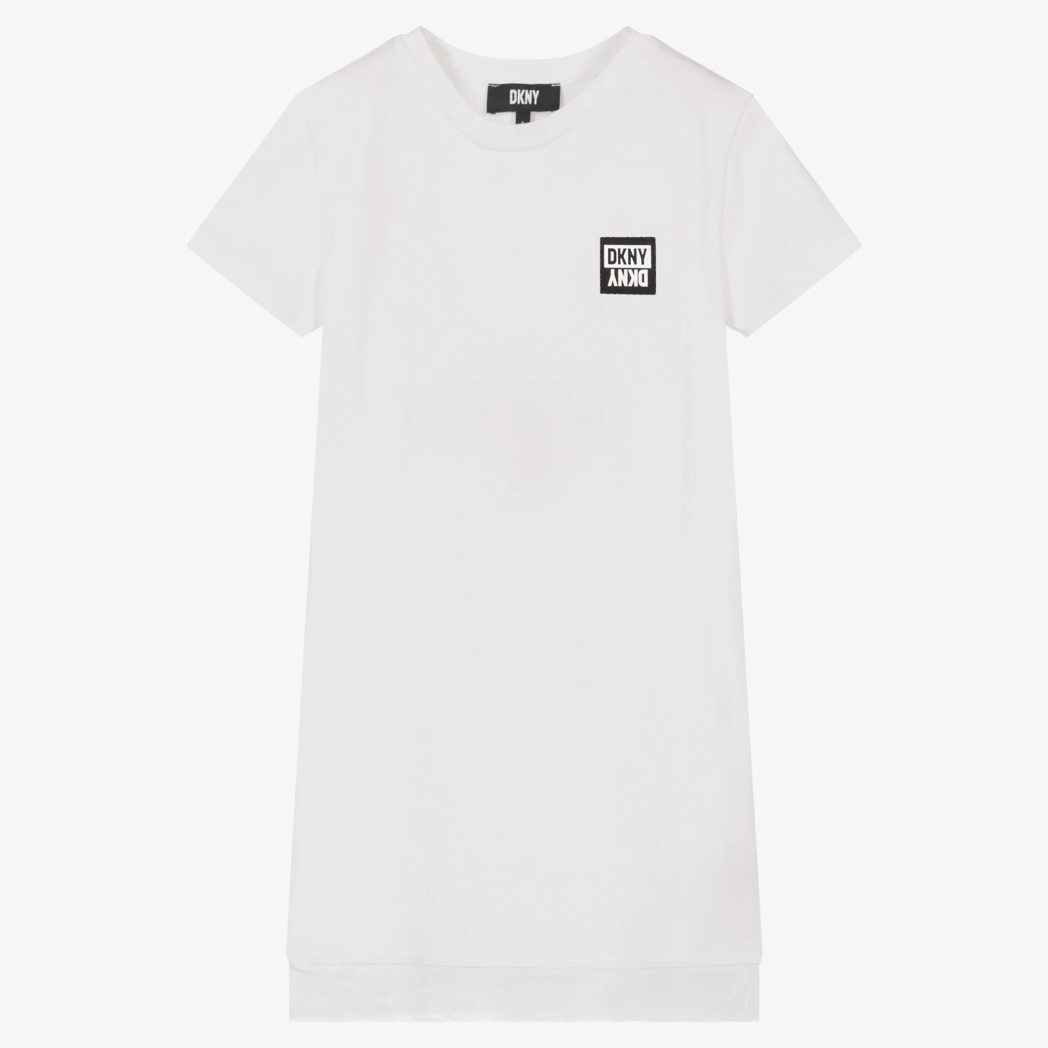 Casual white T-shirt dress for teen girls by DKNY, made in soft cotton jersey. It has trendy capped sleeves and a rubberised black and white logo patch on the front.
