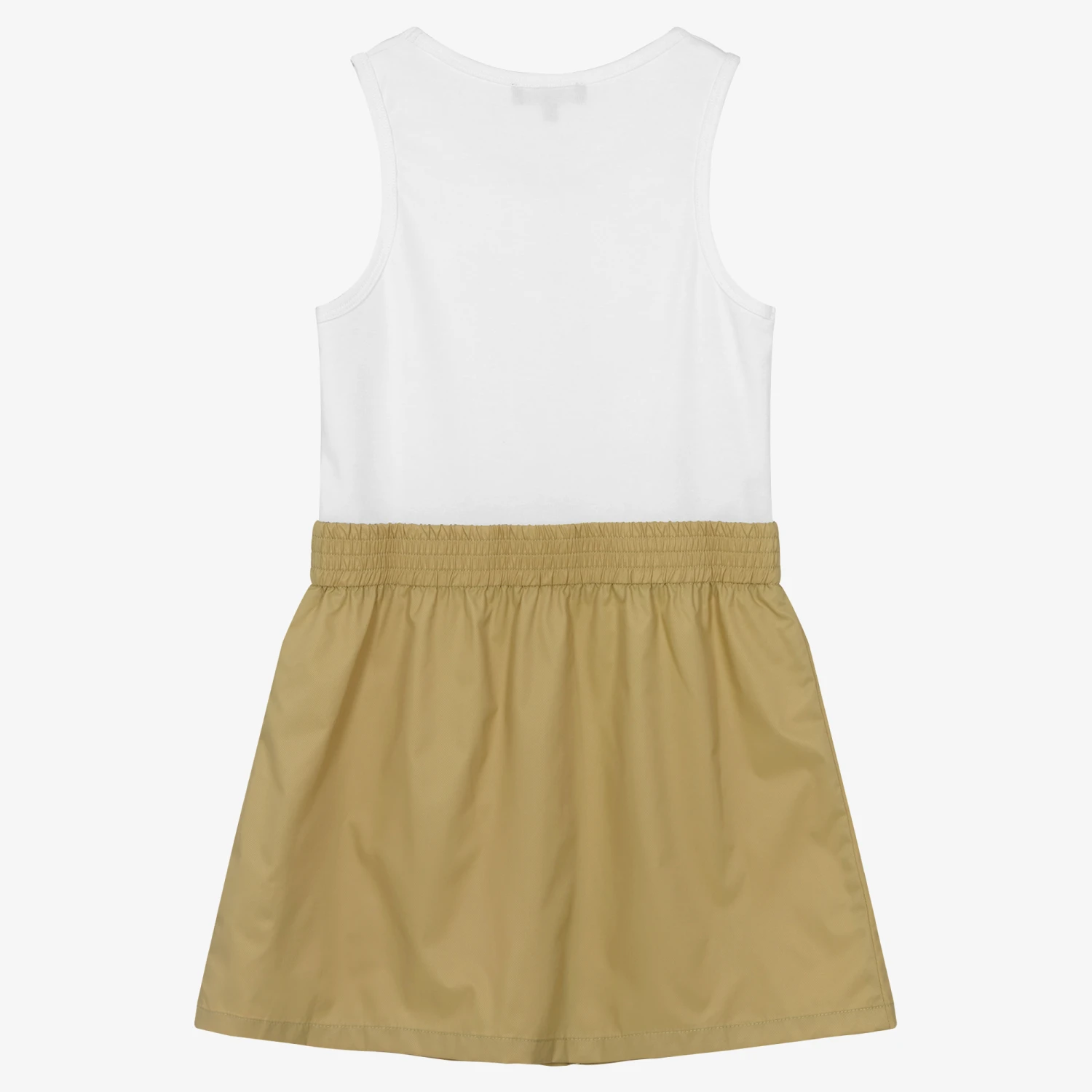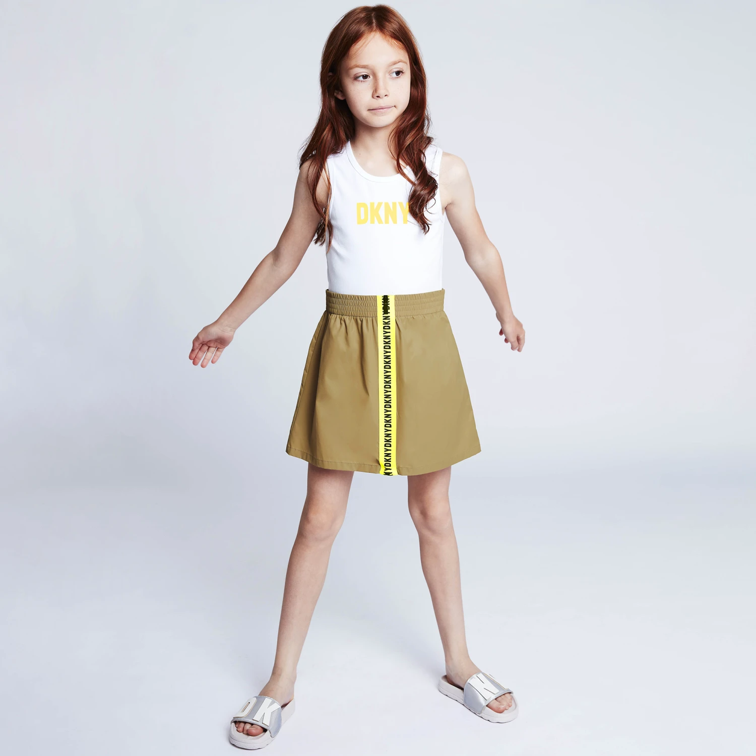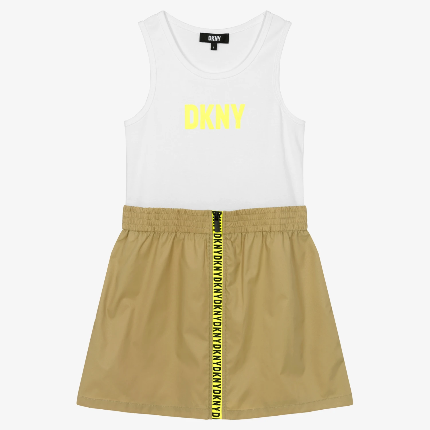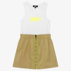 Stylish white and khaki green dress for teen girls from American brand DKNY. It is designed to look like a two piece vest and skirt, with a neon yellow logo print on the front of the jersey top half. The khaki green ‘skirt’ is silky and lightweight, with a matching neon yellow logo zip trim down the front.