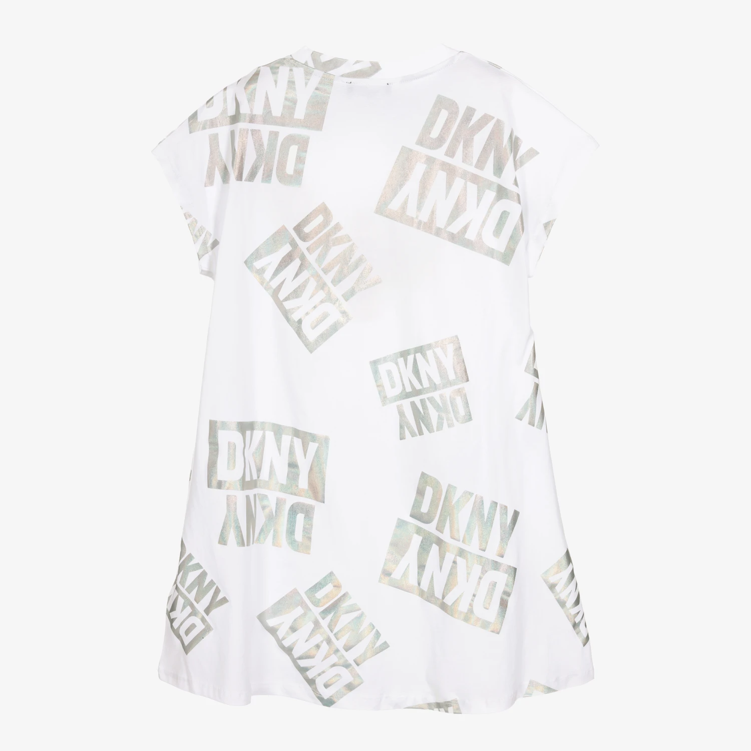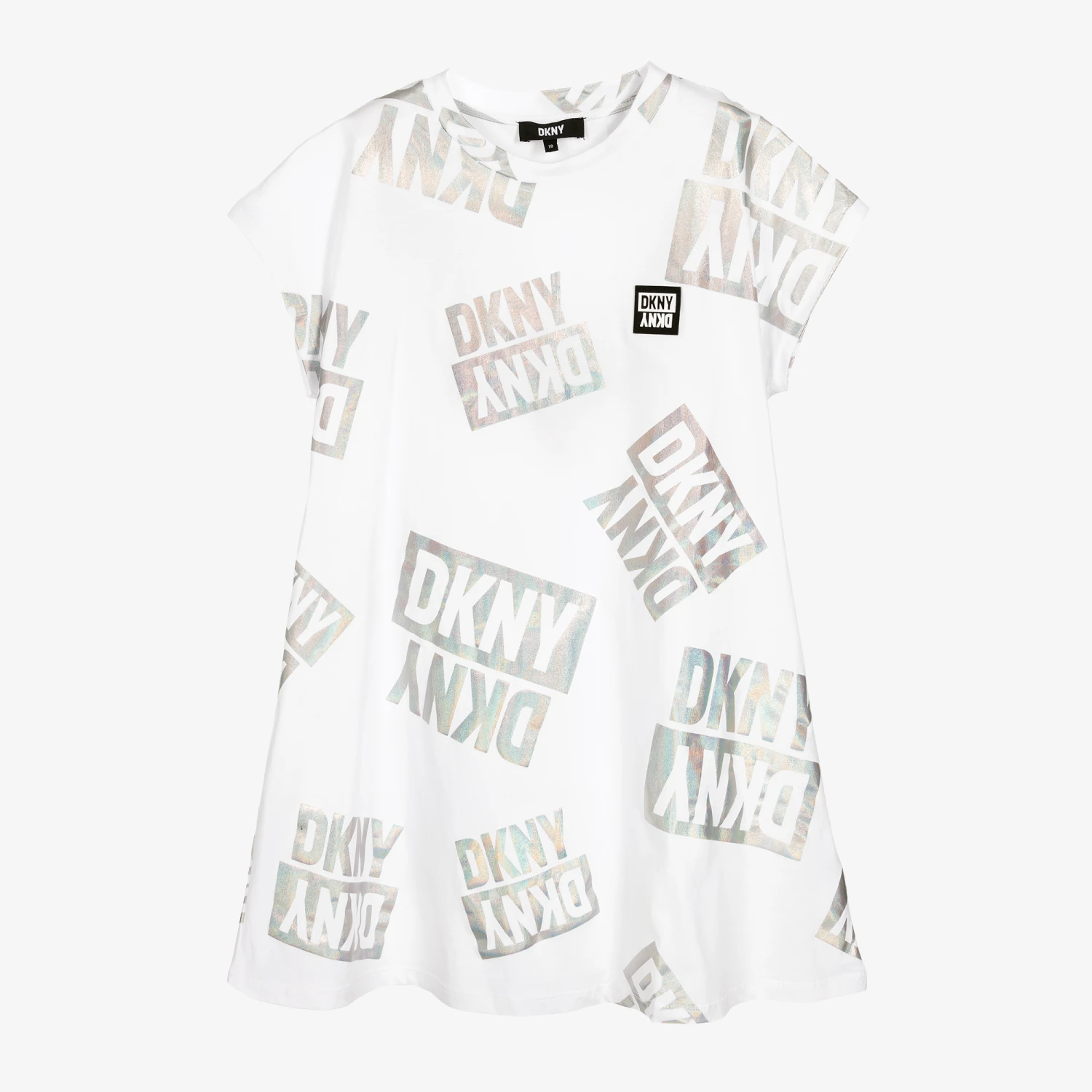 White cotton dress for teen girls by DKNY, with an all-over logo design in a metallic silver iridescent print. Easy to wear, this casual jersey dress has wide dropped sleeves and a classic crew neck for added comfort. A black and white logo patch can be seen on the chest for a distinctive designer detail.